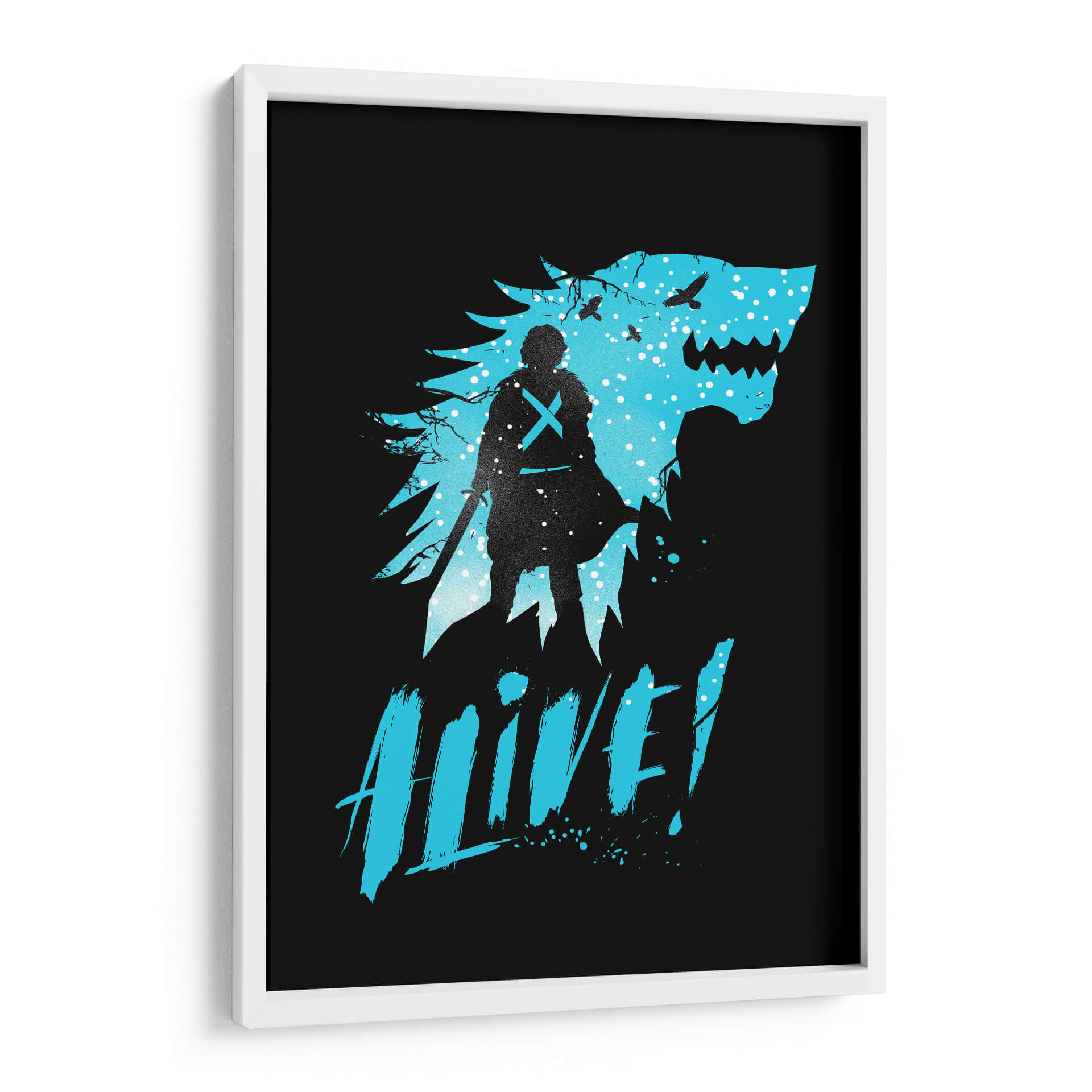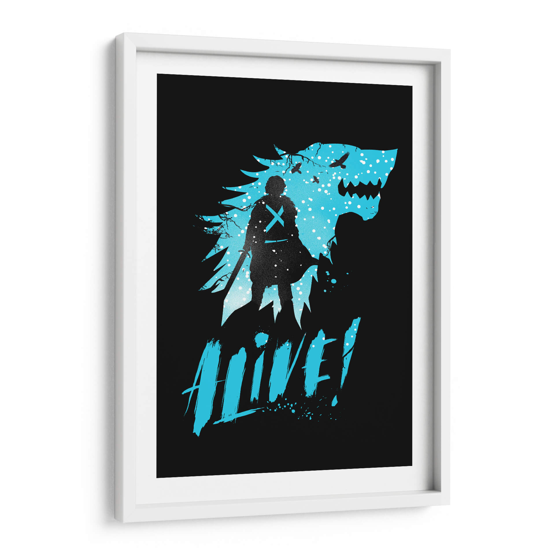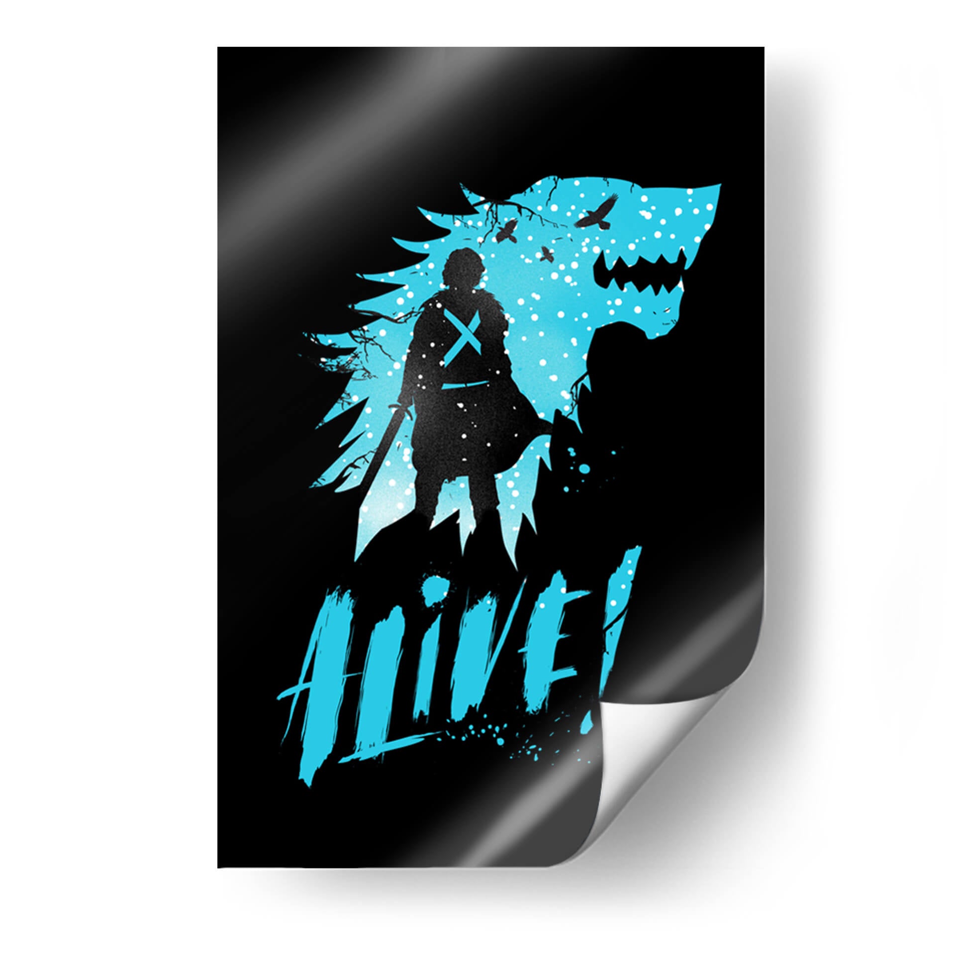 Sumérgete en la intensidad y el misterio con el cuadro decorativo 'Alive Jon Snow'. Esta obra de arte digital, creada por 2ToastDesign, presenta una silueta impactante de un guerrero solitario de pie frente a un lobo estilizado, todo sobre un fondo negro profundo salpicado de toques de azul vibrante y nieve. La figura central, con una capa y una espada, evoca una sensación de determinación y resiliencia, mientras que la silueta del lobo añade un aura de poder y lealtad. El estilo minimalista y gráfico, junto con la audaz paleta de colores azul eléctrico y negro, crea un contraste dinámico que captura la mirada. La nieve sutil y las siluetas de pájaros en vuelo añaden una capa de atmósfera y narrativa, sugiriendo una historia de supervivencia y fuerza en un entorno desafiante. Este cuadro decorativo es perfecto para añadir un toque de carácter y conversación a cualquier espacio, ya sea una sala de estar moderna, un estudio o una oficina. Su diseño gráfico contemporáneo y su temática evocadora lo convierten en una elección ideal para los amantes del arte con un gusto por lo dramático y lo inspirador. Transforma tu pared en un lienzo de historias con esta pieza única que resuena con espíritu indomable.