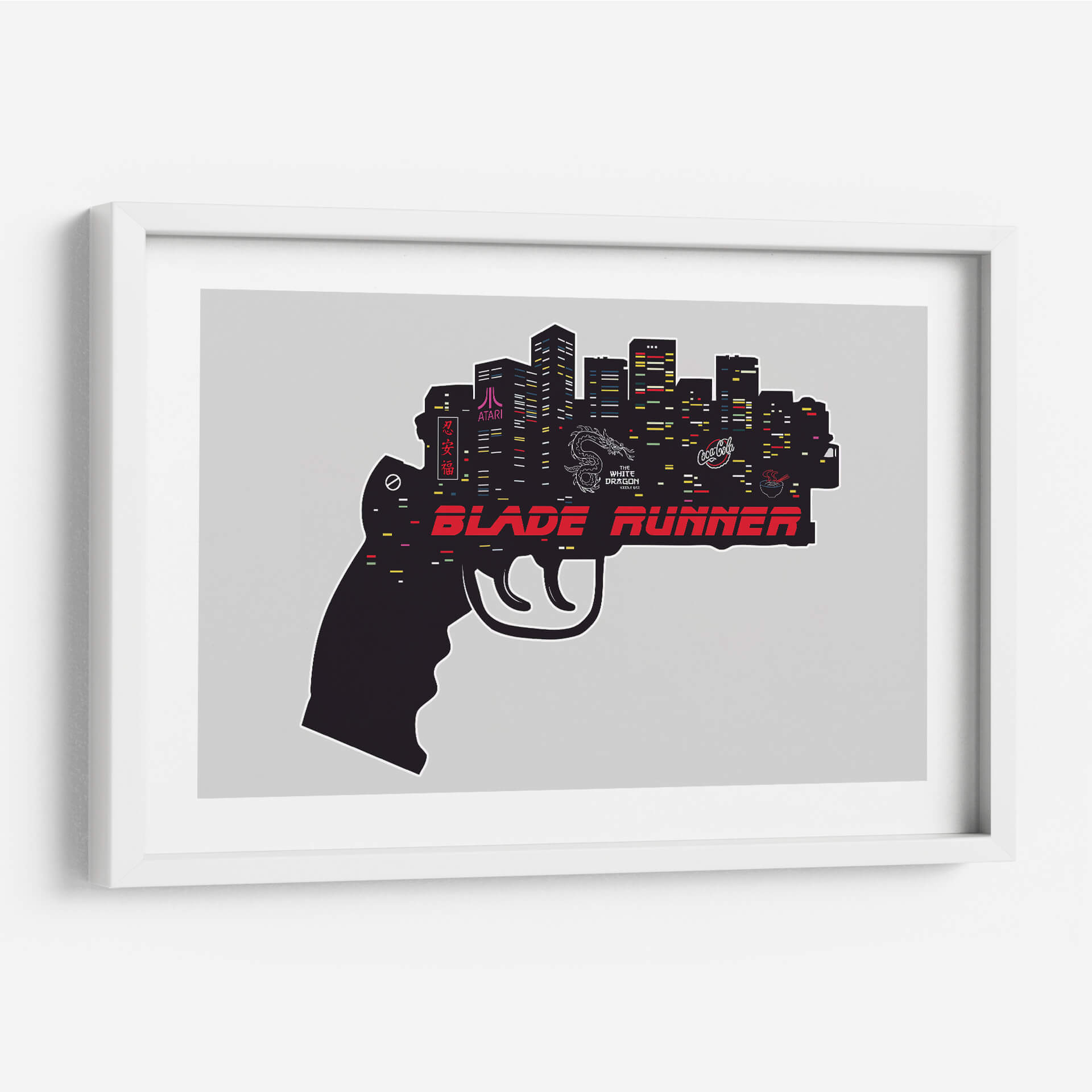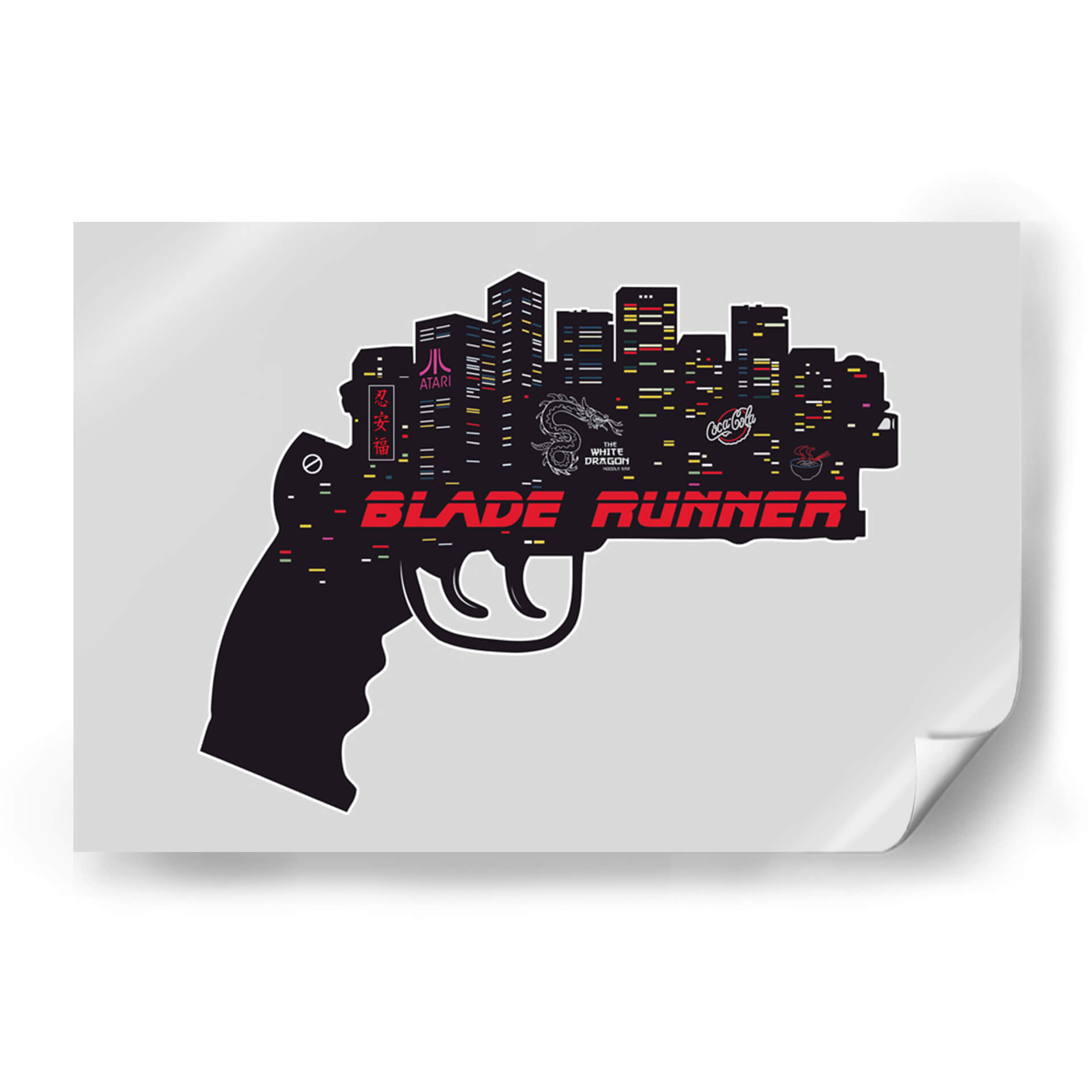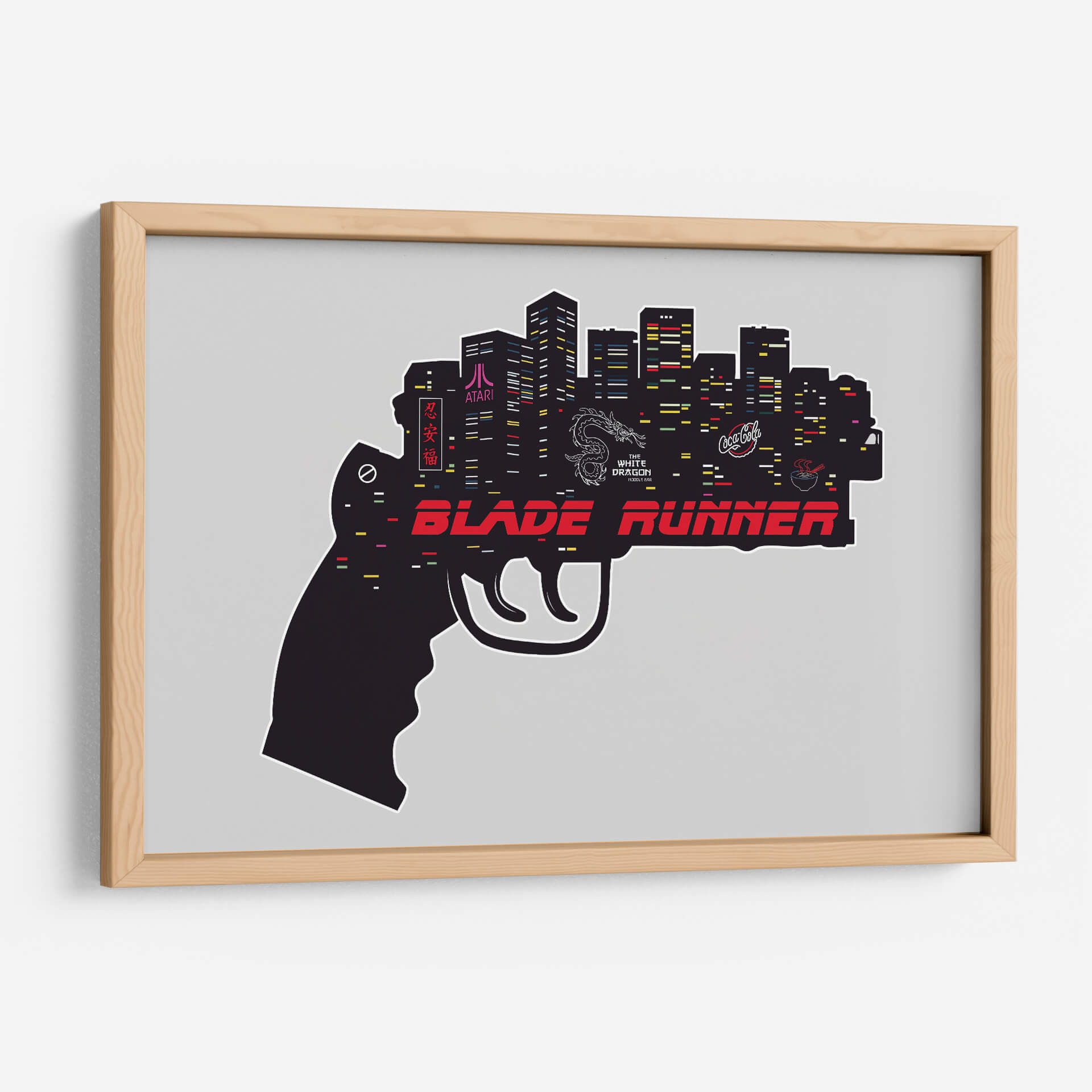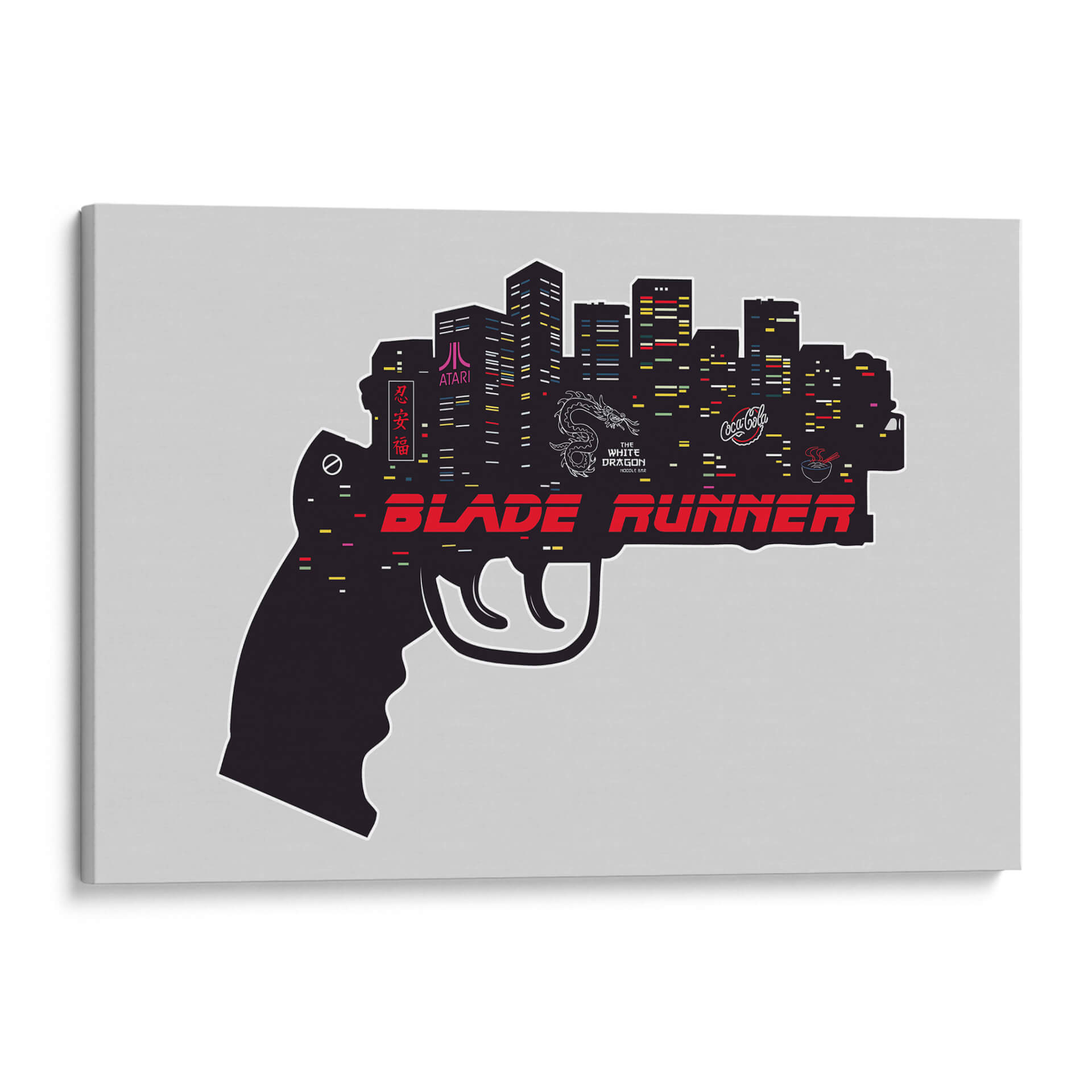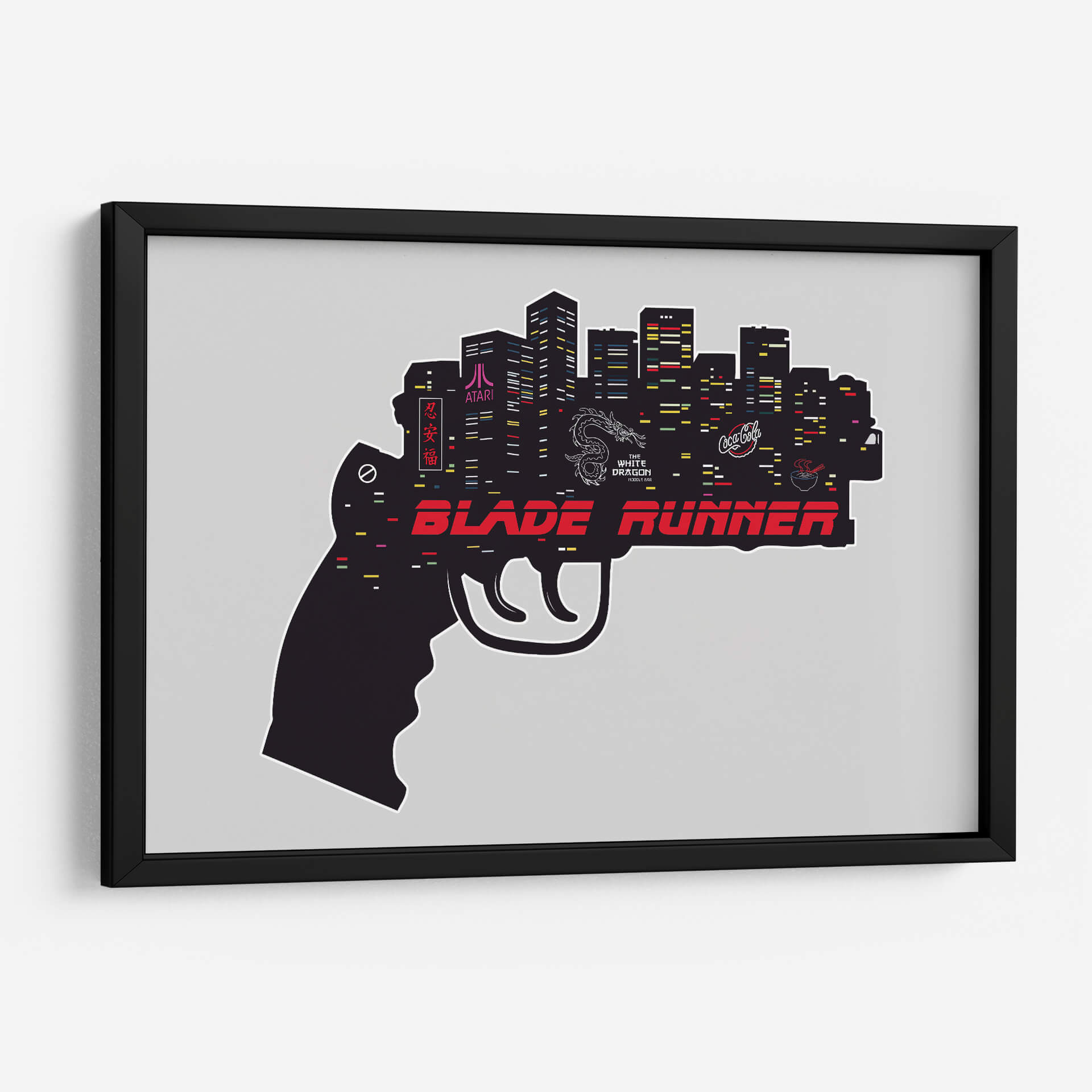 Sumérgete en el universo distópico y fascinante de "Blade Runner" con este impactante cuadro decorativo. La obra captura la icónica silueta de una pistola, que de forma ingeniosa se transforma en un horizonte urbano nocturno, evocando la atmósfera ciberpunk de la película. Los rascacielos, representados con líneas sencillas y bloques de color, están salpicados de luces parpadeantes que simulan la vida en una metrópolis futurista. Los icónicos logotipos de marcas como Atari, Coca-Cola y The White Dragon Noodle Bar añaden capas de nostalgia y comentario social, fusionando elementos de la cultura pop con la estética cinematográfica. La paleta de colores se centra en el contraste entre el negro profundo de la pistola y los detalles vibrantes de las luces, creando un diseño gráfico audaz y moderno. Este cuadro decorativo es perfecto para los amantes del cine de ciencia ficción y para aquellos que buscan una pieza de arte que provoque conversación y añada un toque de misterio y sofisticación a su sala de estar, estudio u oficina.
