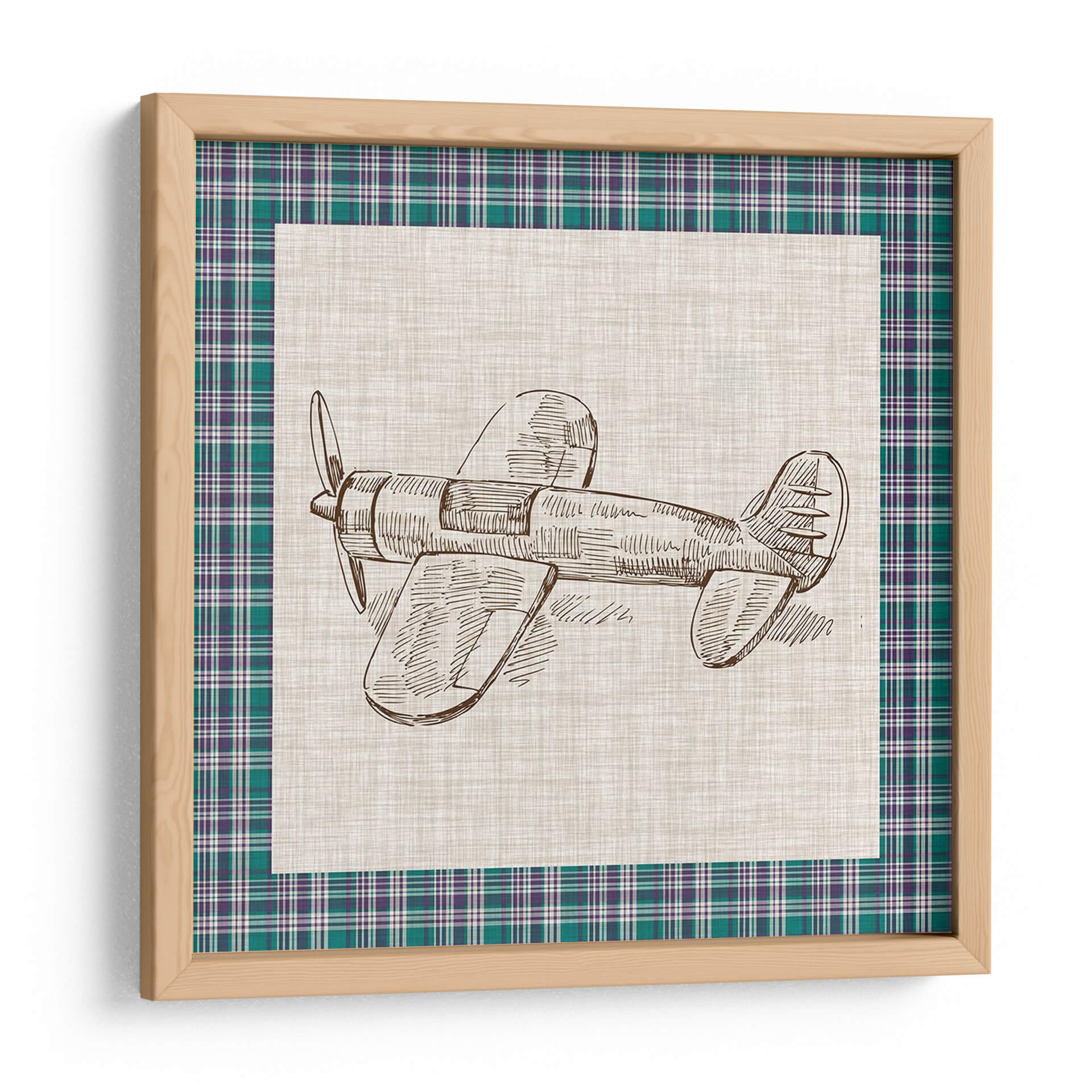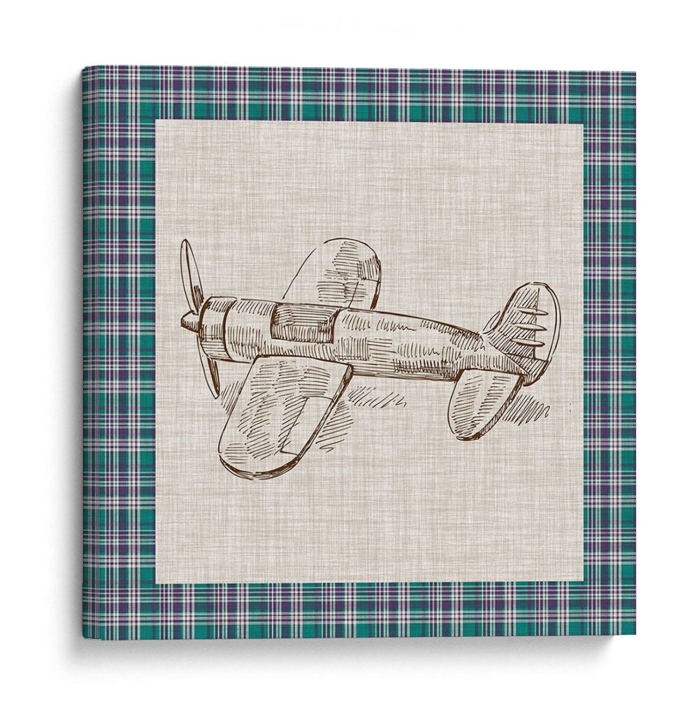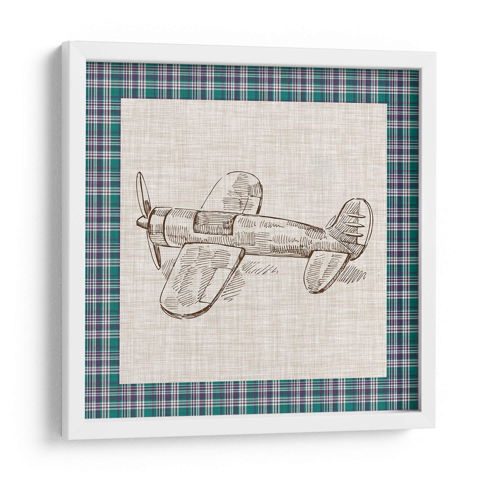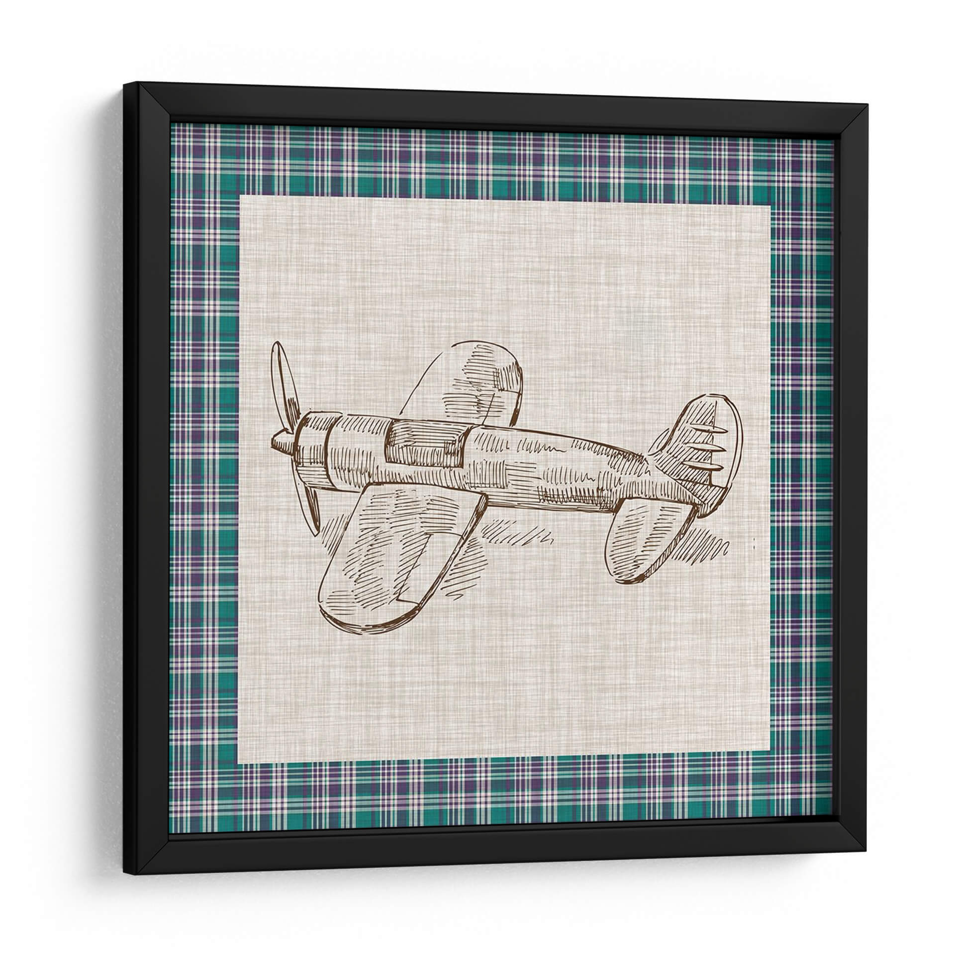 Este encantador cuadro decorativo, titulado "Juguetes Retro IV" por Vision Studio, captura la nostalgia de la aviación a través de un delicado boceto a mano alzada de un avión clásico. La obra presenta un detallado dibujo lineal en tonos sepia sobre un fondo de textura rústica, enmarcado por un borde de tartán en verde esmeralda y morado, que añade un toque de color y sofisticación. La simplicidad del diseño, centrada en la forma icónica del avión, evoca una sensación de aventura, libertad y un viaje al pasado. Es una pieza perfecta para añadir un aire vintage y un toque de personalidad a cualquier espacio, desde una sala de estar moderna hasta una oficina o incluso una habitación infantil. Su estilo atemporal y su paleta de colores sutil lo convierten en un complemento versátil para diversas decoraciones, aportando un punto de interés visual sin abrumar el ambiente. Ideal para aquellos que aprecian el diseño retro y el arte con un toque de historia.