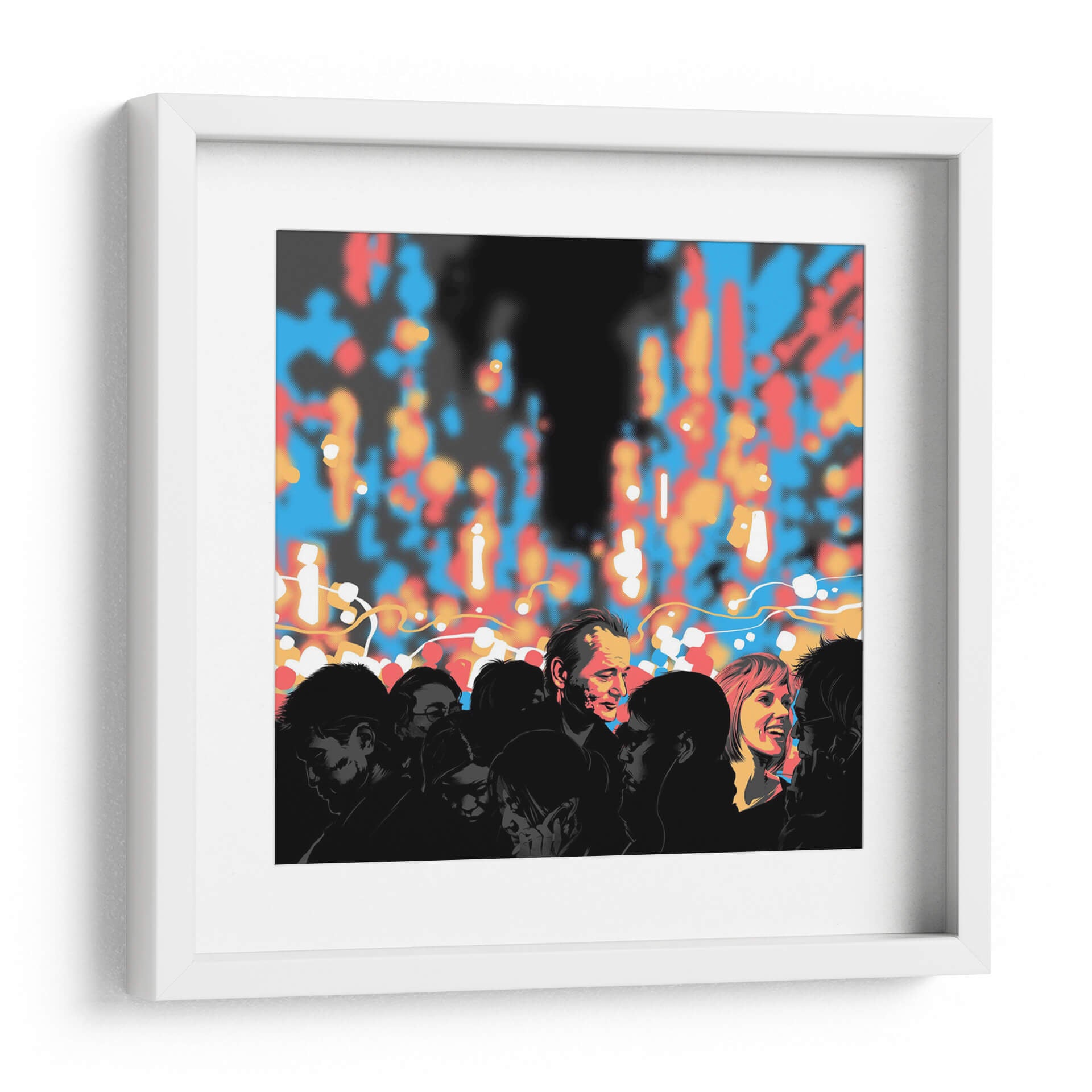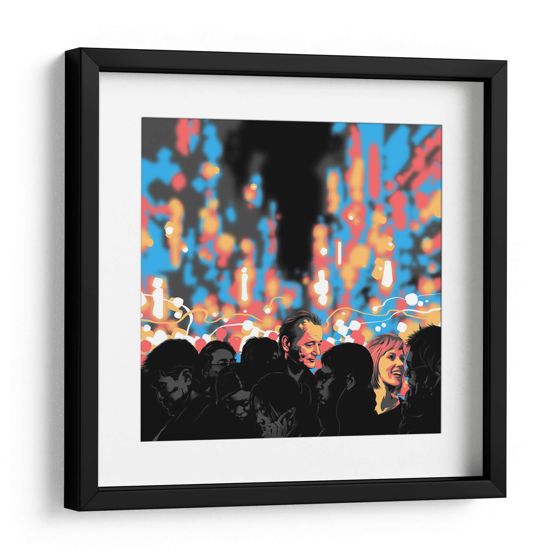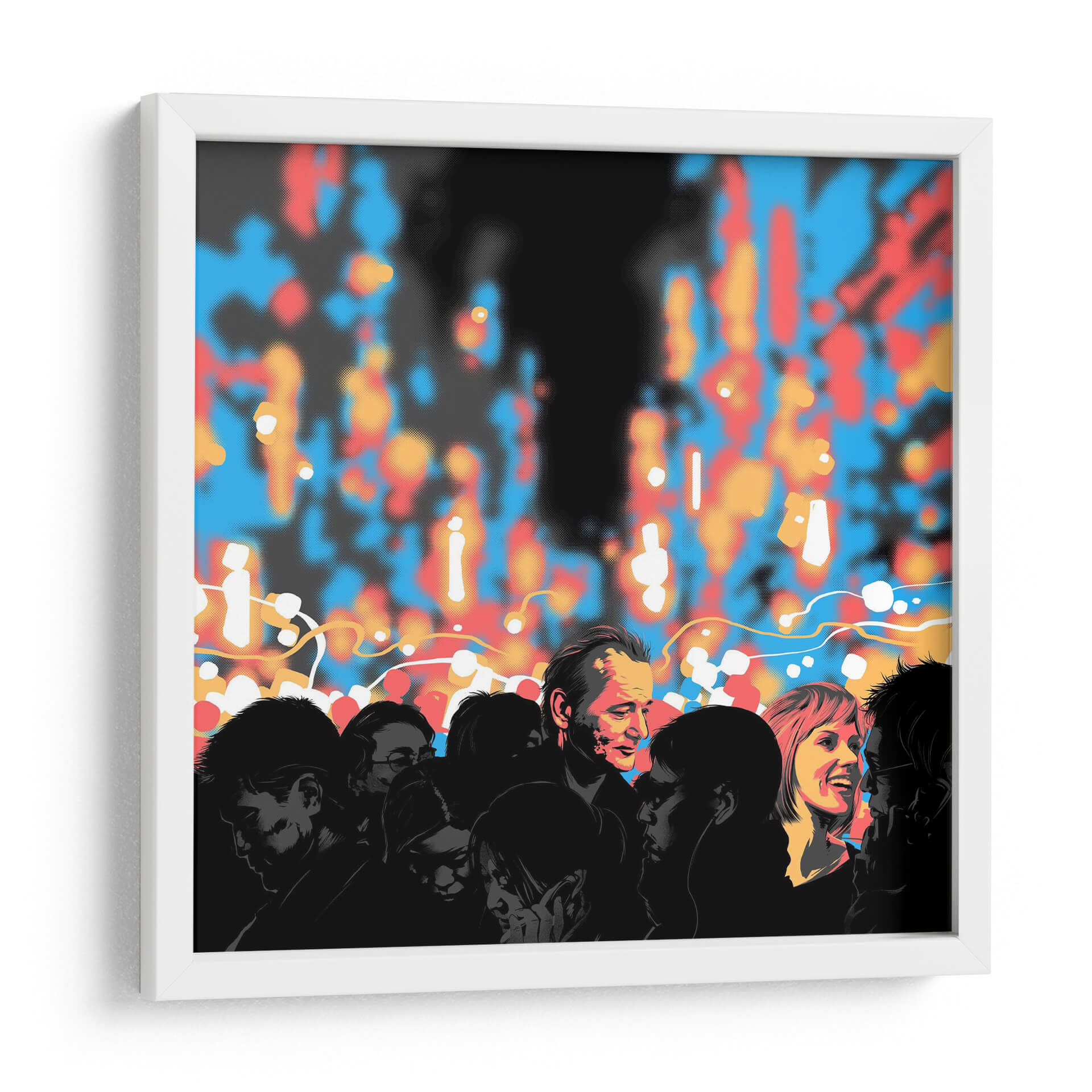Sumérgete en la complejidad de las interacciones humanas con "Lost in Translation", una obra de arte contemporáneo que captura la esencia de la comunicación y la conexión. La pieza presenta un grupo de siluetas oscuras de personas, cuyas expresiones y posturas insinúan una narrativa personal y colectiva. En contraste, un fondo vibrante de luces difuminadas en tonos azules, rojos y naranjas crea una atmósfera urbana o festiva, sugiriendo el bullicio de una ciudad o un evento social. El juego de luces y sombras, junto con la paleta de colores audaz, genera una sensación de misterio y dinamismo. El estilo gráfico y el uso de puntos para simular el desenfoque aportan una modernidad distintiva a la composición. Este cuadro decorativo es ideal para espacios que buscan un punto focal intrigante y contemporáneo, como salas de estar, estudios o incluso oficinas modernas. "Lost in Translation" invita a la reflexión sobre las barreras y puentes en la comunicación, convirtiéndose en una pieza de conversación que aportará profundidad y estilo a tu decoración.