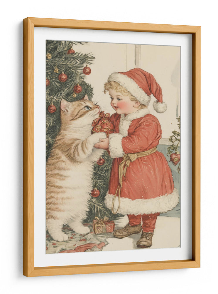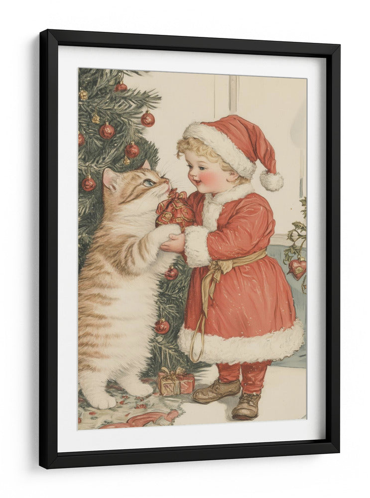 Captura la magia de la temporada navideña con nuestro encantador cuadro decorativo "Niño y gato de Navidad". Esta obra de arte evoca la inocencia y la alegría de la infancia, presentando a un tierno niño vestido con un traje de Santa Claus, interactuando dulcemente con un adorable gato junto a un árbol de Navidad decorado. La paleta de colores cálidos, dominada por los rojos festivos y los tonos tierra del pelaje del gato, crea una atmósfera acogedora y nostálgica, perfecta para añadir un toque de espíritu navideño a cualquier rincón de tu hogar. El estilo clásico de la ilustración, con sus delicados trazos y atención al detalle, transporta a un tiempo de tradiciones y momentos especiales. Este cuadro es ideal para decorar salas de estar, dormitorios infantiles o cualquier espacio que desees llenar de calidez y encanto durante las fiestas. Su composición centrada en la tierna interacción entre el niño y el felino lo convierte en un punto focal entrañable que seguramente generará sonrisas y recordará los momentos más preciados de la Navidad. Añade esta pieza única a tu colección de arte y revive la ilusión de la Navidad cada día.
