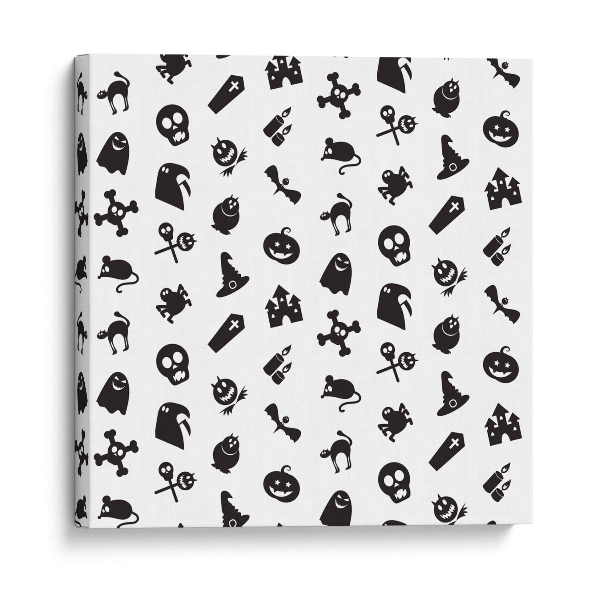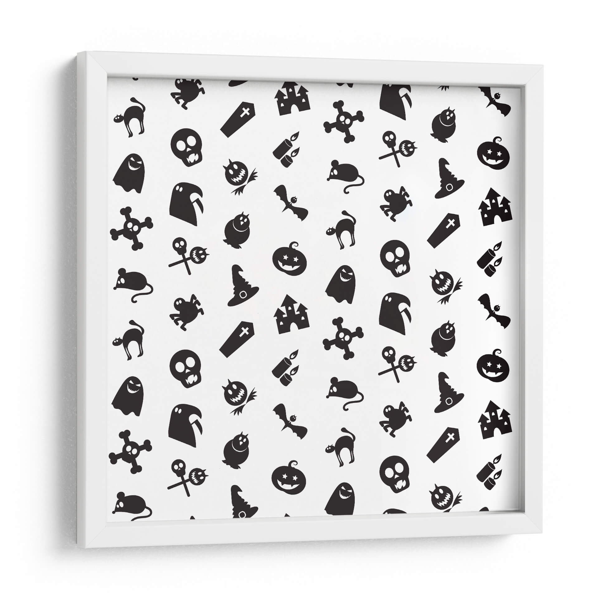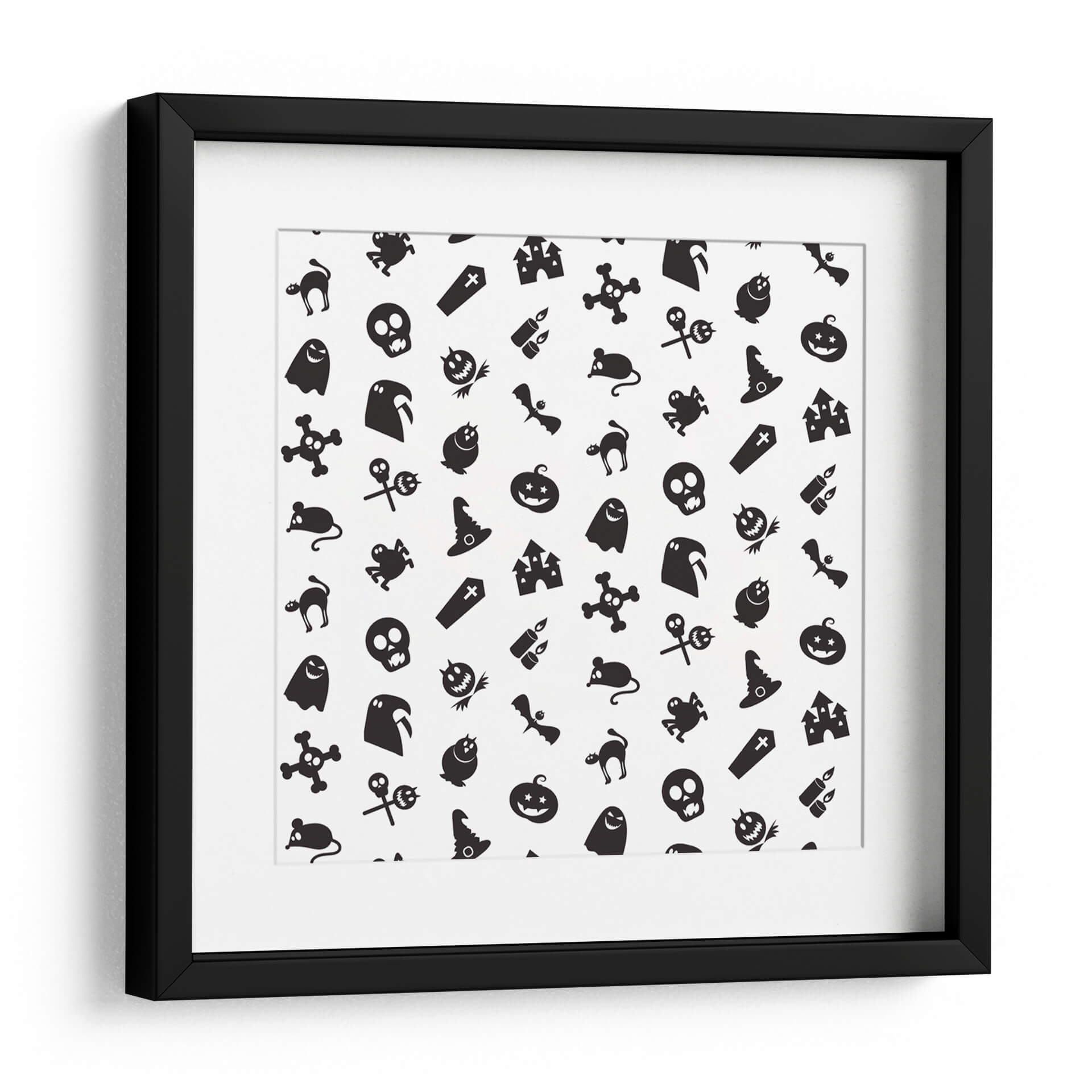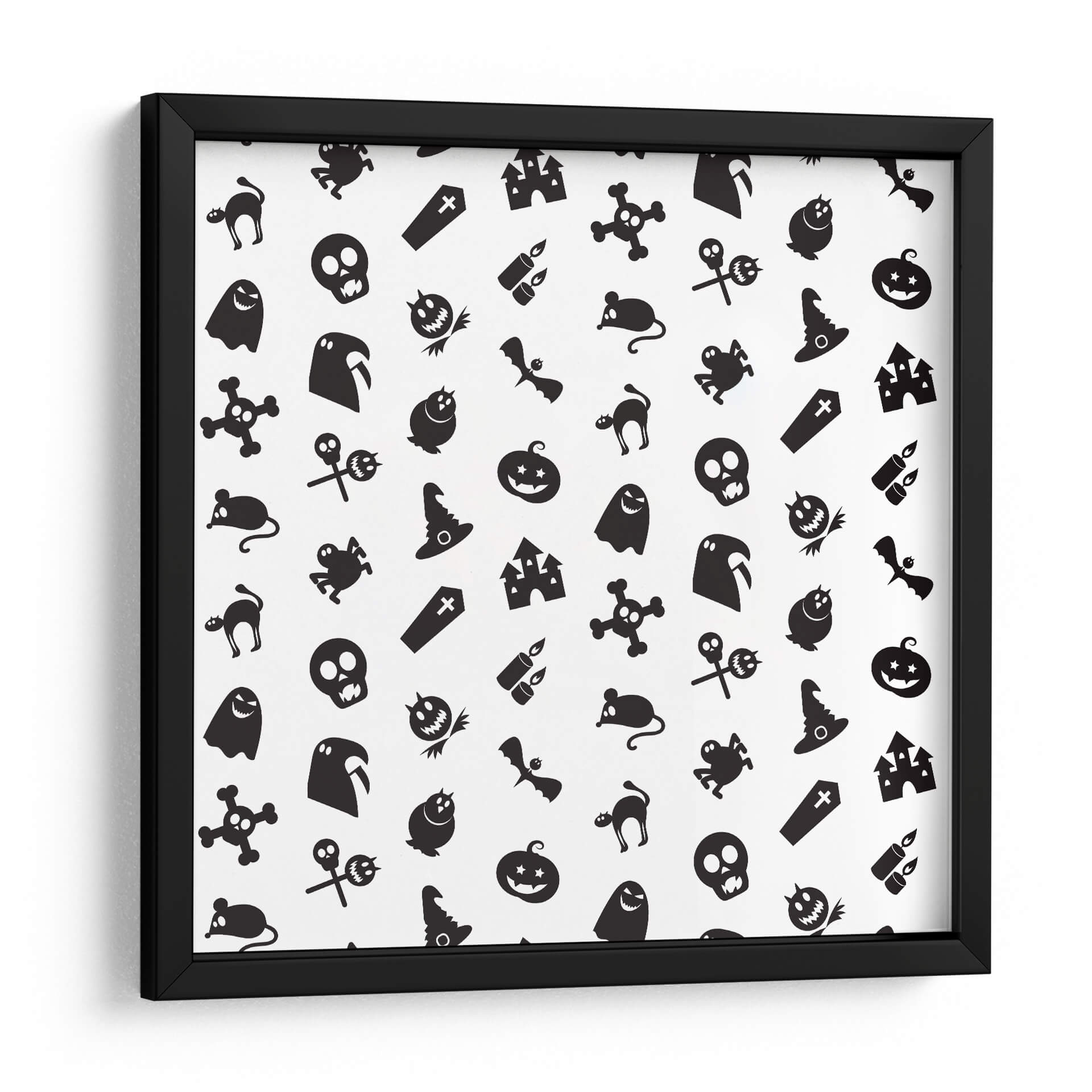 Transforma tu espacio con este cautivador cuadro decorativo que celebra la temporada de Halloween con un diseño juguetón y enigmático. La obra presenta un patrón repetitivo de icónicos símbolos de Halloween, incluyendo fantasmas amigables, calabazas sonrientes, sombreros de bruja, murciélagos, calaveras y castillos embrujados, todos presentados en un audaz contraste de blanco y negro. Esta composición gráfica, con su estética de "pegatina de dibujos animados", irradia un espíritu lúdico y festivo, perfecto para añadir un toque divertido y temático a cualquier habitación. Ideal para salas de estar, dormitorios, o incluso para espacios de oficina que buscan un aire de misterio y celebración. La simplicidad del diseño y la clara iconicidad de sus elementos lo convierten en una pieza versátil que puede complementar una variedad de estilos decorativos, desde el moderno hasta el ecléctico, aportando personalidad y un toque de humor espeluznante. Haz de esta obra el centro de atención en tu decoración de otoño o durante todo el año para los amantes de lo macabro-adorable.