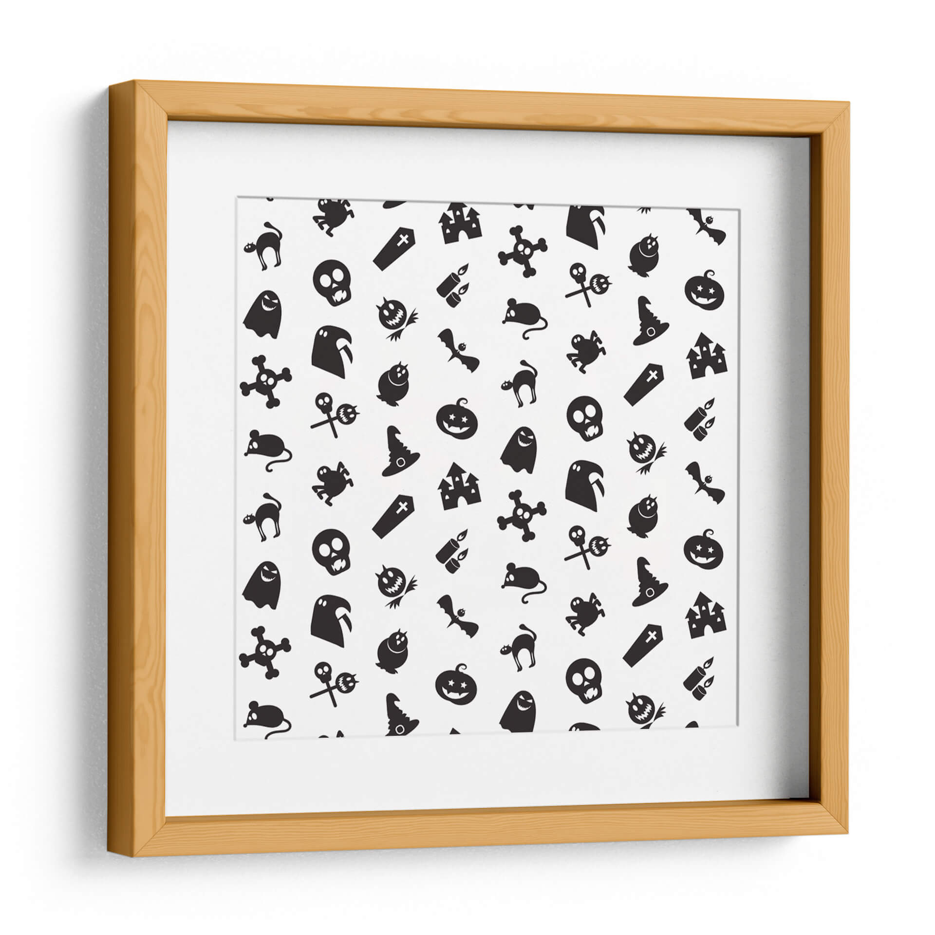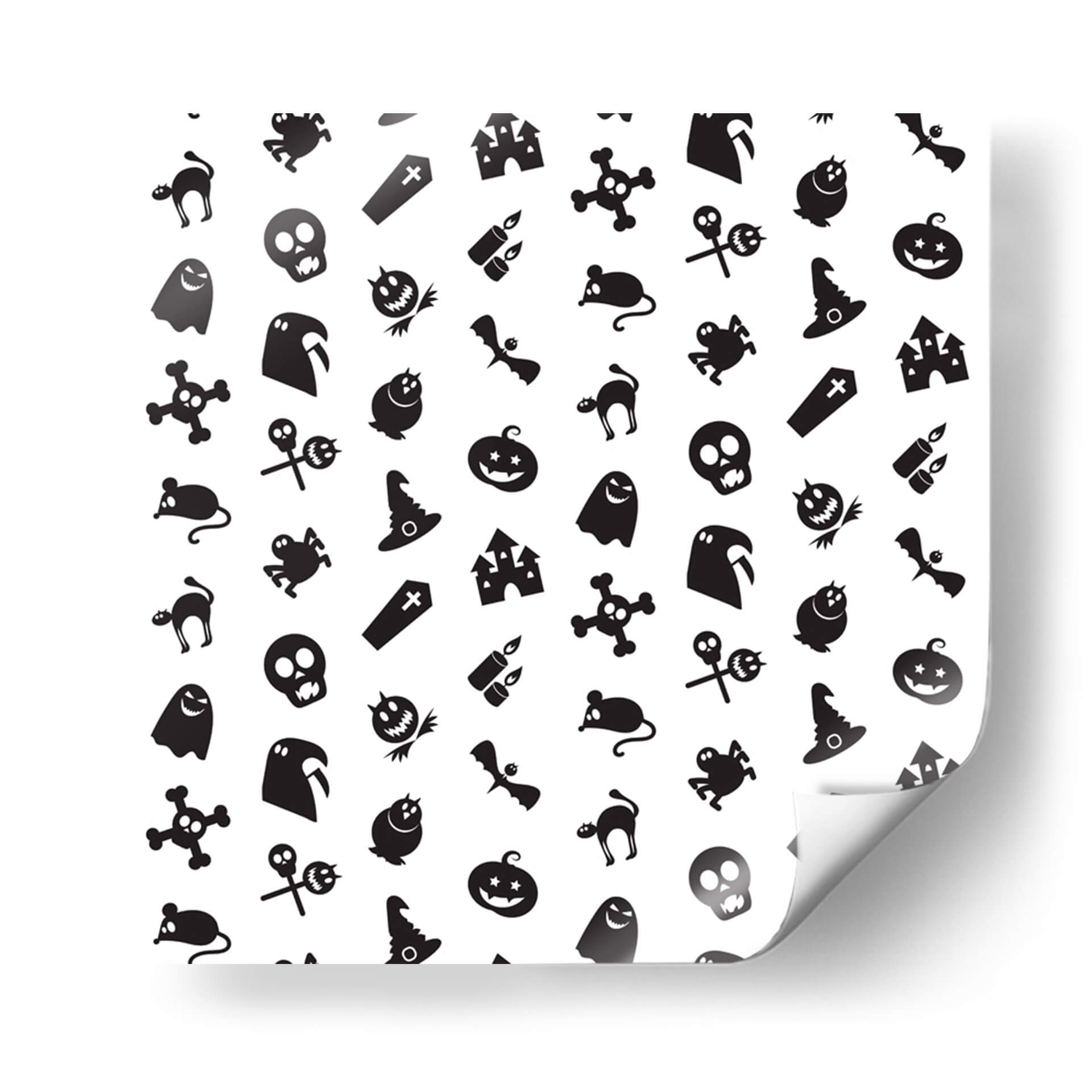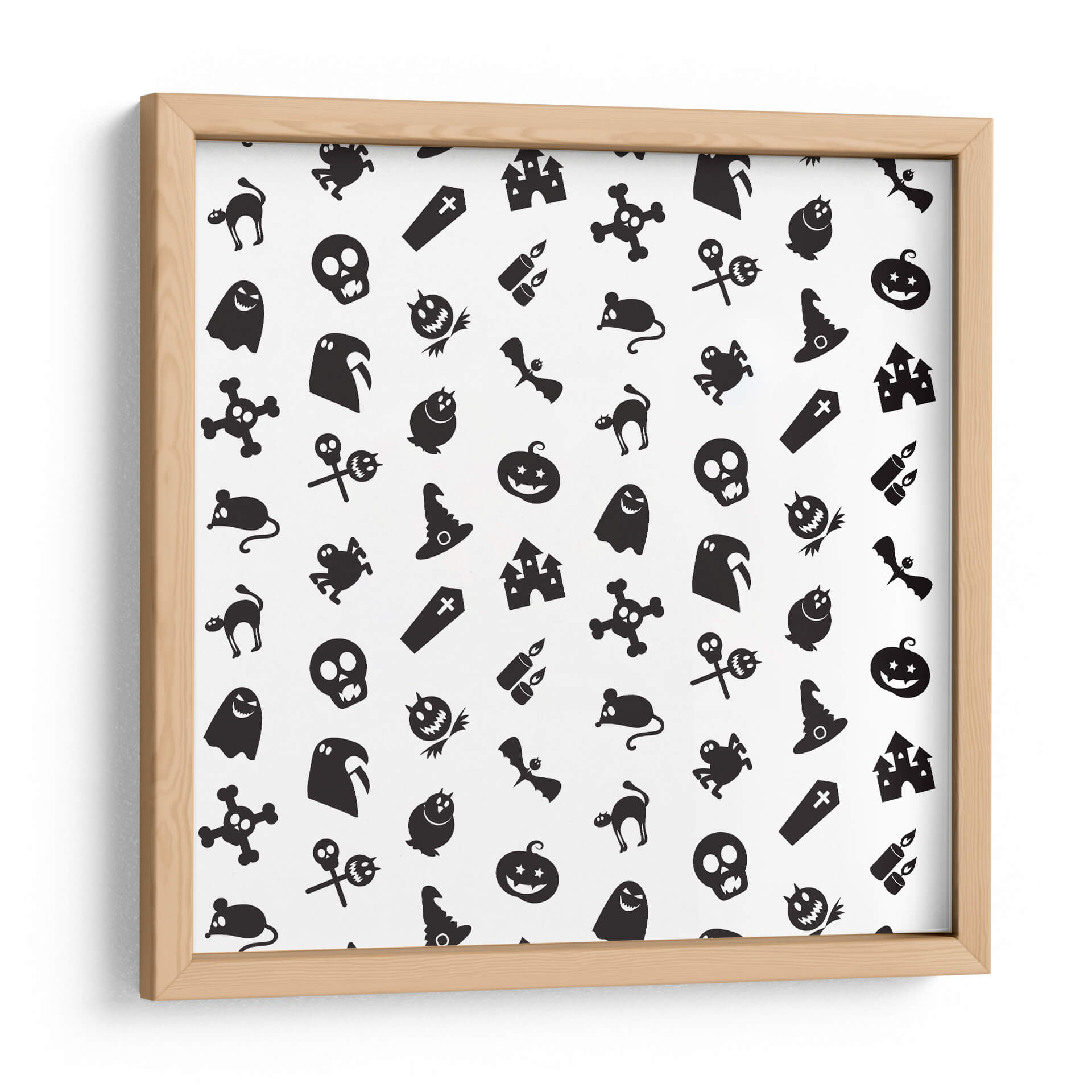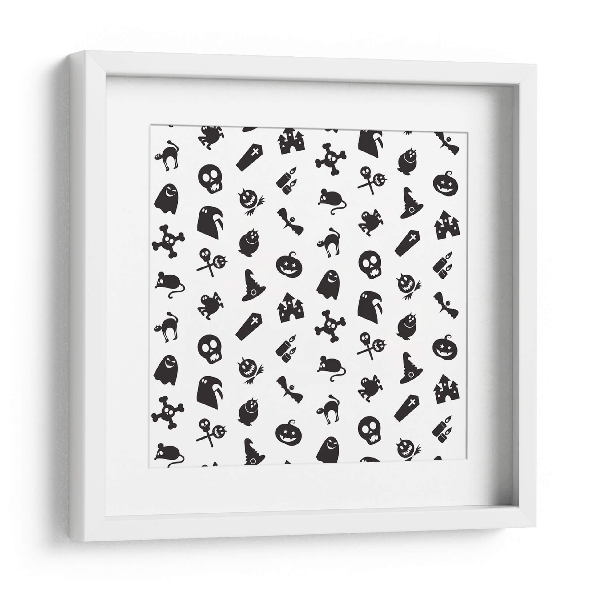 Transforma tu espacio con este cautivador cuadro decorativo que celebra la temporada de Halloween con un diseño juguetón y enigmático. La obra presenta un patrón repetitivo de icónicos símbolos de Halloween, incluyendo fantasmas amigables, calabazas sonrientes, sombreros de bruja, murciélagos, calaveras y castillos embrujados, todos presentados en un audaz contraste de blanco y negro. Esta composición gráfica, con su estética de "pegatina de dibujos animados", irradia un espíritu lúdico y festivo, perfecto para añadir un toque divertido y temático a cualquier habitación. Ideal para salas de estar, dormitorios, o incluso para espacios de oficina que buscan un aire de misterio y celebración. La simplicidad del diseño y la clara iconicidad de sus elementos lo convierten en una pieza versátil que puede complementar una variedad de estilos decorativos, desde el moderno hasta el ecléctico, aportando personalidad y un toque de humor espeluznante. Haz de esta obra el centro de atención en tu decoración de otoño o durante todo el año para los amantes de lo macabro-adorable.