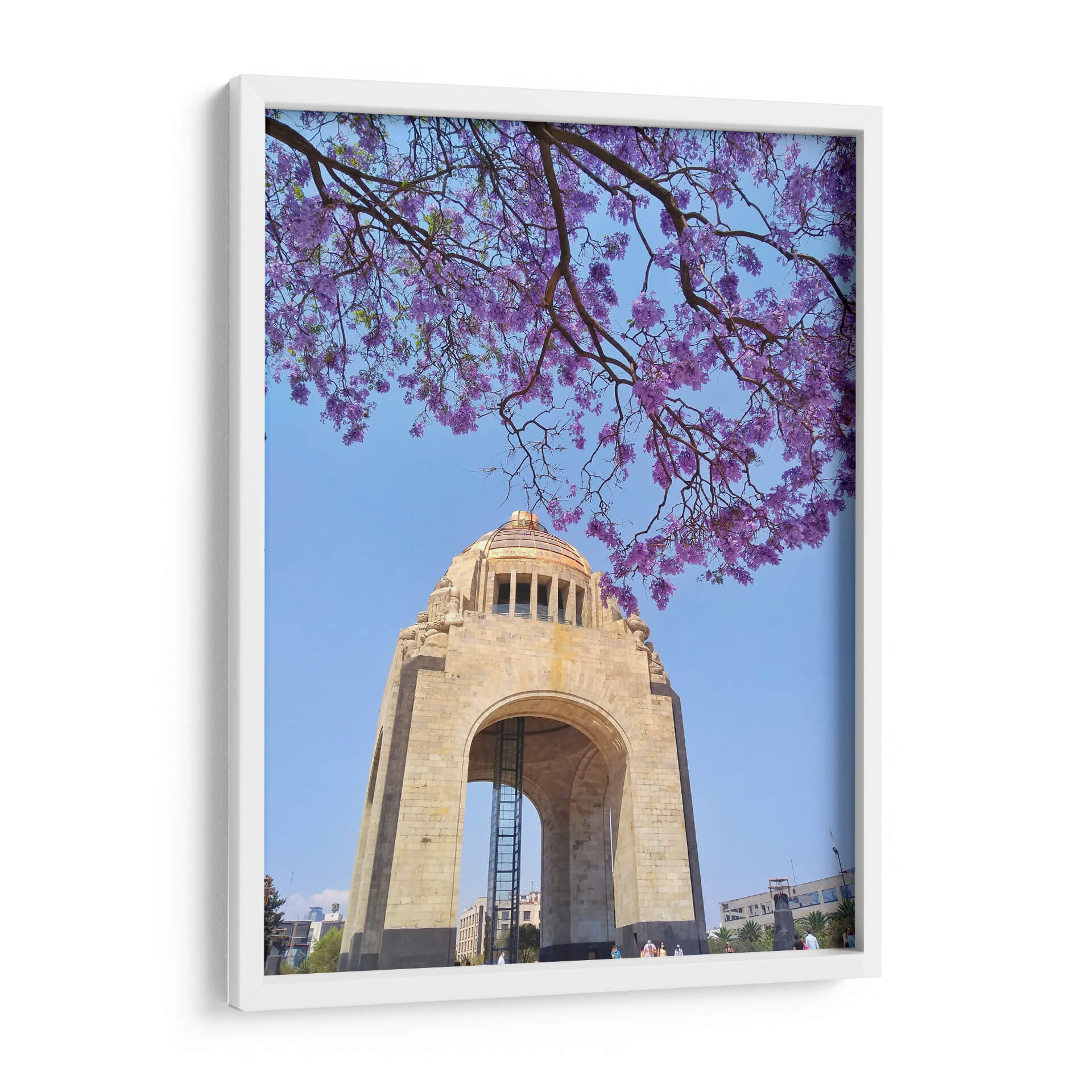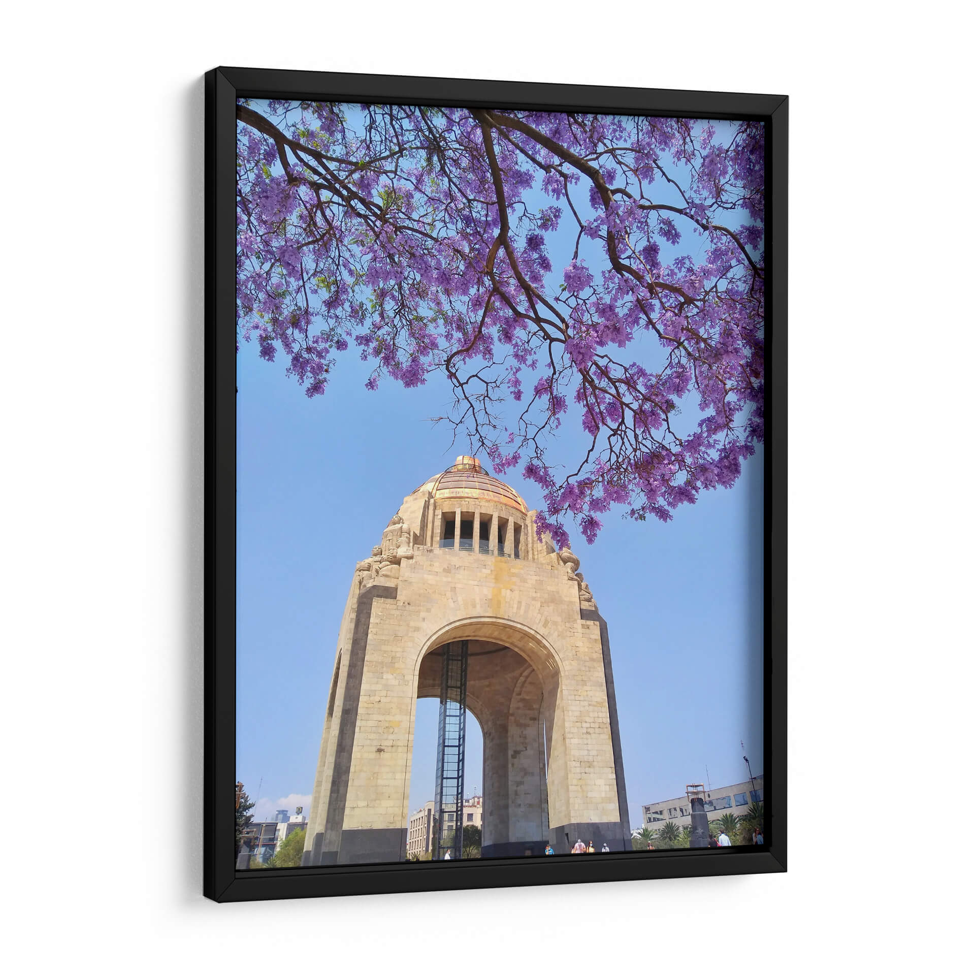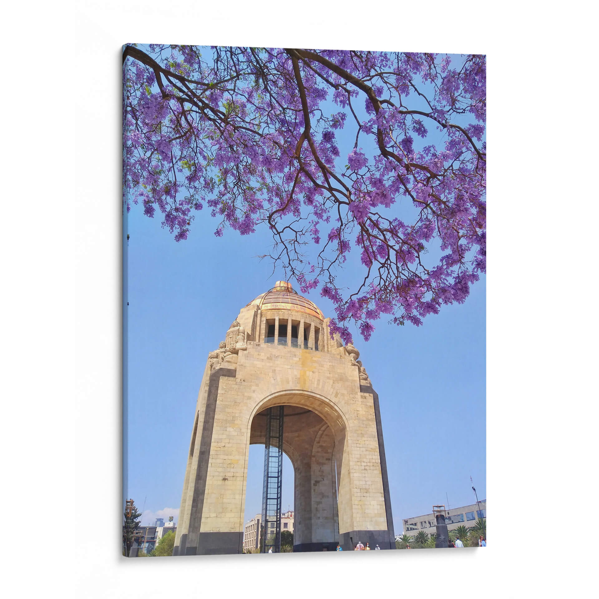 Captura la esencia de la primavera y la monumentalidad arquitectónica con este evocador cuadro decorativo titulado 'Púrpura', obra del artista Hugo Segura. La pieza presenta una imponente estructura de piedra, reminiscentes de un arco triunfal o monumento histórico, bajo un cielo azul despejado y vibrante. Dramáticamente, ramas de jacaranda cargadas de flores púrpura intensa se extienden desde la parte superior, creando un contraste cautivador entre la solidez de la arquitectura y la delicadeza efímera de la naturaleza en flor. Los tonos cálidos de la piedra se complementan con el azul profundo del cielo y la explosión de color púrpura, generando una atmósfera de serenidad y belleza primaveral. Este cuadro decorativo es ideal para añadir un toque de color y sofisticación a cualquier espacio. Su composición equilibrada entre la arquitectura clásica y la exuberancia floral lo convierte en una pieza focal perfecta para salones modernos, estudios o recibidores, invitando a la contemplación y al disfrute de la belleza en su máxima expresión, y evocando la sensación de un momento capturado en el tiempo.