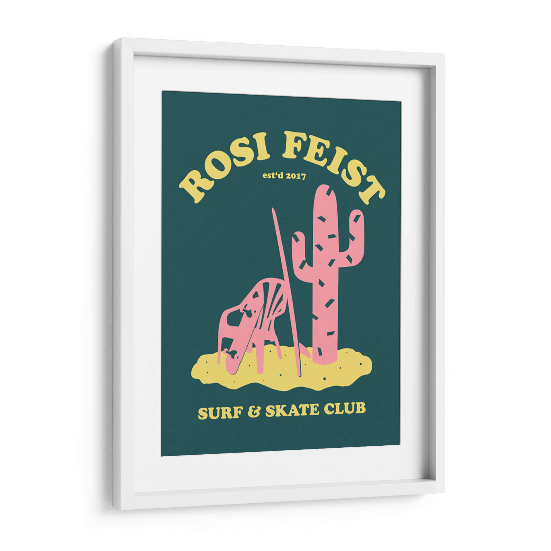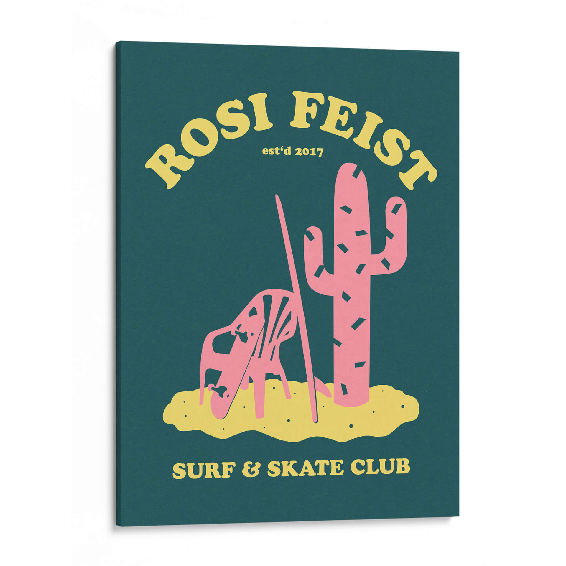 Sumérgete en la vibrante y nostálgica atmósfera del 'Rosi Feist Surf & Skate Club', una obra de arte decorativa que evoca la energía despreocupada del verano y la cultura juvenil. Este cuadro presenta una audaz paleta de colores con un profundo tono azul verdoso de fondo, contrastado por un cactus rosa estilizado y una silla solitaria, ambos elementos destacados con un vibrante amarillo ocre. La composición gráfica, con sus líneas limpias y formas simplificadas, evoca un estilo retro y moderno a la vez, perfecto para añadir un toque de personalidad a cualquier espacio. La frase "SURF & SKATE CLUB" y "est'd 2017" añaden un toque de identidad y pertenencia, sugiriendo una comunidad o un estilo de vida. Ideal para salas de estar, estudios, dormitorios o cualquier área donde busques inyectar dinamismo y un aire de aventura. Este cuadro decorativo es una pieza que invita a la conversación y captura la esencia de la diversión y la libertad.