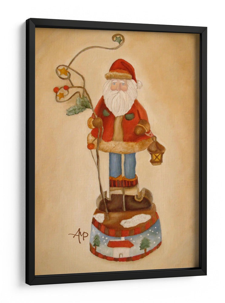 Infundir calidez y un toque de nostalgia en tu hogar con este encantador cuadro decorativo 'Santa Llegó' de Angeles M. Pomata. La obra presenta una representación estilizada y tierna de Santa Claus, vestido con su icónico traje rojo y portando una linterna y una rama adornada con bayas y estrellas. La paleta de colores se centra en tonos cálidos y terrosos, con acentos de rojo vibrante y azul, creando una atmósfera acogedora y festiva. El fondo suave y texturizado complementa la figura central, que parece estar parada sobre una base decorada con casitas y árboles nevados, evocando la magia de la temporada invernal y las celebraciones. El estilo de pintura es sutilmente rústico y artesanal, transmitiendo una sensación de tradición y sencillez. Este cuadro es ideal para añadir un punto focal encantador a una sala de estar durante las fiestas, o para dar un toque de alegría y espíritu navideño a un espacio durante todo el año. Su diseño único y emotivo lo convierte en una pieza de conversación perfecta para quienes buscan arte con personalidad y una conexión emocional, ideal para espacios que buscan una decoración de pared con carácter y un aire de cuento.