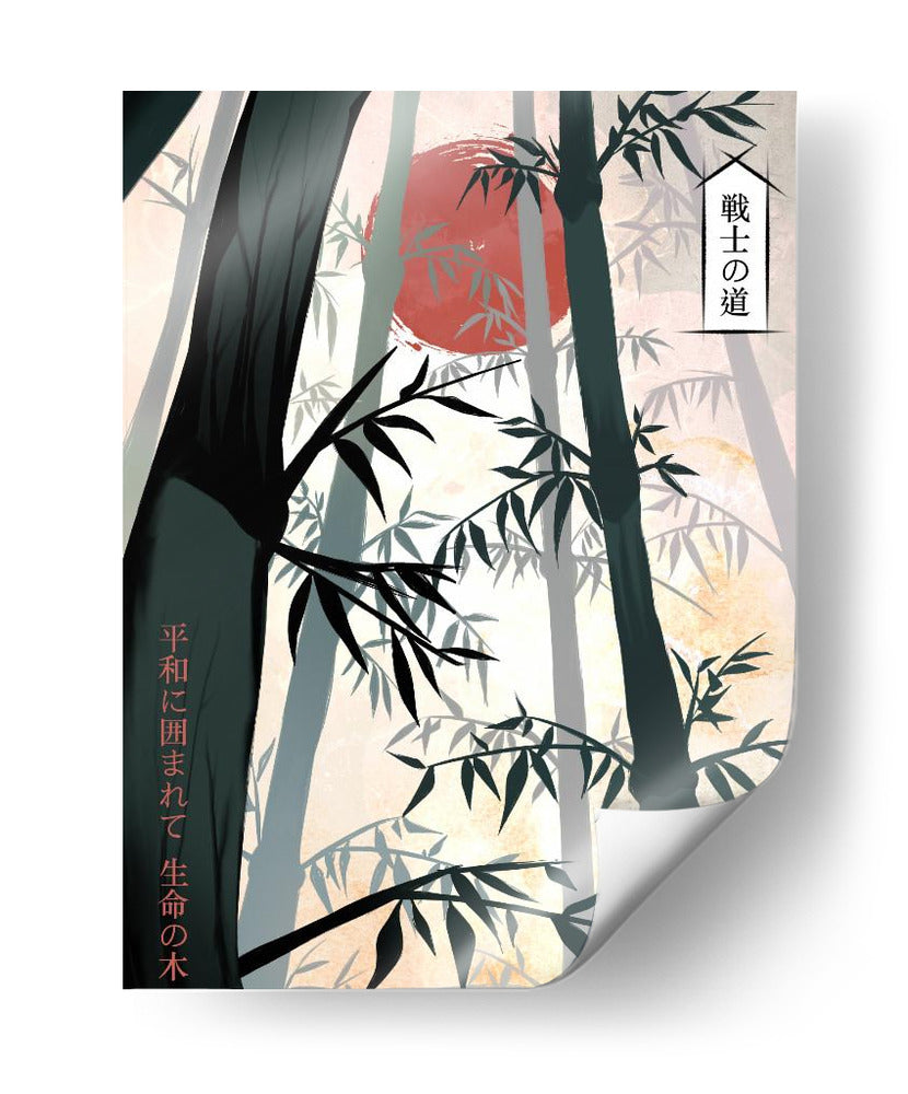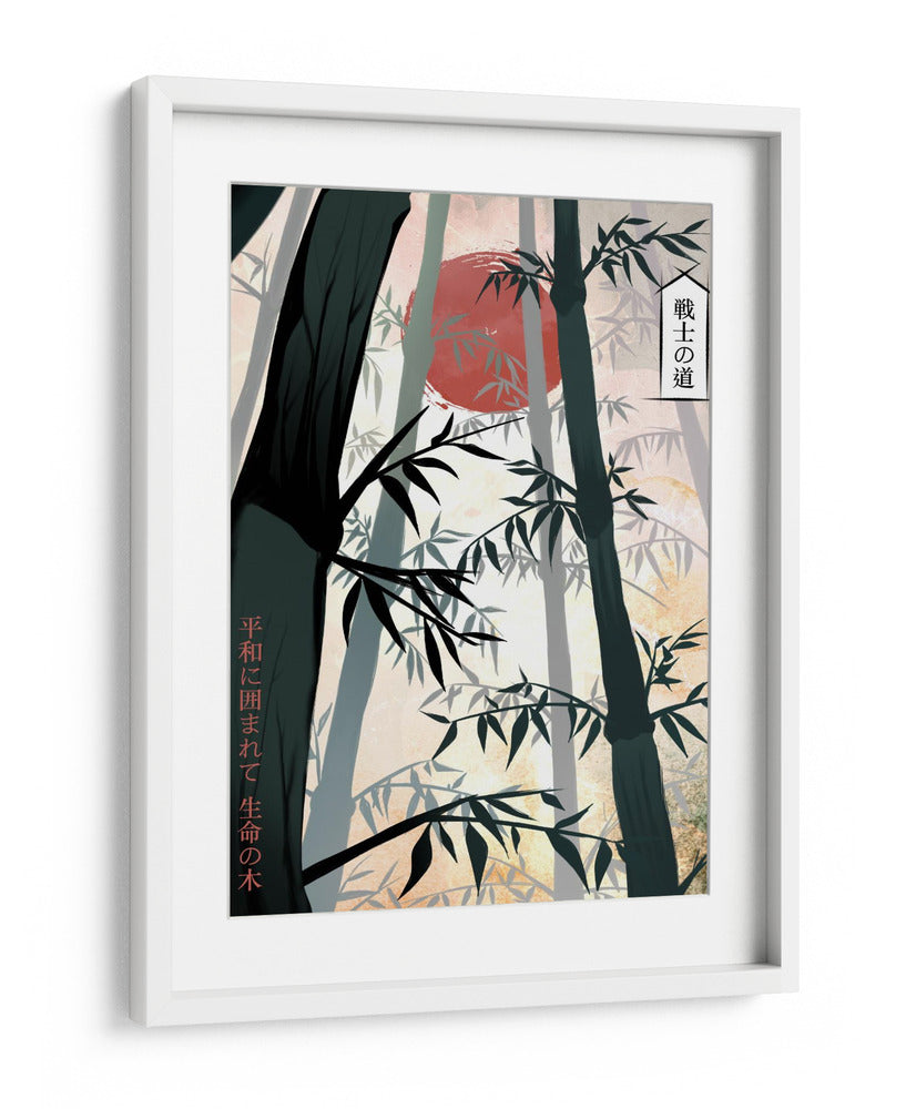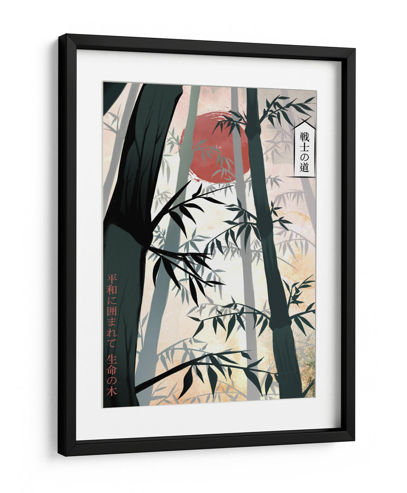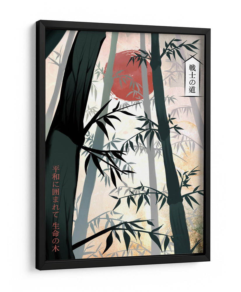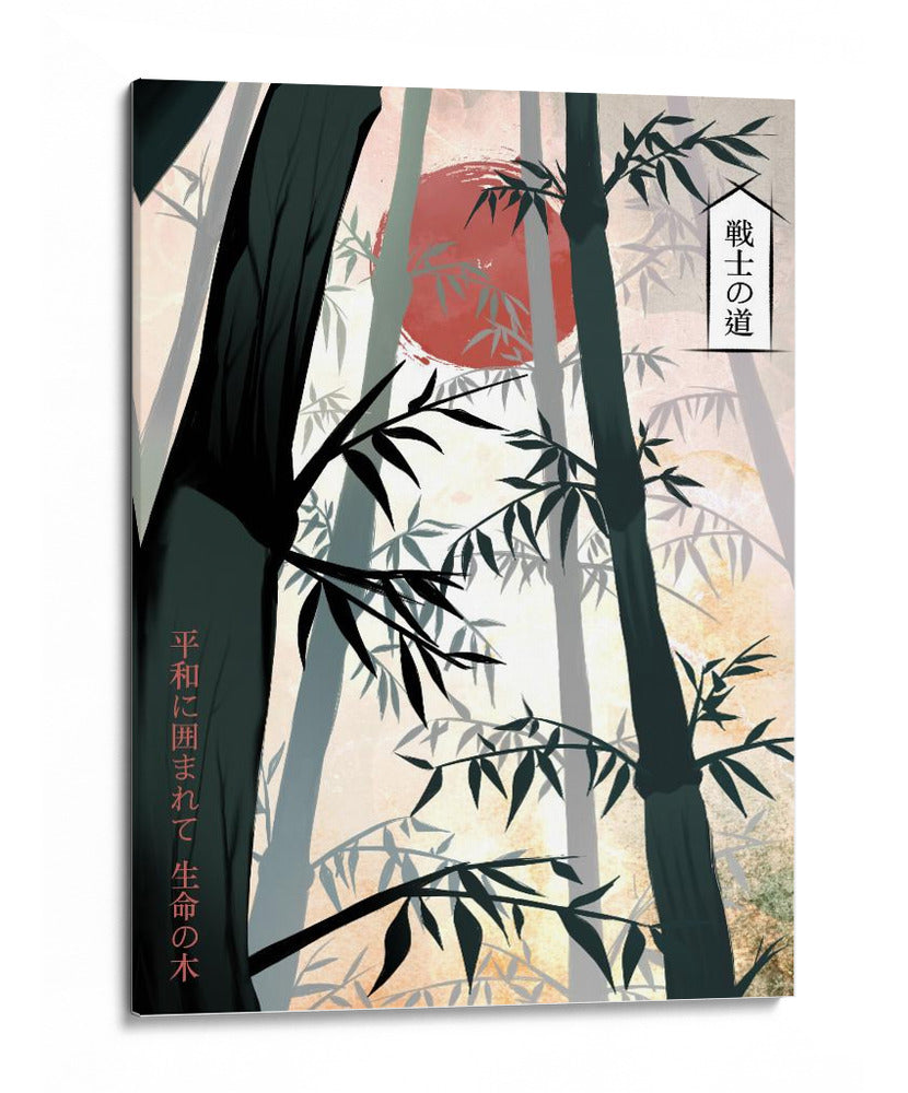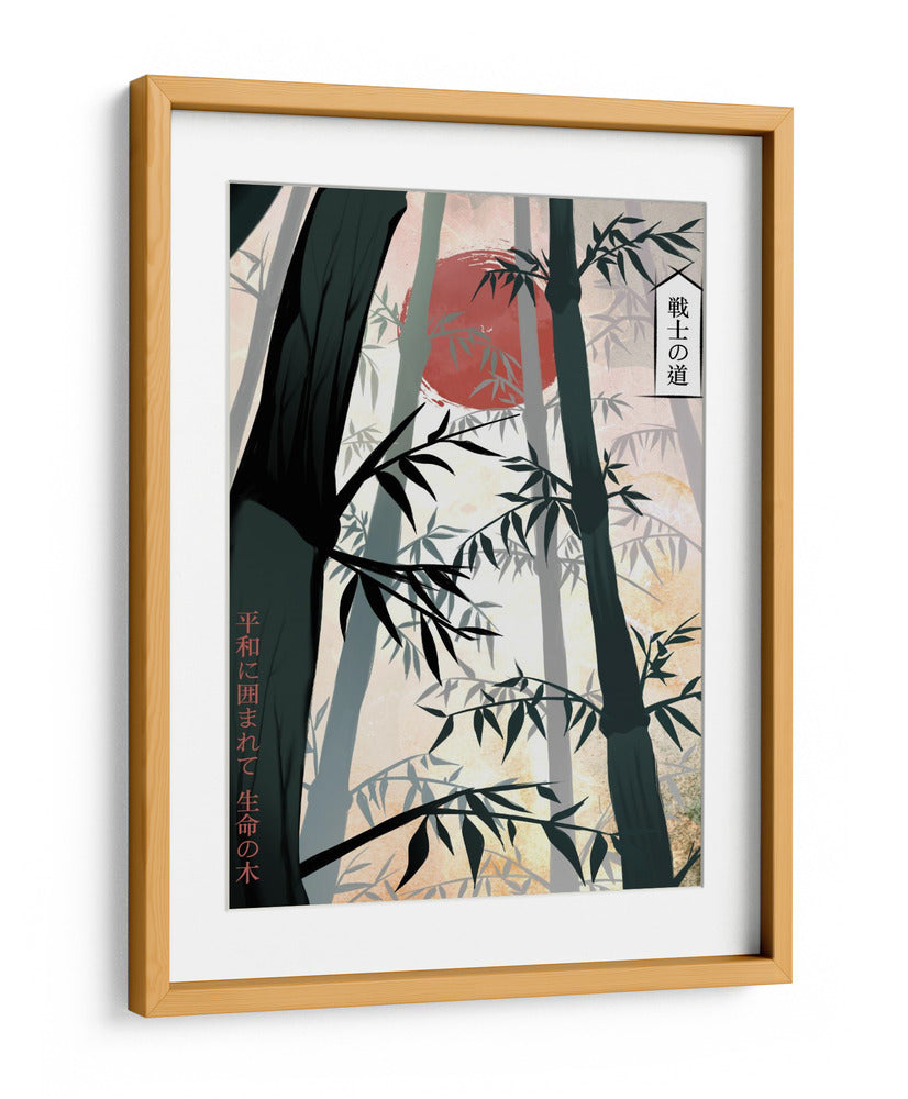 Sumérgete en la serenidad del bambú con 'Susurros de Chikurin', una obra de arte digital que captura la esencia de un bosque místico al amanecer. Los imponentes tallos de bambú, representados en tonos oscuros de verde azulado y gris, se elevan majestuosamente creando una sensación de profundidad y tranquilidad. El sol naciente, un orbe vibrante de color rojo anaranjado, se asoma entre las cañas, bañando la escena con una luz suave y etérea, acentuada por un delicado patrón texturizado en el fondo que evoca la delicadeza de las hojas y la atmósfera de un día brumoso. Las sombras tenues y los sutiles matices de color tierra y melocotón crean una composición equilibrada y armónica, invitando a la contemplación. Este cuadro decorativo, con su estilo inspirado en el arte oriental y su atmósfera pacífica, es ideal para añadir un toque de calma y sofisticación a tu hogar u oficina. Perfecto para espacios que buscan un refugio de paz y una conexión con la naturaleza, 'Susurros de Chikurin' transformará cualquier habitación en un oasis de serenidad.