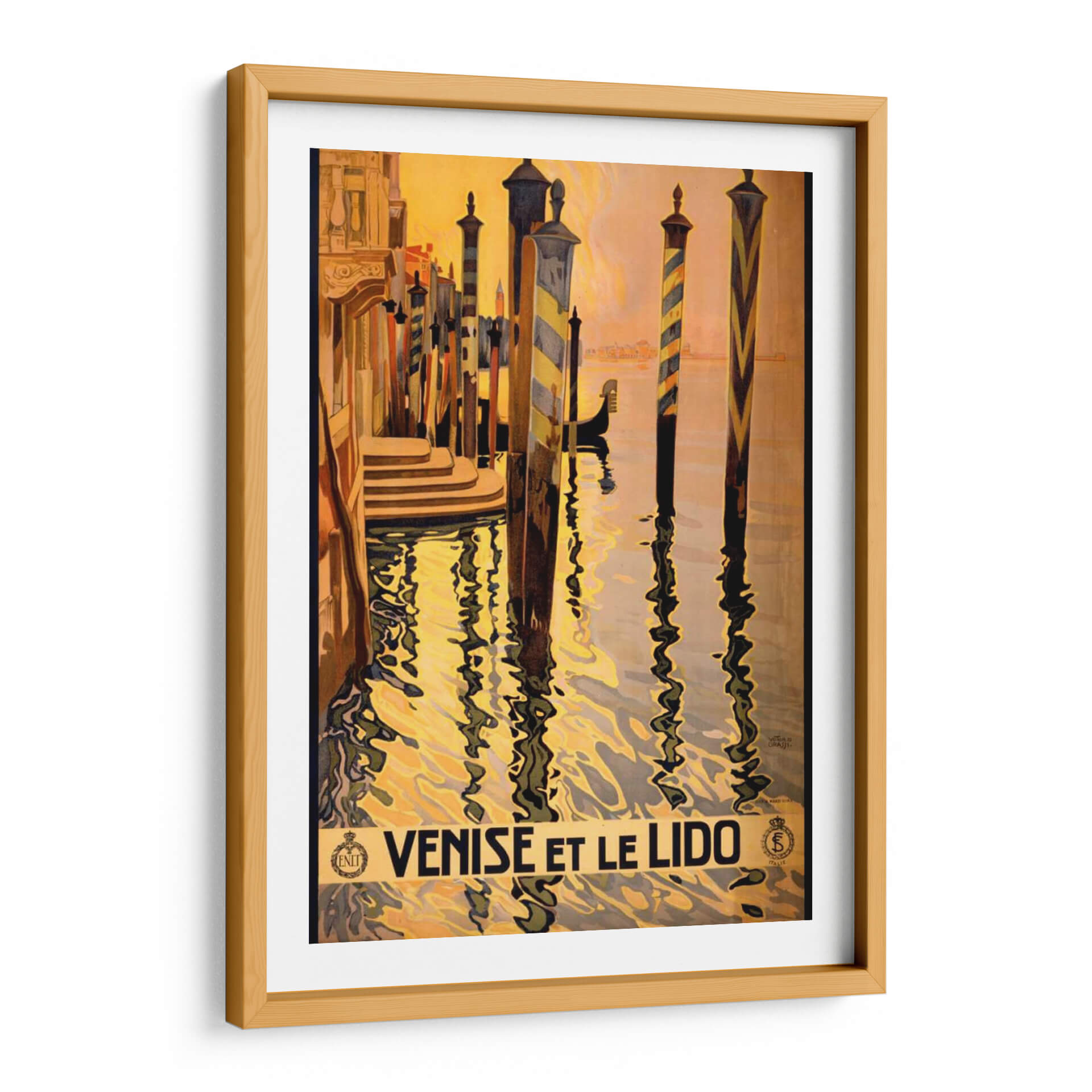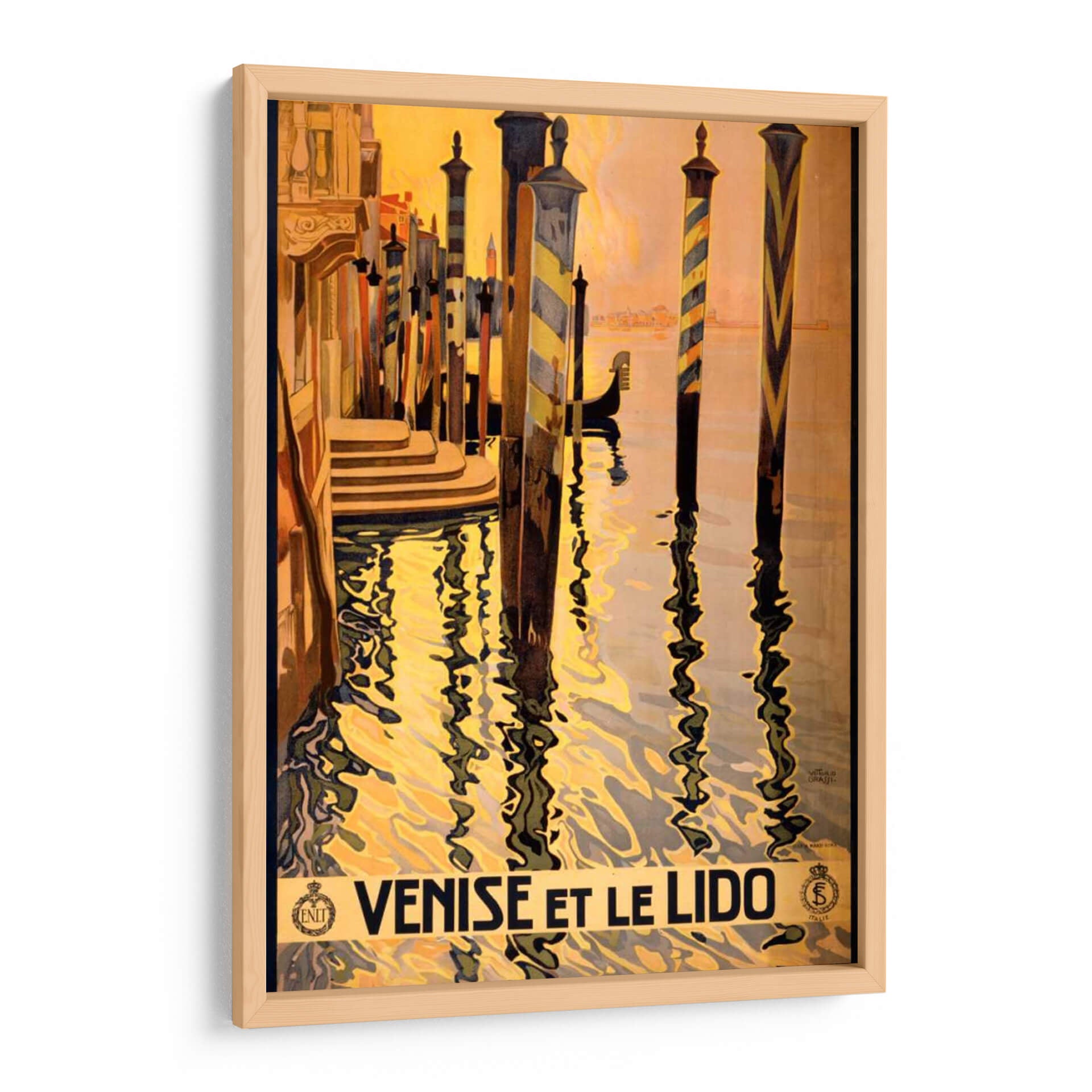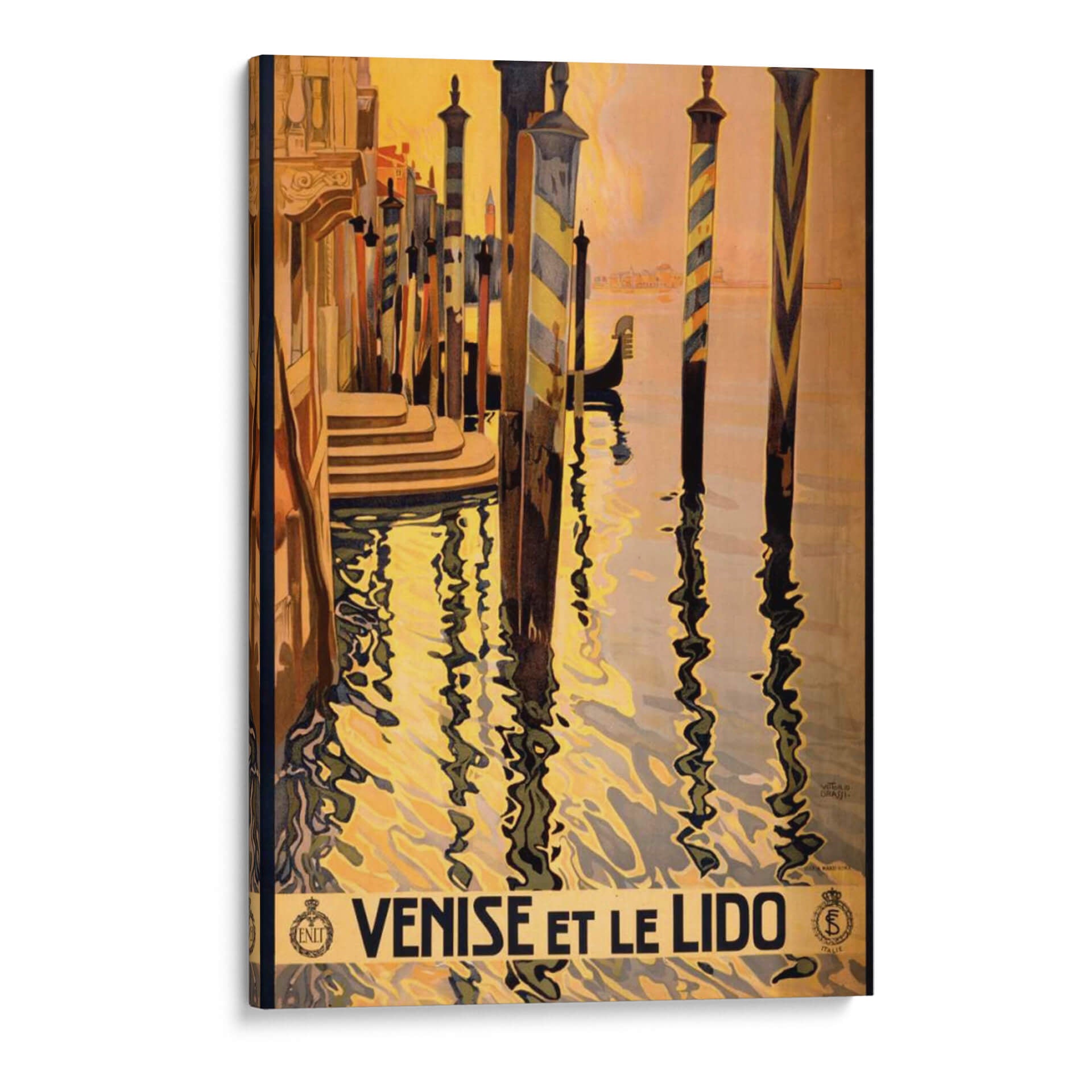 Sumérgete en la opulencia y el encanto de Venecia con este cautivador cuadro decorativo, 'Ver Venise Et Le Lido'. La obra captura la esencia de la laguna veneciana con una paleta de colores cálidos que evocan un atardecer dorado sobre el agua. Las icónicas columnas de los muelles, con sus vibrantes rayas, se reflejan en el oleaje, creando un juego visual hipnótico. La composición, con sus líneas fuertes y la silueta sutil de una góndola, transporta al espectador a un viaje nostálgico por los canales de la Serenísima. Este cuadro decorativo es una pieza perfecta para añadir un toque de sofisticación y elegancia a cualquier espacio, ideal para salones, recibidores o estudios que busquen un aire de refinamiento clásico. Su estilo evoca el arte de los carteles de viaje de antaño, infundiendo a tu hogar una atmósfera de ensueño y escapismo. Es una ventana a la belleza atemporal de Italia, una invitación a la contemplación y al disfrute de la estética veneciana, perfecta para quienes aprecian el arte con historia y la promesa de aventuras pasadas.