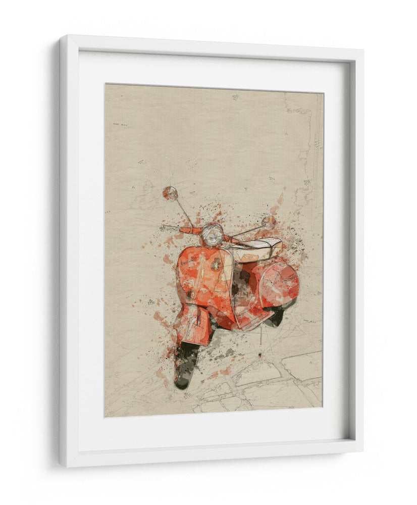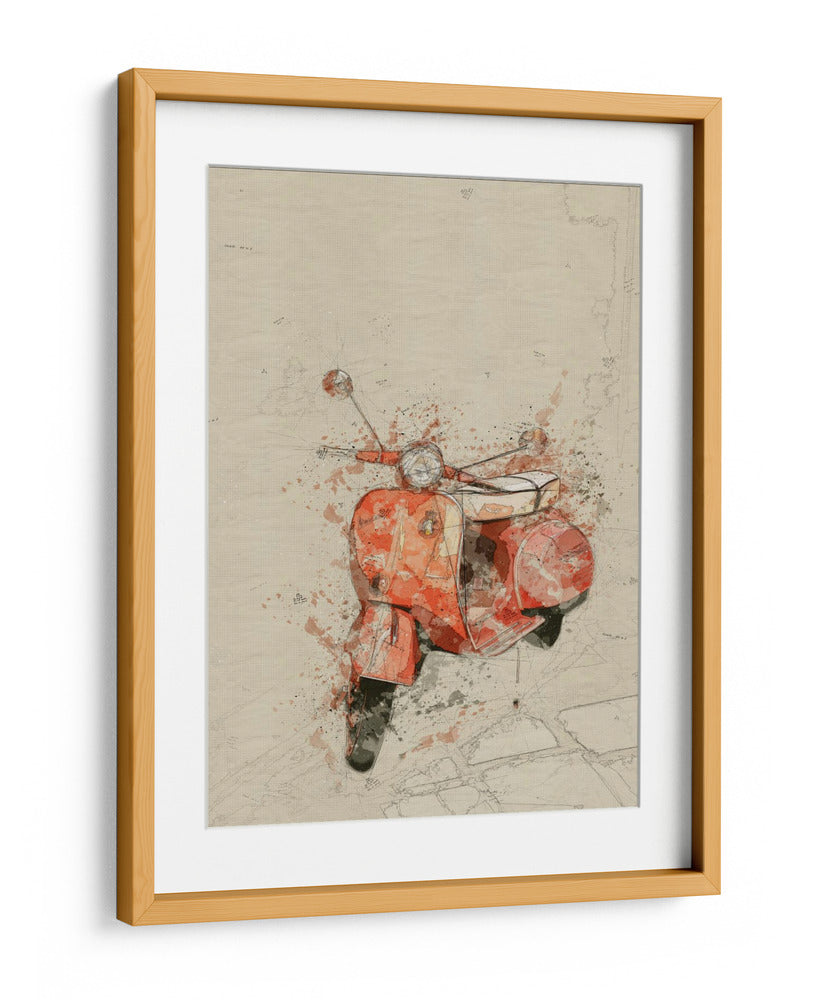Captura la esencia del estilo y la nostalgia con este evocador cuadro decorativo de una Vespa, cortesía del estudio Lembayung senja. Esta obra de arte digital presenta una vibrante Vespa de color naranja, representada con un estilo de acuarela y boceto que le confiere una textura única y un aire de movimiento. Los trazos sueltos y las salpicaduras de pintura en tonos tierra y grises complementan el diseño, creando una pieza que evoca viajes, libertad y un toque retro chic. La composición se centra en la icónica motocicleta, destacando sus líneas clásicas contra un fondo texturizado que simula papel envejecido con sutiles detalles de mapas o bocetos arquitectónicos. Es una pieza versátil, ideal para añadir personalidad a salones modernos, estudios creativos u oficinas que busquen un acento de color y carácter. Este cuadro decorativo de Vespa no es solo una imagen, sino una invitación a revivir la Dolce Vita, perfecto para amantes del diseño, el motor y el arte con alma.