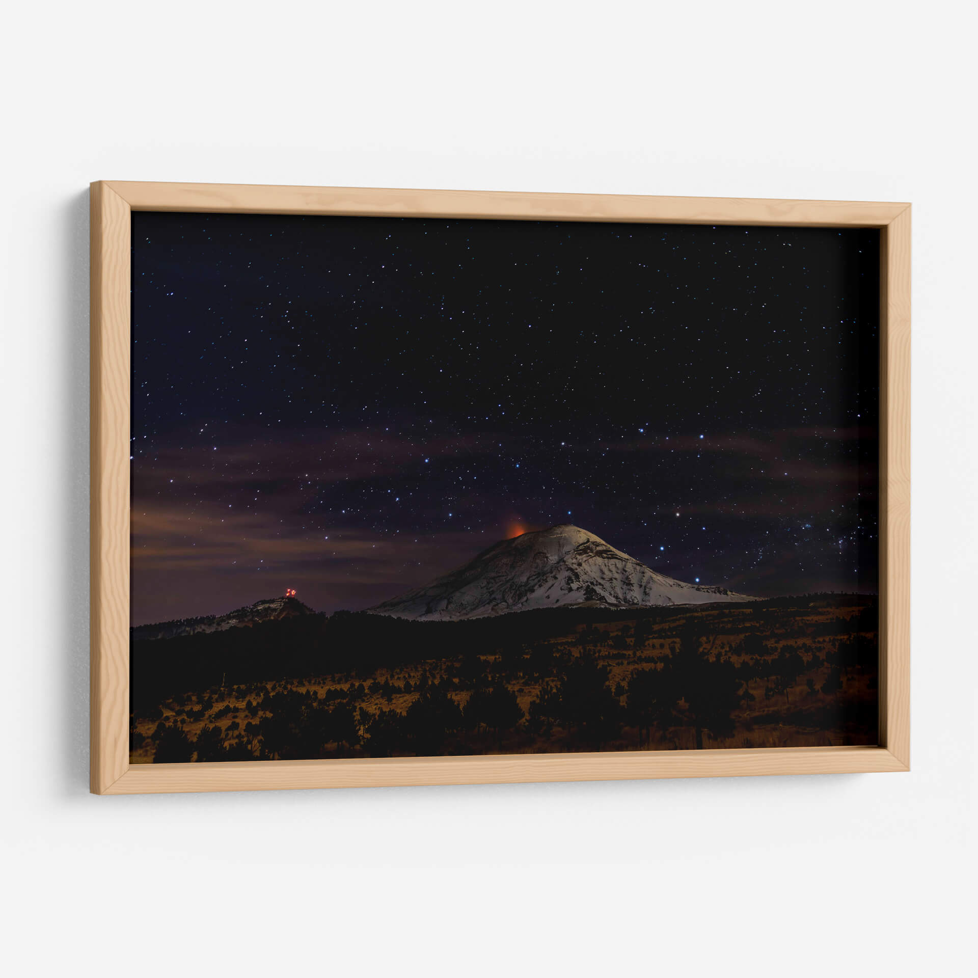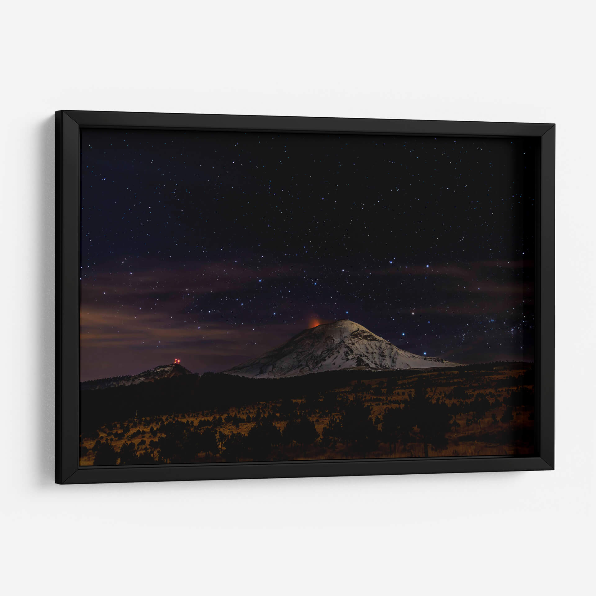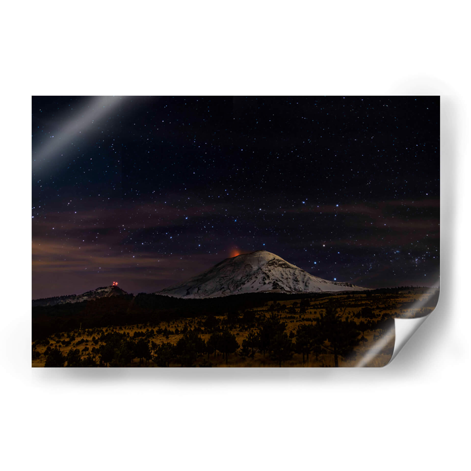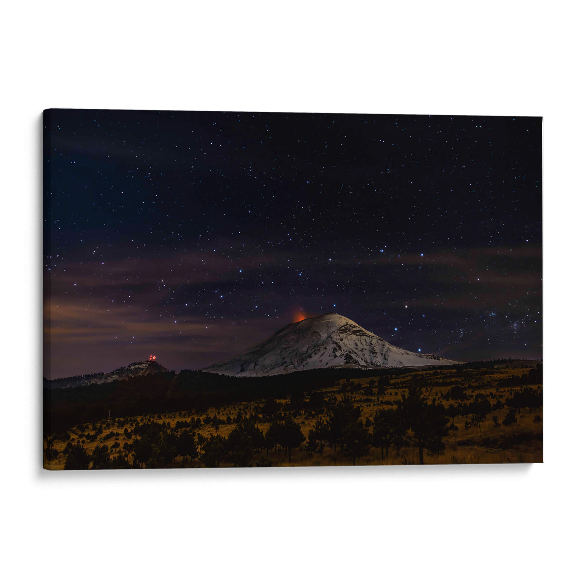 Captura la majestuosidad de la naturaleza con este impresionante cuadro decorativo 'Volcán y Estrellas' de Guillermo Aparicio. La obra sumerge al espectador en una noche estrellada, donde un imponente volcán cubierto de nieve se alza majestuosamente bajo un cielo repleto de constelaciones y nebulosas. Los colores oscuros y profundos del firmamento contrastan con el blanco de la nieve y los sutiles tonos ocres de la vegetación en primer plano, creando una atmósfera de misterio y serenidad. La sutil iluminación en la cima del volcán añade un toque de drama y vitalidad a la escena, sugiriendo la energía latente de la montaña. Este cuadro es ideal para añadir un toque de contemplación y asombro a cualquier espacio, desde una sala de estar moderna hasta una oficina, evocando la grandeza del universo y la quietud de la naturaleza en su máxima expresión. La composición equilibra la inmensidad del cielo con la solidez de la tierra, invitando a la reflexión sobre nuestro lugar en el cosmos. Transforma tu hogar con esta pieza única que combina la belleza natural con la magia de la noche.