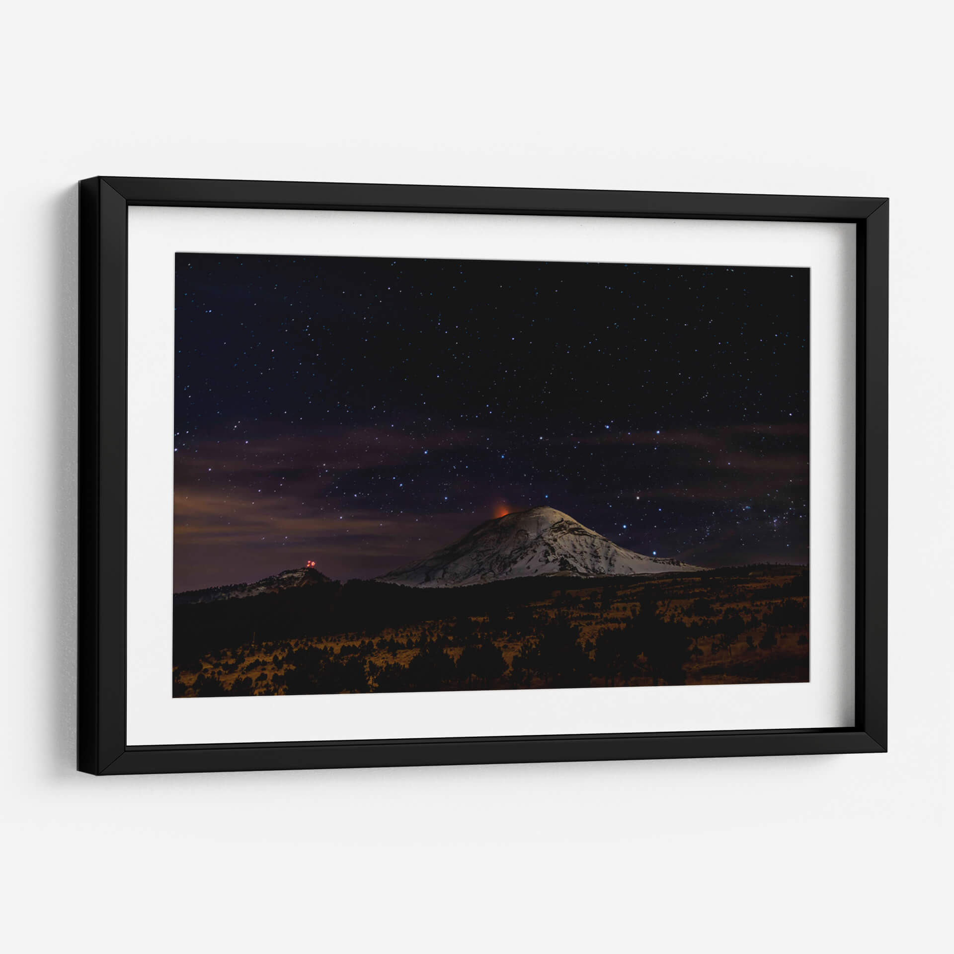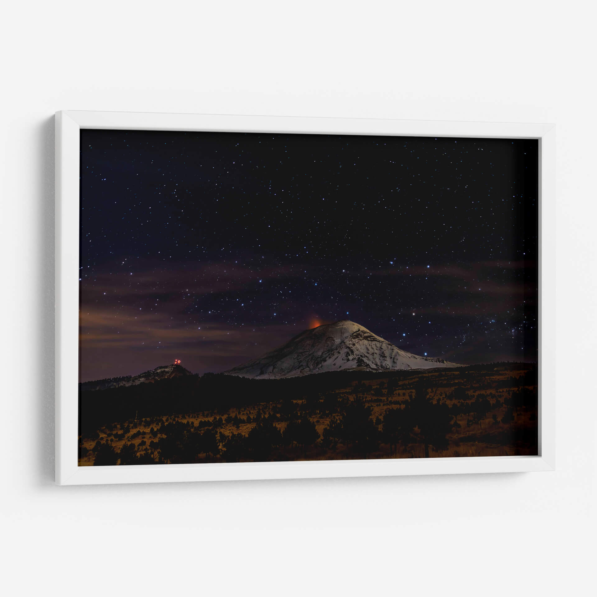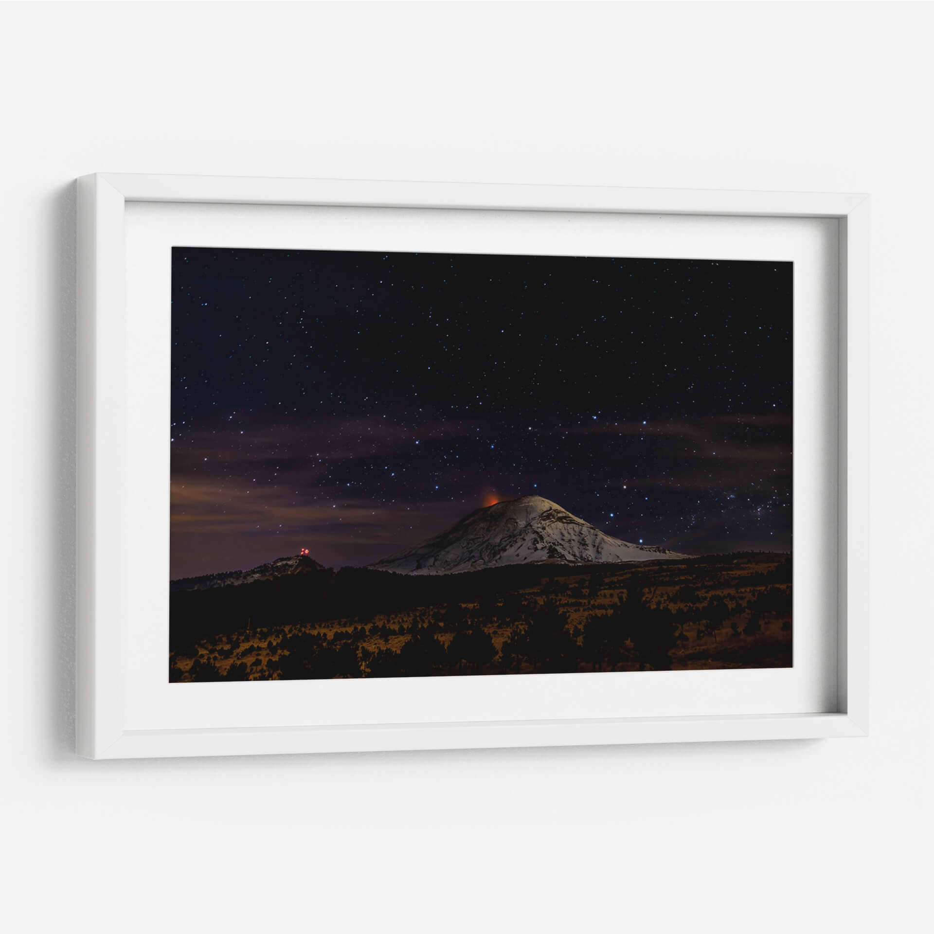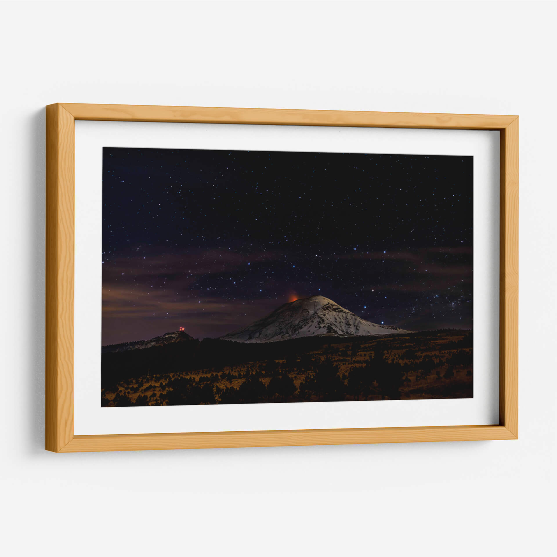 Captura la majestuosidad de la naturaleza con este impresionante cuadro decorativo 'Volcán y Estrellas' de Guillermo Aparicio. La obra sumerge al espectador en una noche estrellada, donde un imponente volcán cubierto de nieve se alza majestuosamente bajo un cielo repleto de constelaciones y nebulosas. Los colores oscuros y profundos del firmamento contrastan con el blanco de la nieve y los sutiles tonos ocres de la vegetación en primer plano, creando una atmósfera de misterio y serenidad. La sutil iluminación en la cima del volcán añade un toque de drama y vitalidad a la escena, sugiriendo la energía latente de la montaña. Este cuadro es ideal para añadir un toque de contemplación y asombro a cualquier espacio, desde una sala de estar moderna hasta una oficina, evocando la grandeza del universo y la quietud de la naturaleza en su máxima expresión. La composición equilibra la inmensidad del cielo con la solidez de la tierra, invitando a la reflexión sobre nuestro lugar en el cosmos. Transforma tu hogar con esta pieza única que combina la belleza natural con la magia de la noche.