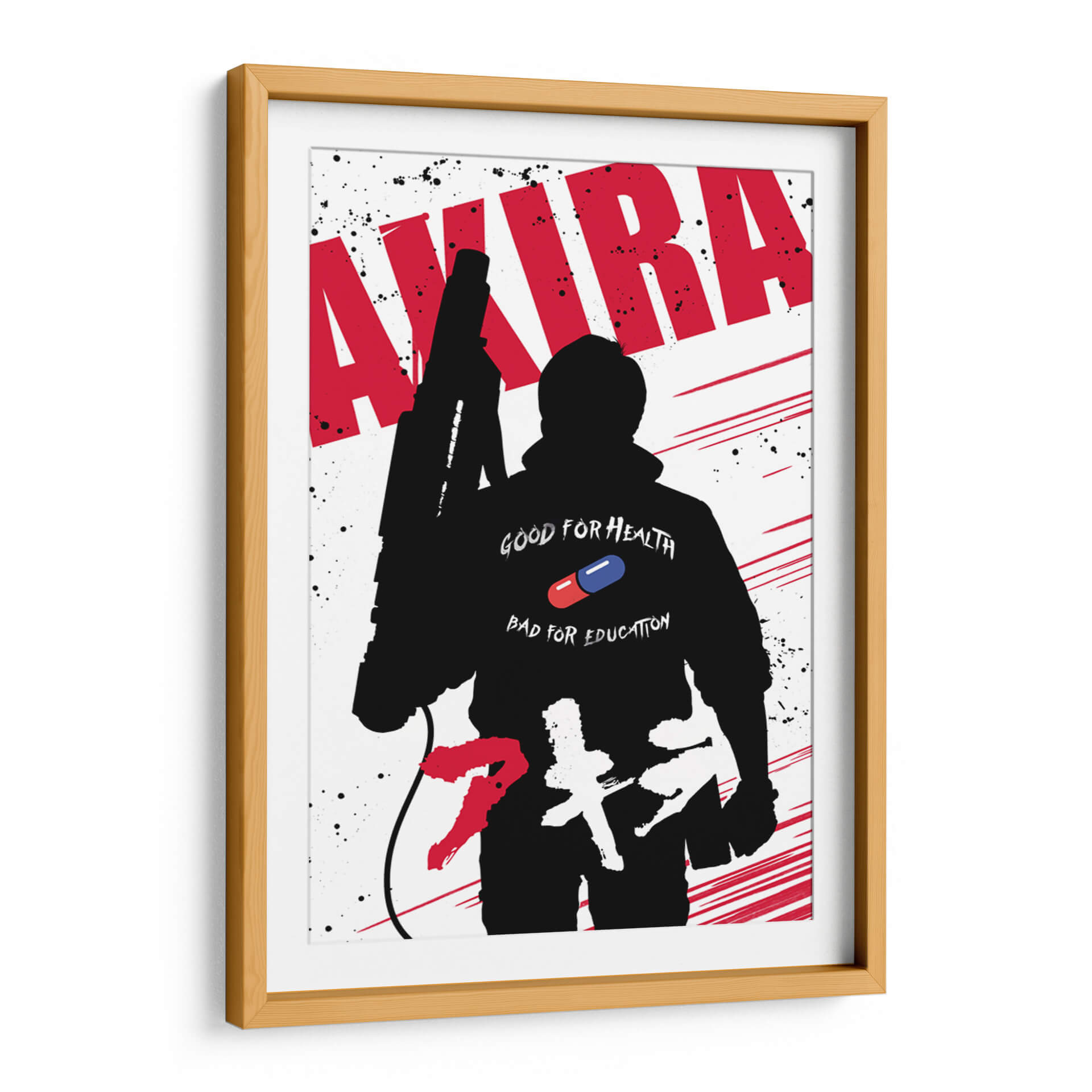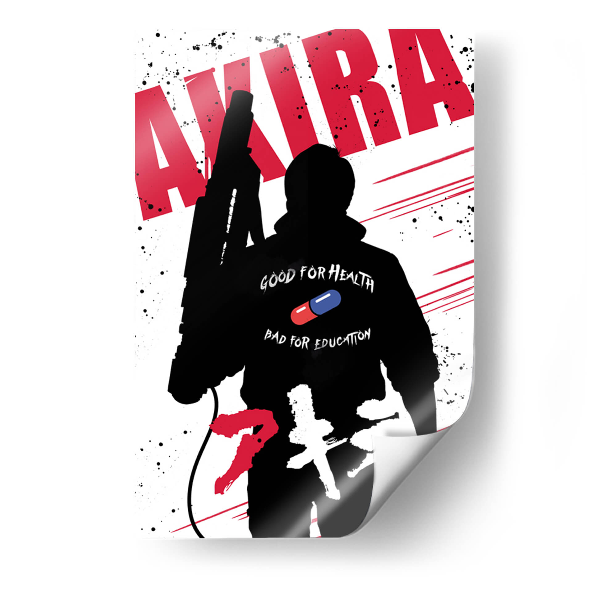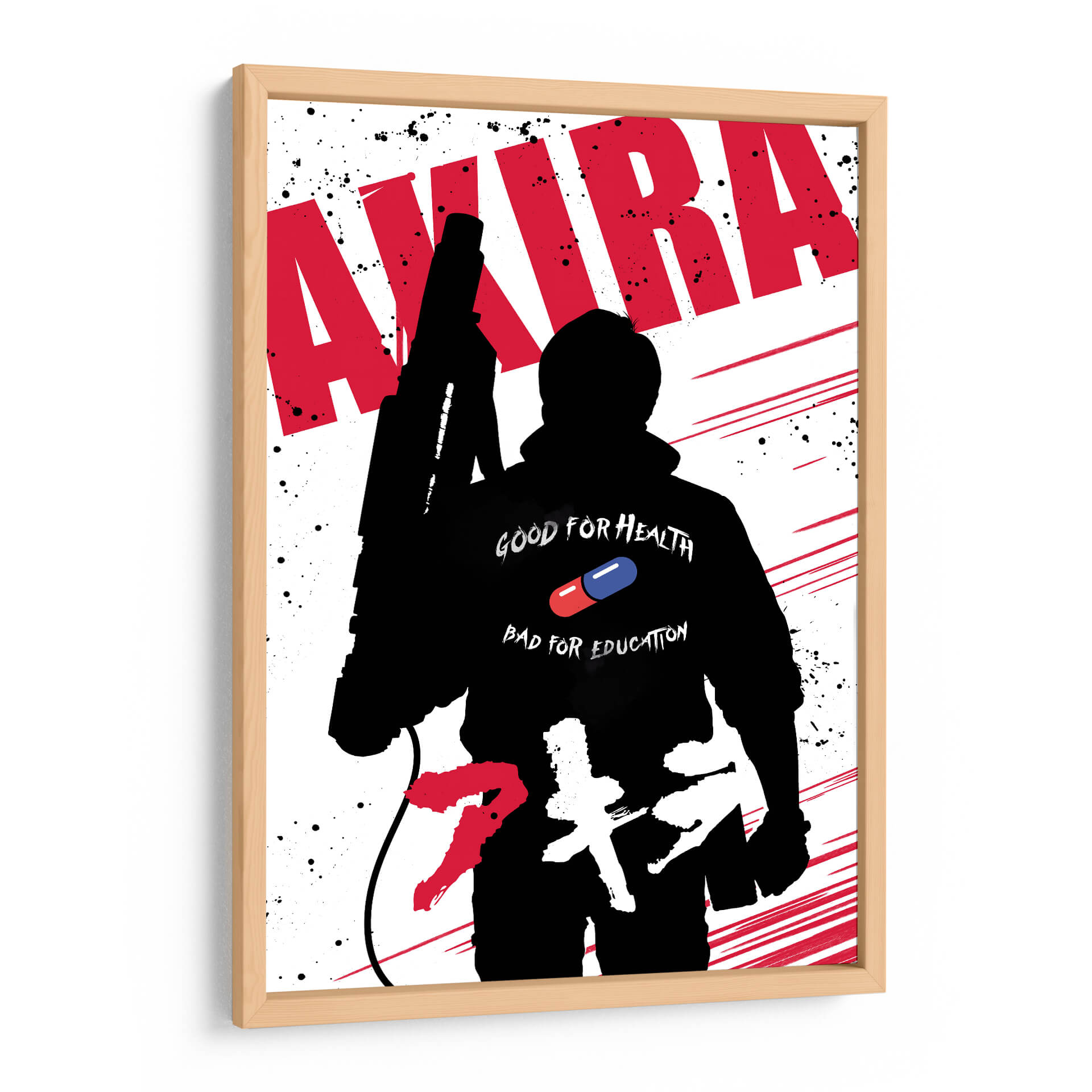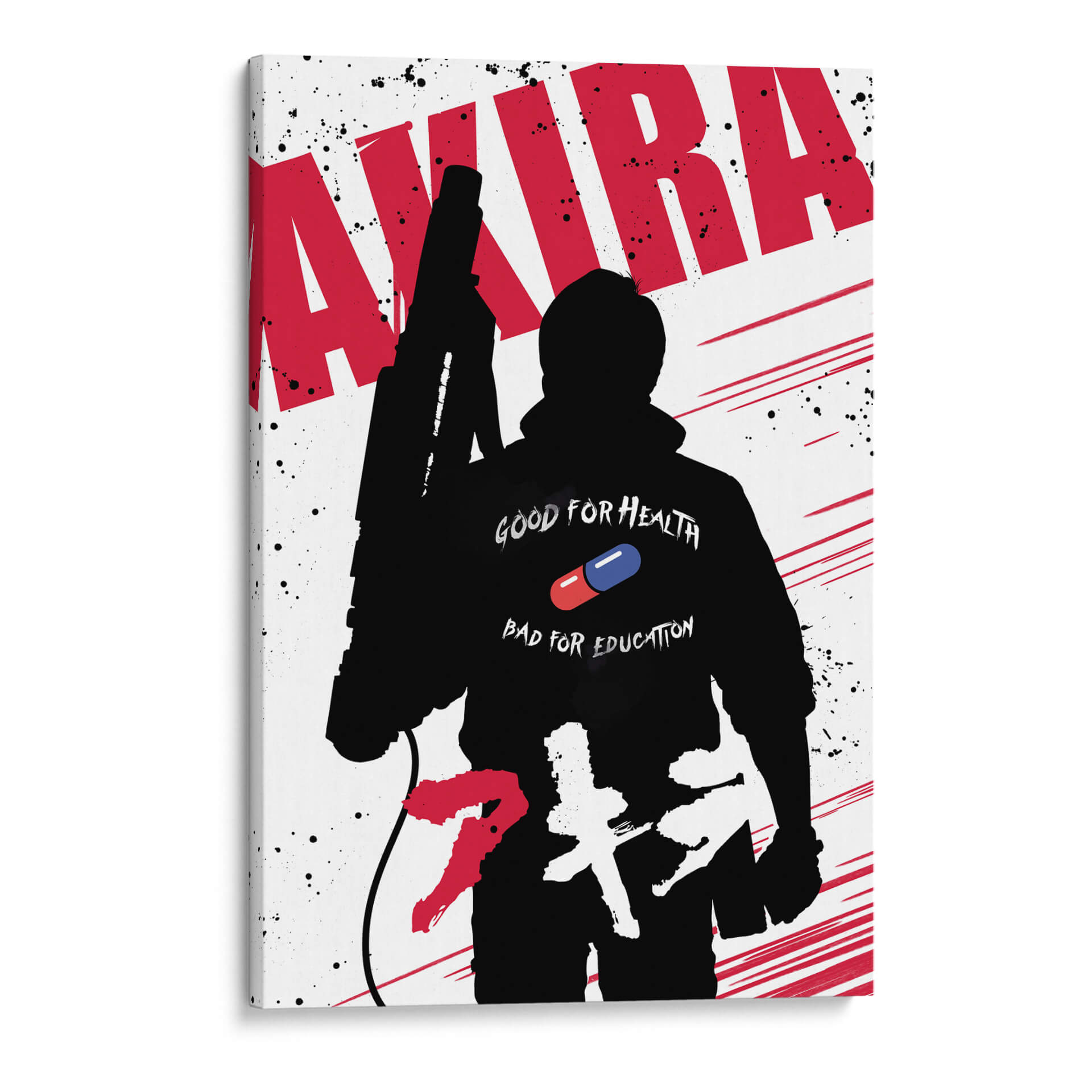 Sumérgete en el universo distópico y vibrante de 'Akira' con este impactante cuadro decorativo. La obra presenta una silueta audaz en negro, evocando la icónica figura central de la película, frente a un fondo blanco salpicado de tinta negra y trazos rojos dinámicos que sugieren movimiento y energía. Destaca en la figura un detalle clave: la frase "GOOD FOR HEALTH BAD FOR EDUCATION" junto a una píldora roja y azul, elementos que encapsulan la complejidad temática de la obra original. Este diseño gráfico, con su fuerte contraste y estilo pop-art, es ideal para añadir un toque de rebeldía y cultura pop a cualquier espacio. Perfecto para salas de estar, estudios o habitaciones de jóvenes entusiastas del anime y el cine de ciencia ficción. Transforma tu pared en un lienzo de narrativa visual y convierte tu hogar en un reflejo de tu pasión por el arte contemporáneo y las historias que marcan época. Una pieza que no solo decora, sino que también dialoga, invitando a la reflexión sobre temas de poder, control y evolución. Añade esta pieza única a tu colección y dale vida a tus ambientes con una dosis de audacia y estilo inconfundible.