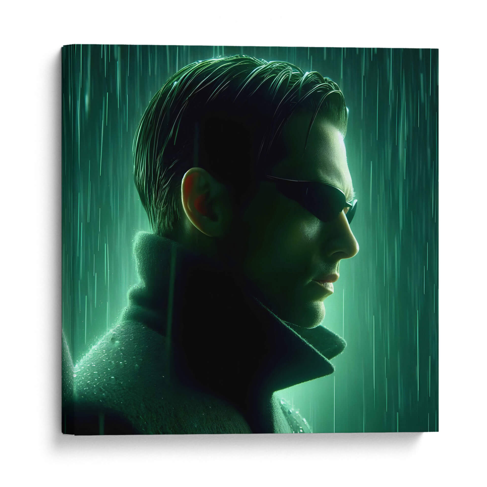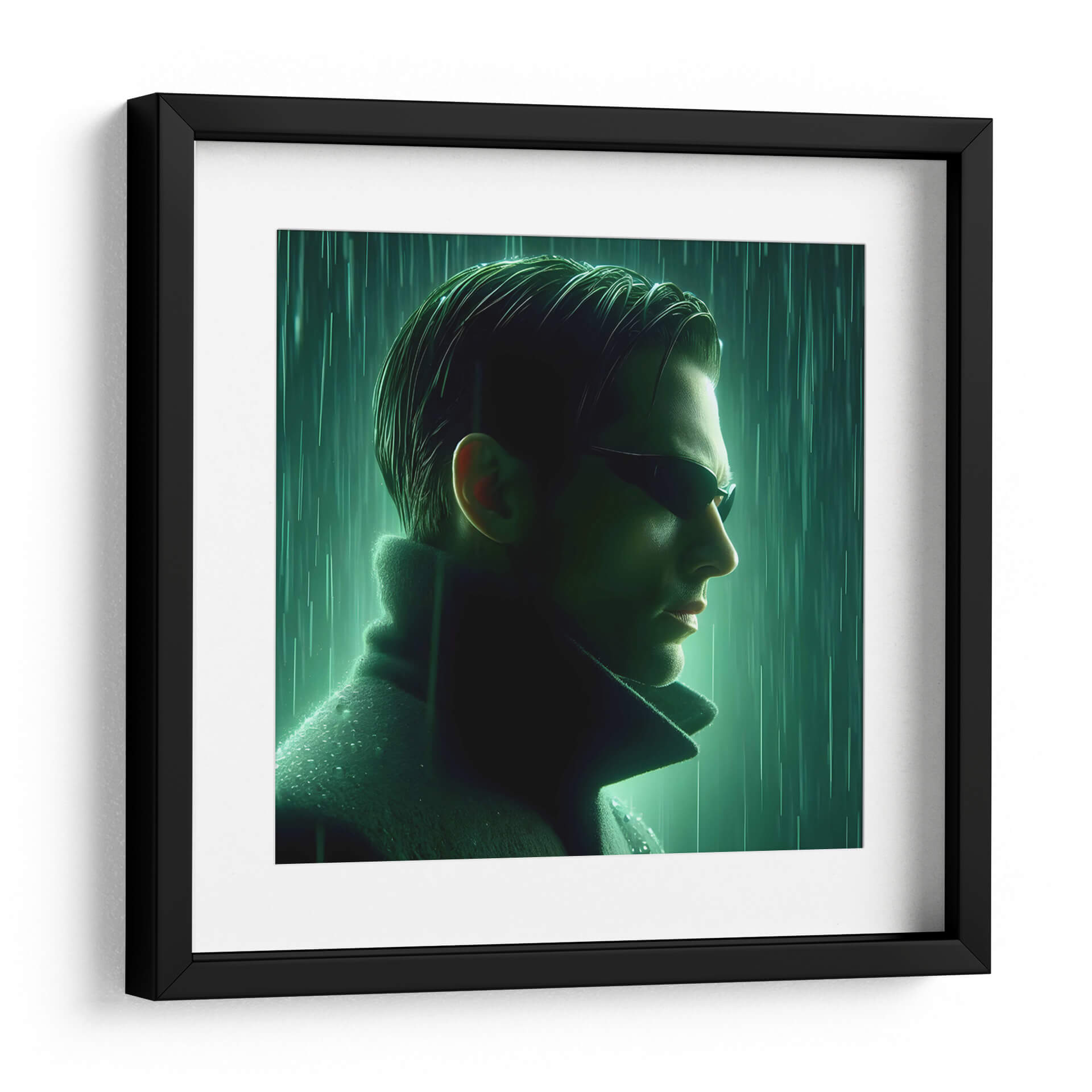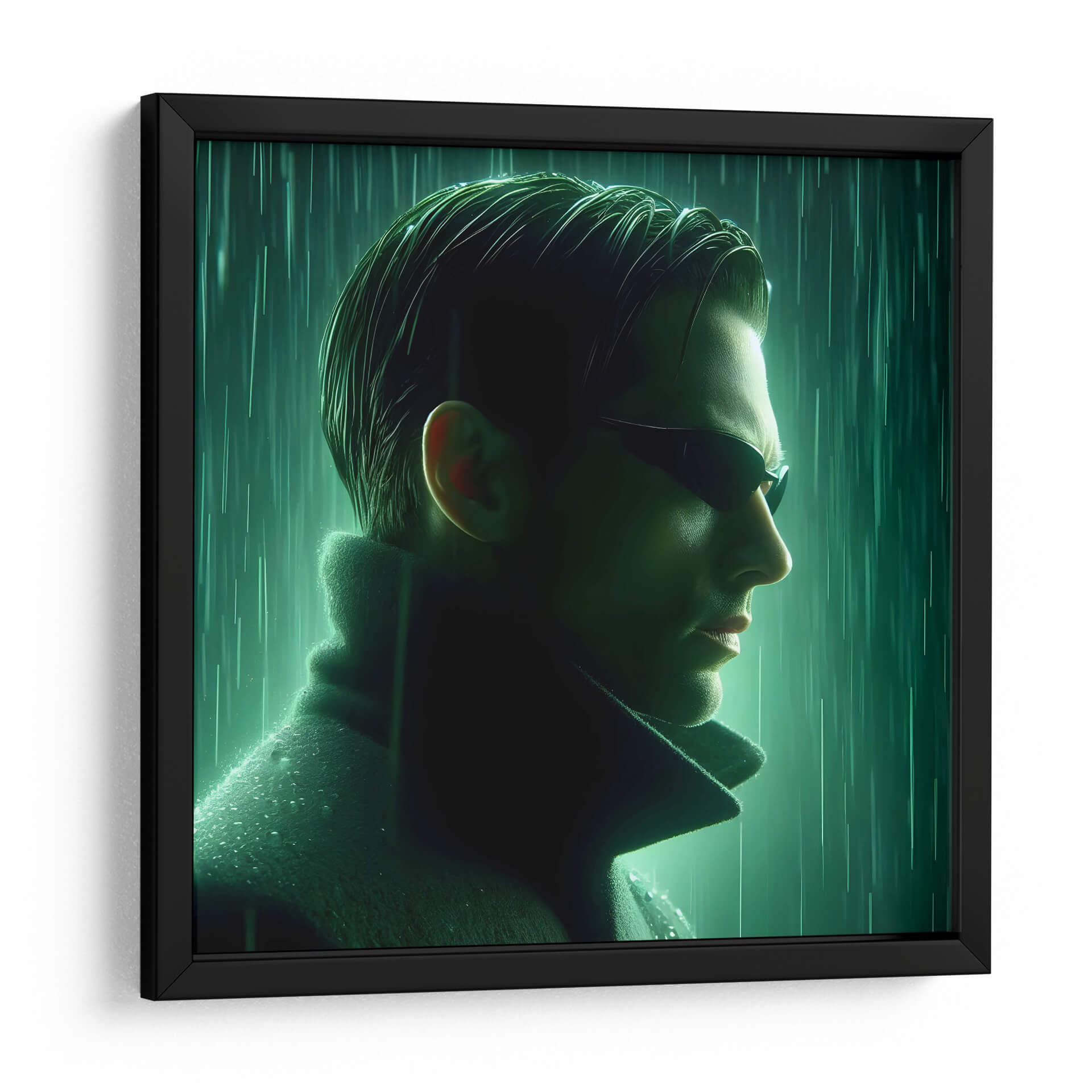 Sumérgete en la atmósfera enigmática de "El Otro Elegido", una obra de arte digital que evoca misterio y determinación. Este cuadro decorativo presenta un primer plano de un hombre con gafas de sol oscuras, enmarcado por una lluvia estilizada en tonos verdes profundos. La iluminación dramática resalta los contornos del rostro y la textura de su vestimenta, creando un efecto casi cinematográfico. La paleta de colores, dominada por el verde esmeralda y el negro, confiere una sensación de intriga y sofisticación. Ideal para quienes buscan un toque de audacia y modernidad en su hogar u oficina, "El Otro Elegido" es una pieza que invita a la reflexión y se convierte en un punto focal impactante. Su estilo contemporáneo y su composición audaz lo hacen perfecto para espacios que buscan expresar carácter y una estética vanguardista. Transforma cualquier ambiente con esta representación visualmente potente, una adición distintiva para coleccionistas de arte moderno y aficionados a la estética cyberpunk o de ciencia ficción.