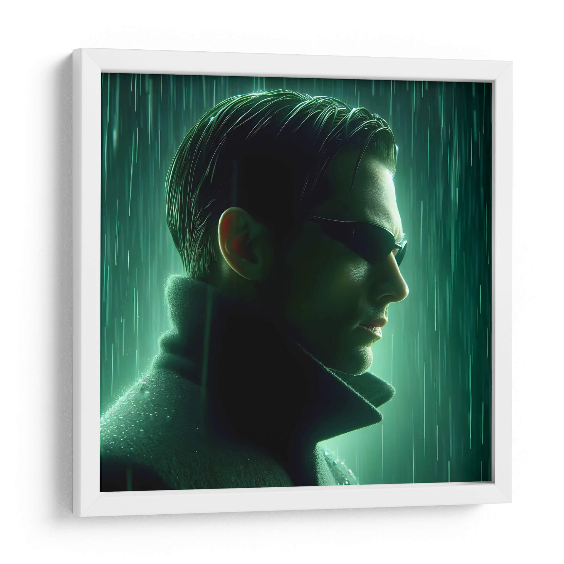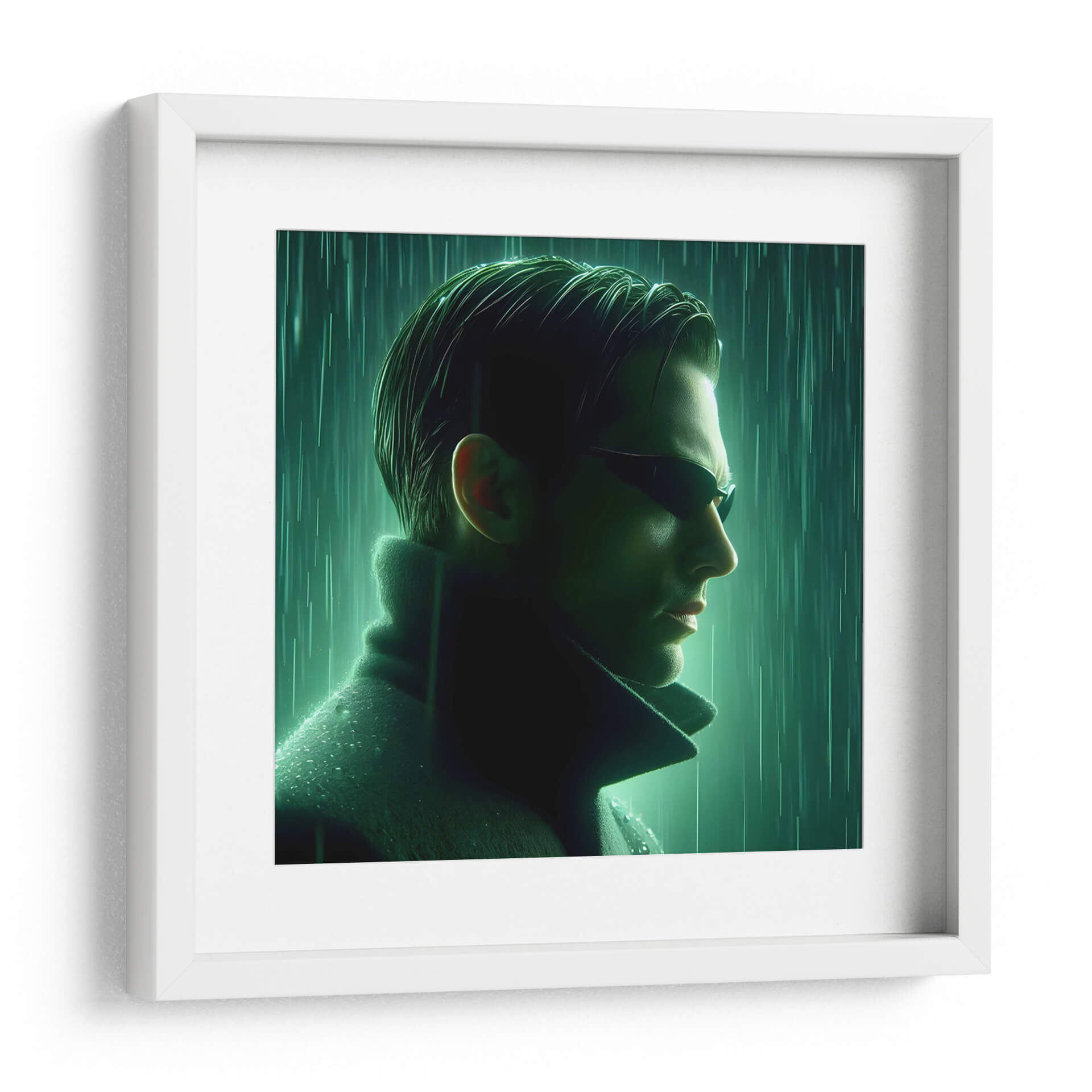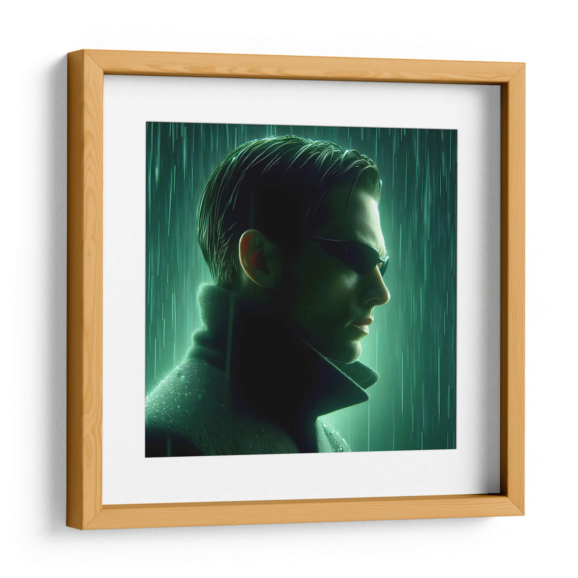 Sumérgete en la atmósfera enigmática de "El Otro Elegido", una obra de arte digital que evoca misterio y determinación. Este cuadro decorativo presenta un primer plano de un hombre con gafas de sol oscuras, enmarcado por una lluvia estilizada en tonos verdes profundos. La iluminación dramática resalta los contornos del rostro y la textura de su vestimenta, creando un efecto casi cinematográfico. La paleta de colores, dominada por el verde esmeralda y el negro, confiere una sensación de intriga y sofisticación. Ideal para quienes buscan un toque de audacia y modernidad en su hogar u oficina, "El Otro Elegido" es una pieza que invita a la reflexión y se convierte en un punto focal impactante. Su estilo contemporáneo y su composición audaz lo hacen perfecto para espacios que buscan expresar carácter y una estética vanguardista. Transforma cualquier ambiente con esta representación visualmente potente, una adición distintiva para coleccionistas de arte moderno y aficionados a la estética cyberpunk o de ciencia ficción.