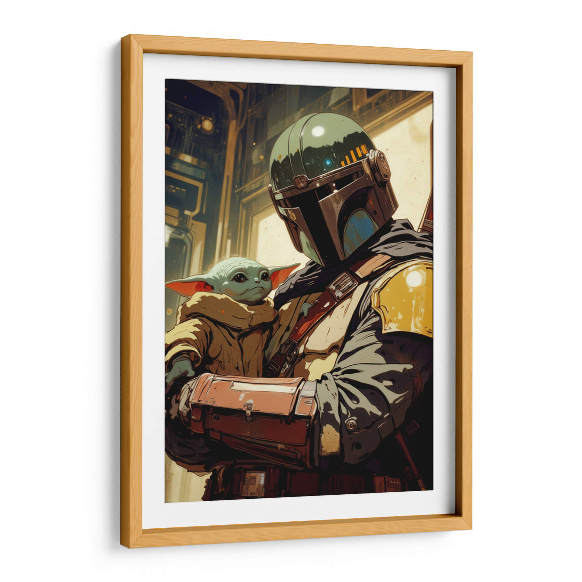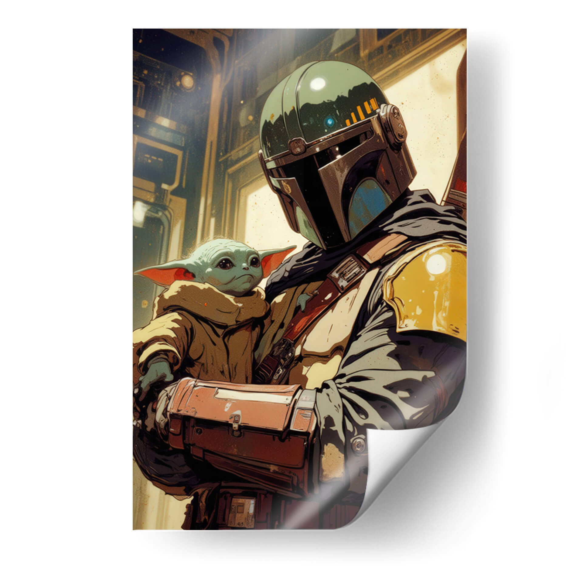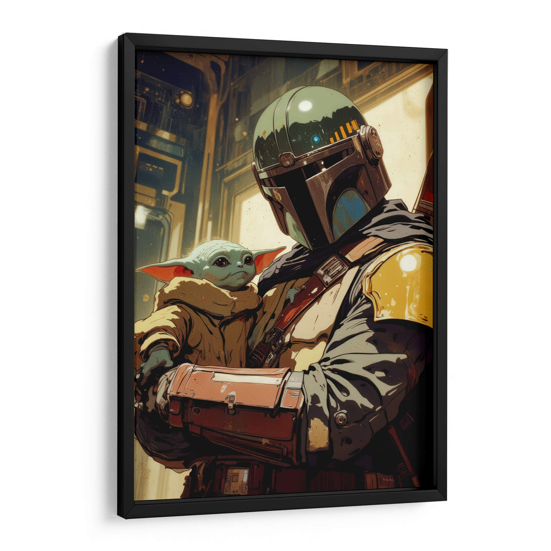 Sumérgete en el universo de Star Wars con este cautivador cuadro decorativo 'Grogu y Mando', una obra de arte digital de Paltik Arte Digital que captura la esencia de una de las duplas más queridas de la galaxia. La pieza presenta una representación estilizada y emotiva del icónico Mandaloriano protegiendo al pequeño Grogu. Los colores dominantes, una paleta de tonos tierra, ocres y verdes militares, se combinan con toques de azul y amarillo para crear una atmósfera rica y detallada, evocando la crudeza y la aventura del espacio. El estilo de arte digital, con líneas definidas y un tratamiento de luz y sombra dramático, confiere a la obra una profundidad y un carácter únicos. Esta pieza es perfecta para los aficionados a la ciencia ficción y para aquellos que buscan añadir un toque de narrativa y emoción a su decoración. Ideal para un salón moderno, una sala de juegos o una oficina, este cuadro decorativo servirá como un punto focal que inspira conversaciones y evoca nostalgia y protección. Añade un pedazo de la saga a tu hogar y deja que esta obra despierte tu lado más aventurero.