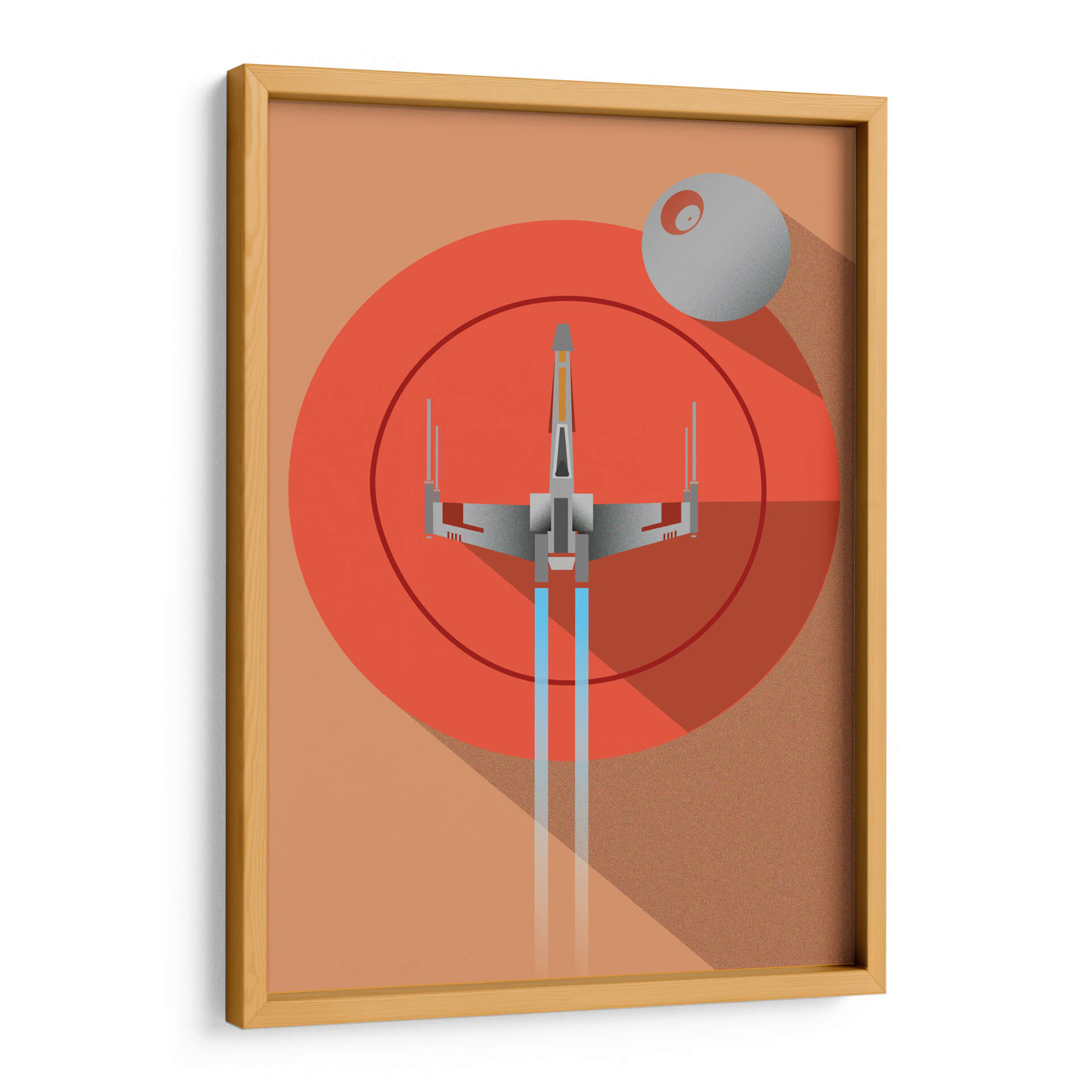 Sumérgete en una galaxia de estilo con este evocador cuadro decorativo 'Orange Star Wars'. La obra presenta una estilizada nave espacial gris con detalles en naranja y azul, surcando el espacio contra un vibrante círculo rojo y un planeta gris, que evoca la icónica Estrella de la Muerte. La paleta de colores cálidos, dominada por tonos naranjas y marrones terrosos, crea una atmósfera audaz y enérgica, mientras que las líneas limpias y la composición geométrica le otorgan un toque moderno y minimalista. Este cuadro decorativo es una pieza de arte conceptual que fusiona la nostalgia de una saga icónica con una estética contemporánea, ideal para espacios que buscan un punto focal dinámico y con carácter. Perfecto para salas de estar, estudios o cualquier rincón donde quieras añadir un toque de aventura y diseño único. Su estilo gráfico y el uso audaz del color lo convierten en una adición destacada a cualquier colección de arte moderno, atrayendo tanto a aficionados de la ciencia ficción como a amantes del diseño vanguardista.