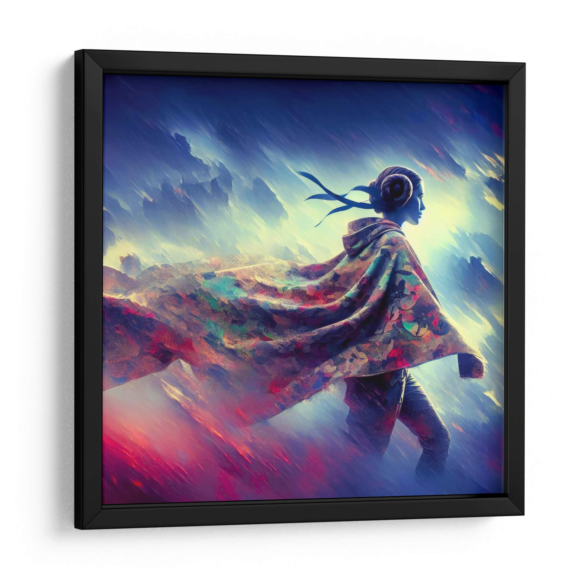 Sumérgete en el universo de "Princesa Lea en Andor", una obra de arte digital que evoca fuerza y misterio. La pieza presenta una figura femenina de perfil, con un estilo que recuerda a la icónica princesa Leia, envuelta en una capa vibrante y detallada que contrasta con el fondo etéreo y dinámico. Los colores profundos y saturados, dominados por azules, morados y toques de rojo y amarillo, crean una atmósfera de otro mundo, casi onírica. Las pinceladas digitales, audaces y expresivas, sugieren movimiento y energía, transportando al espectador a un paisaje de fantasía o un futuro lejano. El rostro de la figura, en un tono azulado, añade un elemento de enigma y poder. Este cuadro decorativo es ideal para espacios que buscan un toque de originalidad y carácter, como una sala de estar moderna, un estudio o una oficina. Su composición cautivadora y su paleta de colores audaz la convierten en un punto focal irresistible, perfecto para quienes aprecian el arte de ciencia ficción y las representaciones contemporáneas de personajes icónicos. Añade un toque de aventura y sofisticación a tu decoración con esta pieza única que trasciende lo ordinario.
