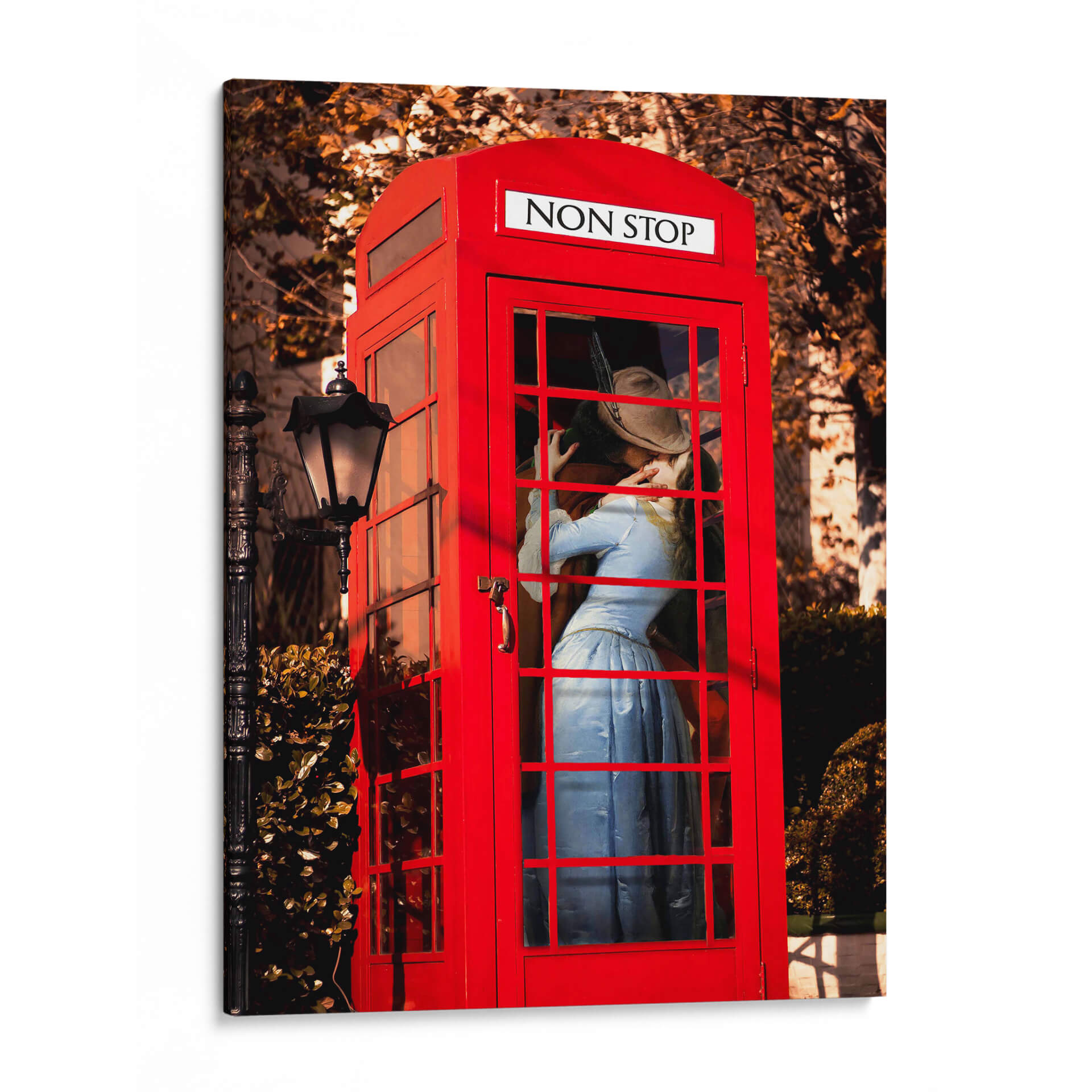 Captura la esencia del romance urbano con este cautivador cuadro decorativo "Cállate y bésame". La obra presenta una icónica cabina telefónica roja de Londres, un símbolo de la ciudad, dentro de la cual dos figuras se entregan a un apasionado beso. La paleta de colores vibrantes, dominada por el rojo intenso de la cabina y los tonos cálidos del follaje otoñal de fondo, crea una atmósfera de calidez y nostalgia. La iluminación, que baña la escena en una luz dorada, realza el dramatismo del momento capturado. El estilo de la obra, con su realismo detallado y composición cinematográfica, invita a la contemplación sobre la intimidad y la conexión humana en medio del bullicio de la ciudad. Este cuadro decorativo es perfecto para añadir un toque de elegancia romántica a cualquier espacio, ya sea una sala de estar, un dormitorio o un estudio. Ideal para quienes aprecian el arte con narrativa, la fotografía urbana o las piezas que evocan emociones profundas. Añade una pieza única que hable de amor y momentos fugaces a tu decoración.