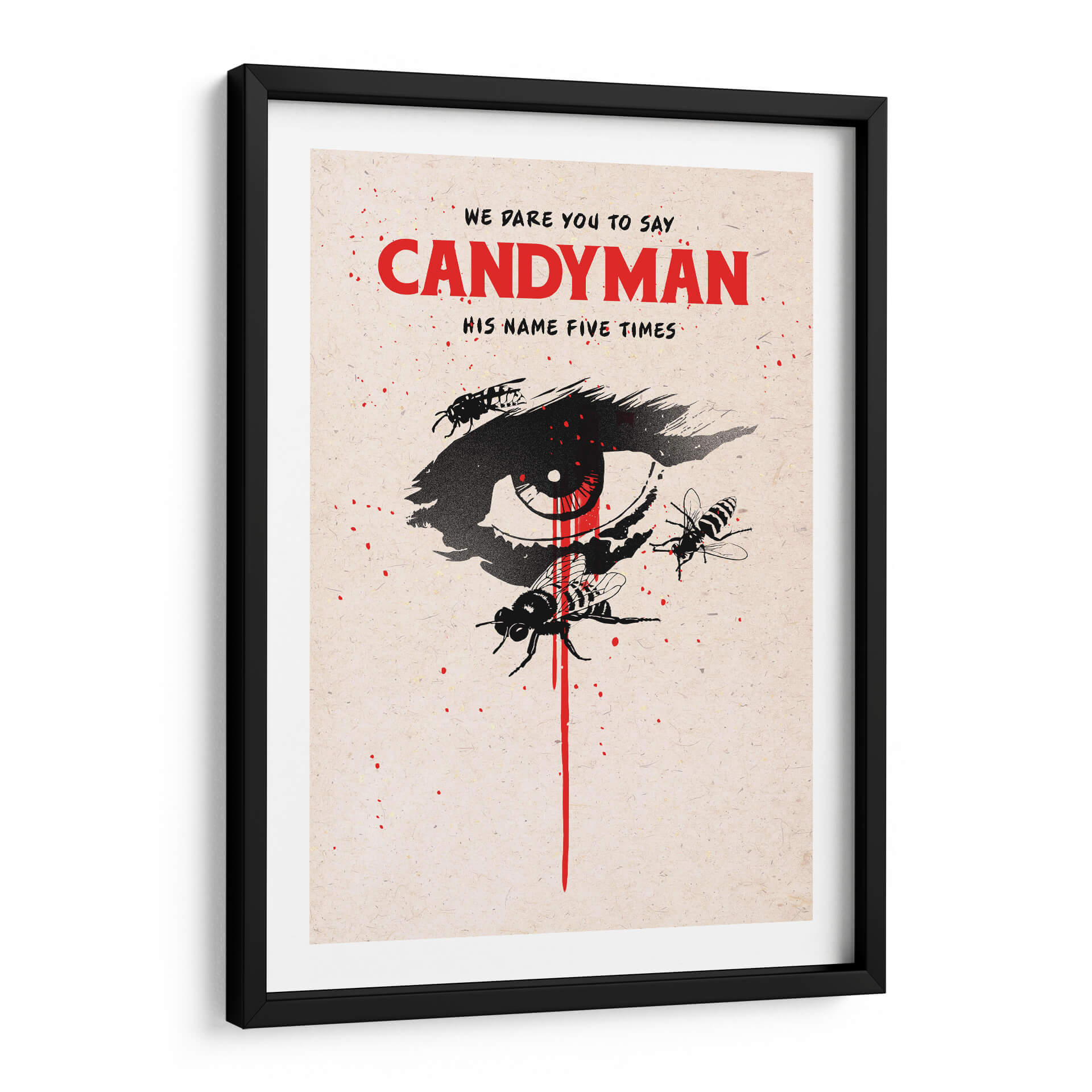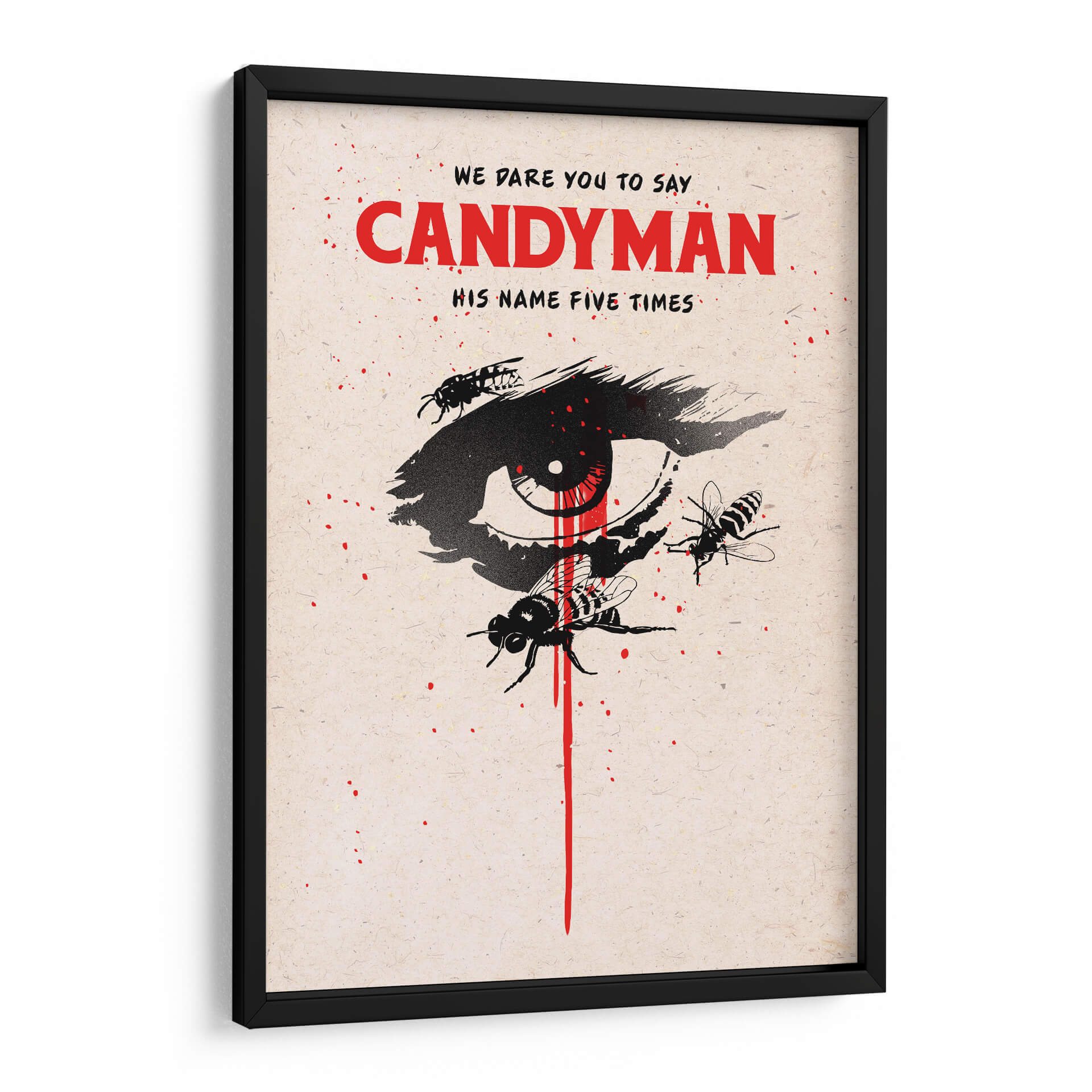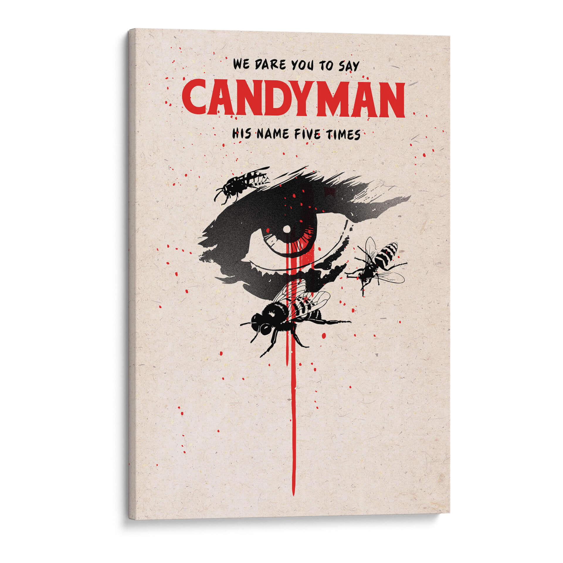 Sumérgete en la atmósfera inquietante y cautivadora de esta obra de arte inspirada en "Candyman". Este cuadro decorativo presenta un diseño audaz y gráfico que evoca el misterio y el terror psicológico de la icónica película. La imagen central es un ojo estilizado, con una mirada penetrante que parece advertir y atraer a la vez, rodeado por la silueta amenazante de insectos, posiblemente abejas o moscas, símbolos recurrentes del mito. Una cascada de sangre roja vibrante cae desde el ojo, añadiendo un toque dramático y visceral a la composición. El texto "WE DARE YOU TO SAY CANDYMAN HIS NAME FIVE TIMES" en letras rojas intensifica la narrativa, invitando a la audiencia a confrontar sus miedos. La paleta de colores se centra en un fondo texturizado de tono crudo, contrastando con el negro profundo de las siluetas y el rojo intenso de los detalles. Este cuadro es una pieza de arte contemporáneo perfecta para quienes buscan añadir un toque de intriga y audacia a su decoración, ideal para salas de estar, estudios o incluso para crear un rincón de cine en casa que hable de tu gusto por lo macabro y lo artístico. Una adición impactante para cualquier aficionado al cine de terror y al arte gráfico distintivo.