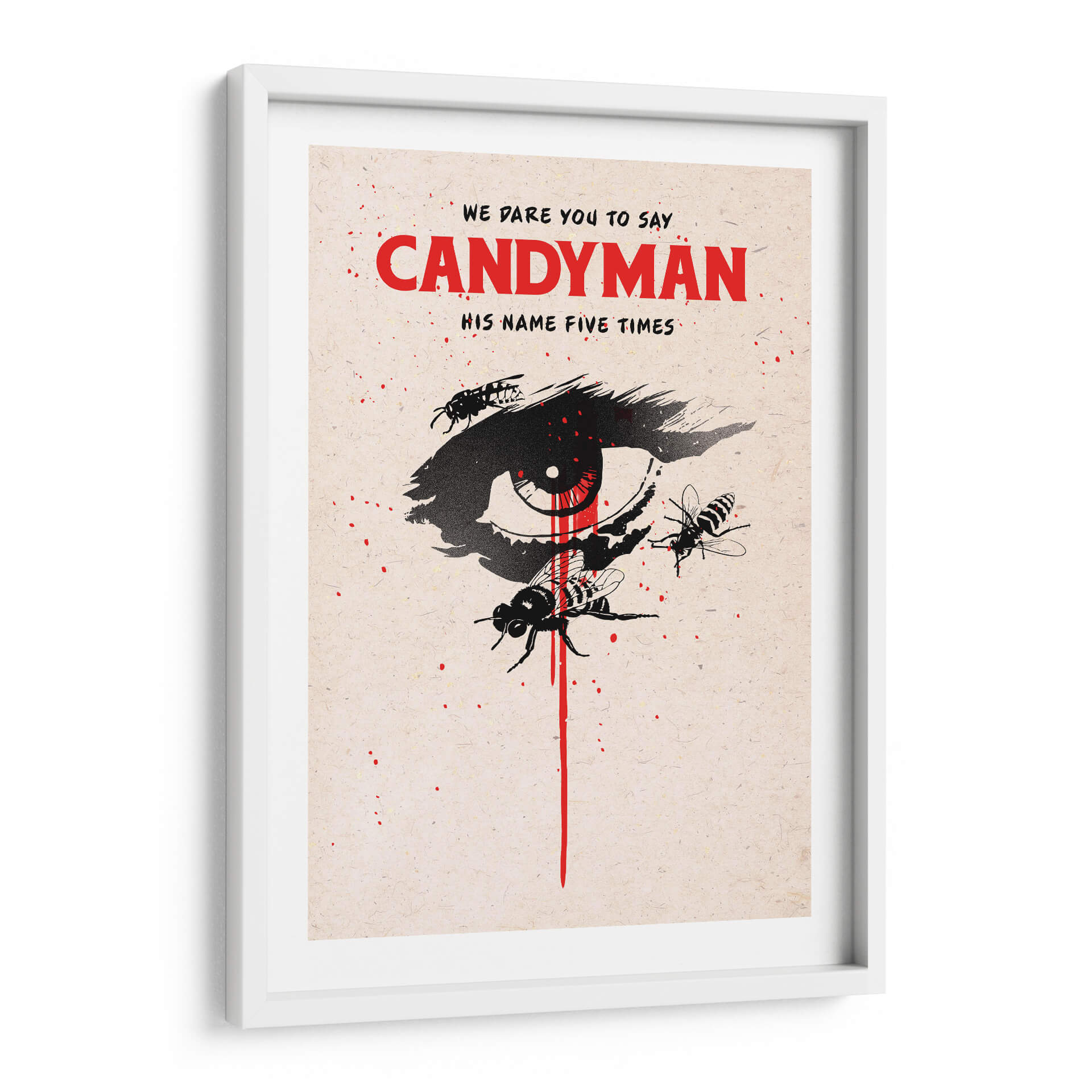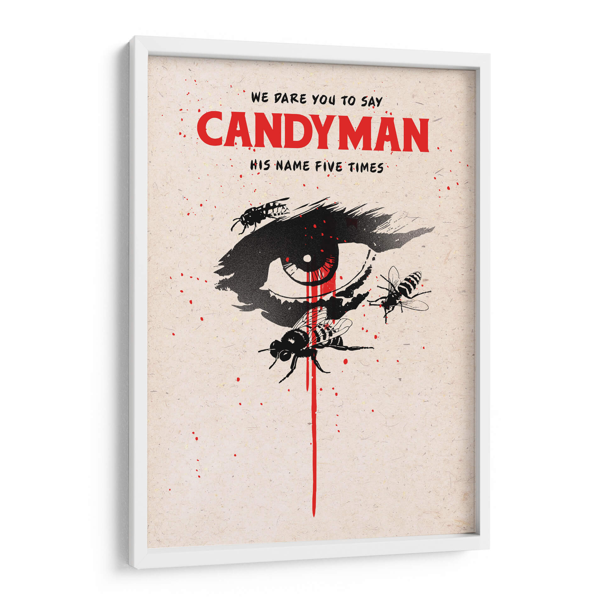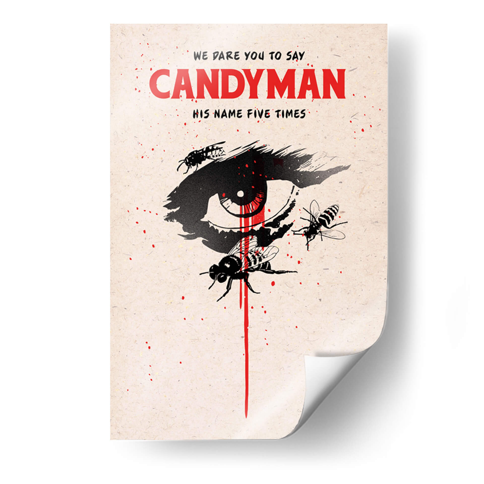 Sumérgete en la atmósfera inquietante y cautivadora de esta obra de arte inspirada en "Candyman". Este cuadro decorativo presenta un diseño audaz y gráfico que evoca el misterio y el terror psicológico de la icónica película. La imagen central es un ojo estilizado, con una mirada penetrante que parece advertir y atraer a la vez, rodeado por la silueta amenazante de insectos, posiblemente abejas o moscas, símbolos recurrentes del mito. Una cascada de sangre roja vibrante cae desde el ojo, añadiendo un toque dramático y visceral a la composición. El texto "WE DARE YOU TO SAY CANDYMAN HIS NAME FIVE TIMES" en letras rojas intensifica la narrativa, invitando a la audiencia a confrontar sus miedos. La paleta de colores se centra en un fondo texturizado de tono crudo, contrastando con el negro profundo de las siluetas y el rojo intenso de los detalles. Este cuadro es una pieza de arte contemporáneo perfecta para quienes buscan añadir un toque de intriga y audacia a su decoración, ideal para salas de estar, estudios o incluso para crear un rincón de cine en casa que hable de tu gusto por lo macabro y lo artístico. Una adición impactante para cualquier aficionado al cine de terror y al arte gráfico distintivo.