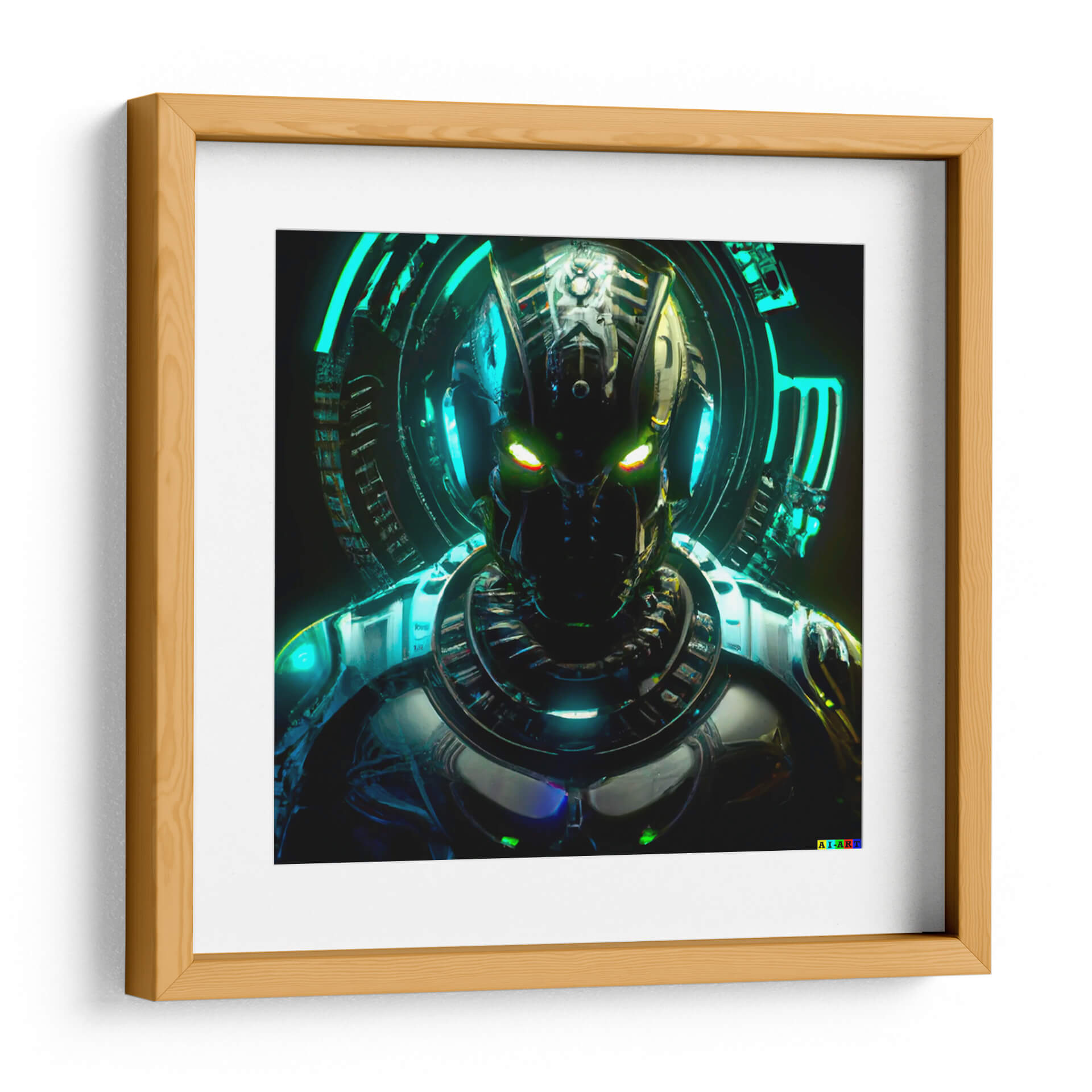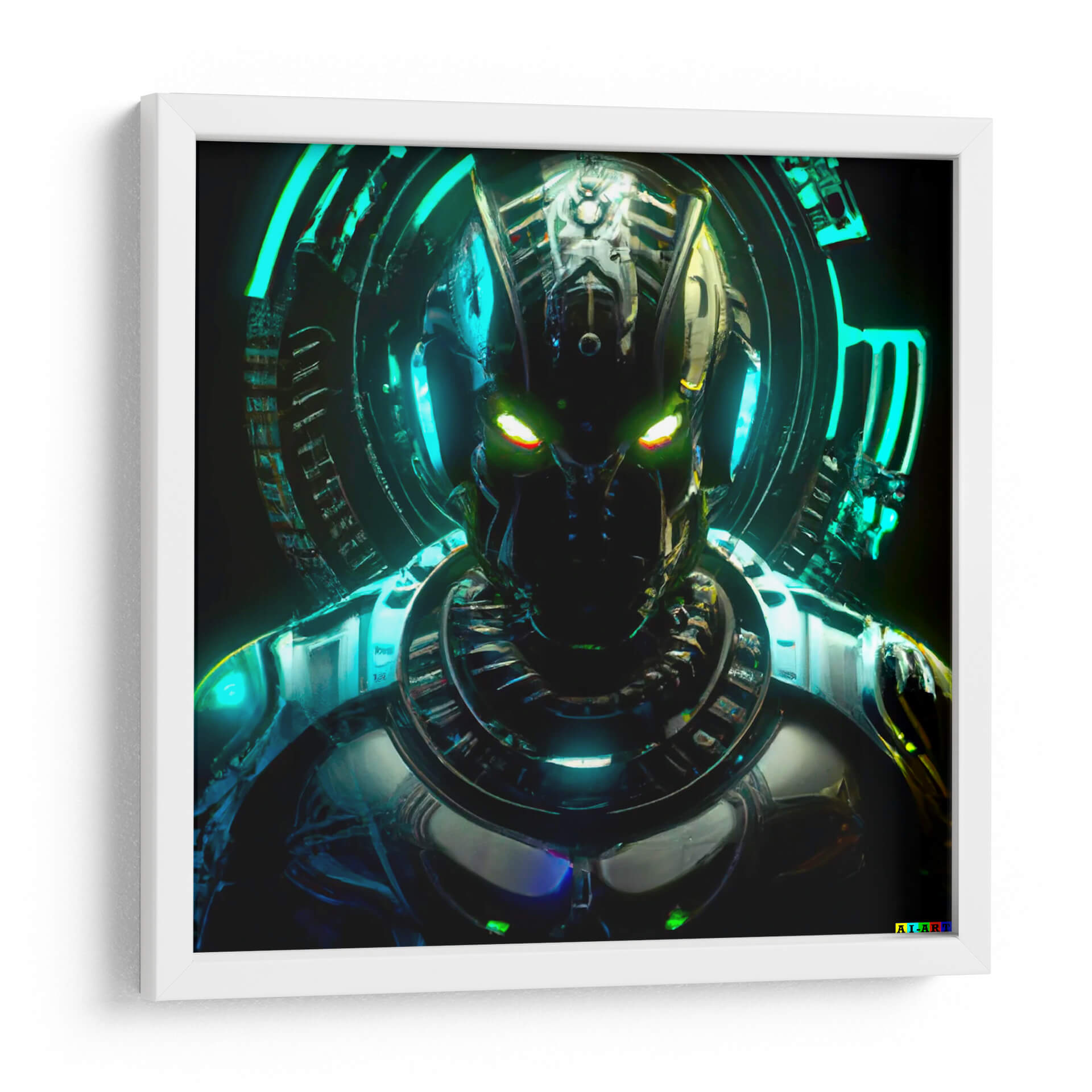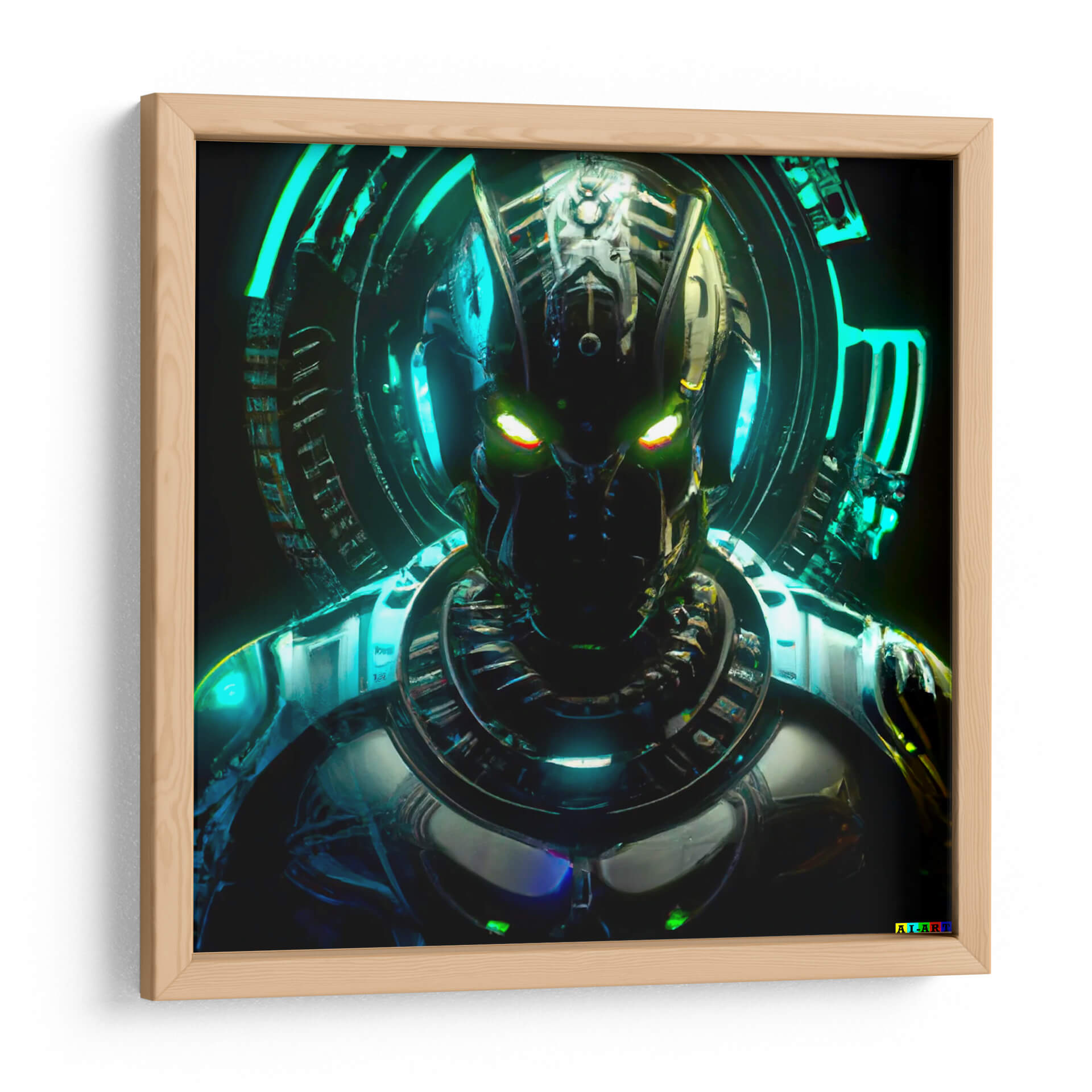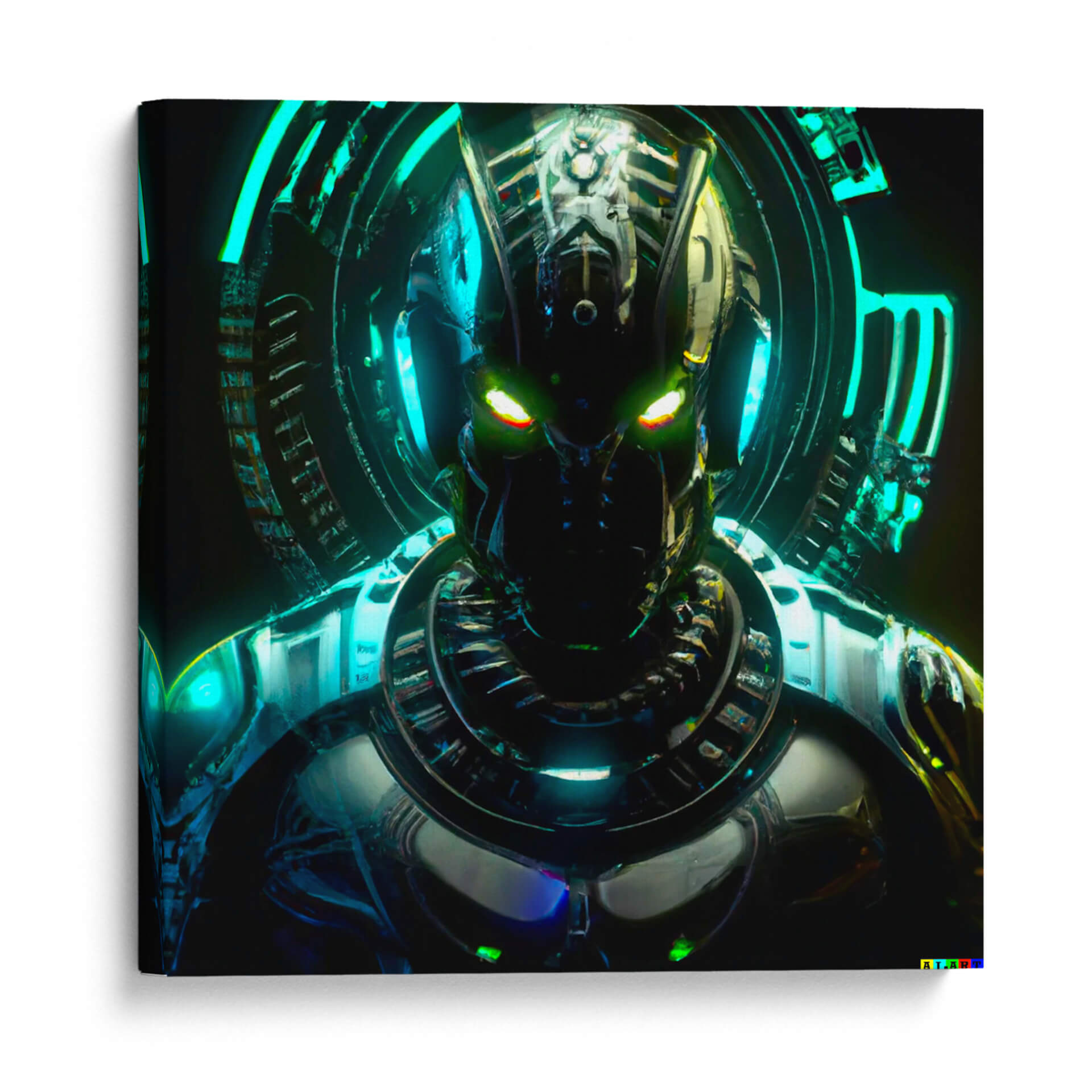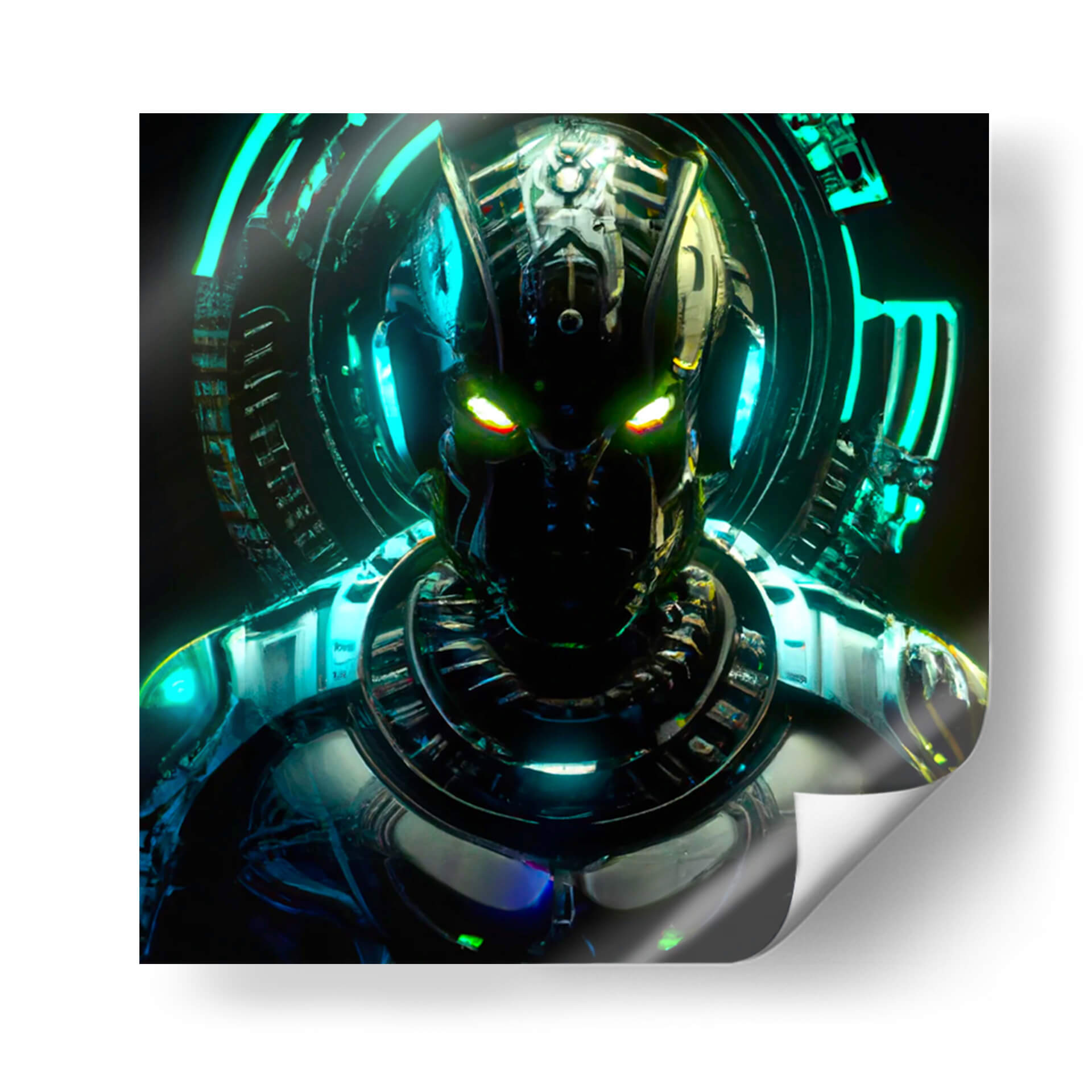 Sumérgete en el fascinante mundo de la ciencia ficción con este impactante cuadro decorativo que presenta una figura robótica enigmática. La obra, titulada 'Elnath 112T', cautiva con su detallada armadura y la intensidad de sus ojos luminosos en tonos verdes y amarillos, que parecen observar desde las profundidades del espacio o de un futuro distópico. El diseño intrincado de la cabeza y el torso del robot, junto con el aura circular de luces azul neón y turquesa que lo rodea, crean una atmósfera futurista y misteriosa. Los reflejos metálicos y las texturas complejas añaden profundidad y un toque de realismo a esta representación de inteligencia artificial. Este cuadro es ideal para añadir un toque audaz y contemporáneo a tu salón, oficina o cualquier espacio que busque una declaración de estilo vanguardista. Su paleta de colores oscuros con vibrantes acentos de neón lo convierte en una pieza de conversación que evoca intriga y admiración. Perfecto para los amantes de la tecnología, la robótica y el arte digital.