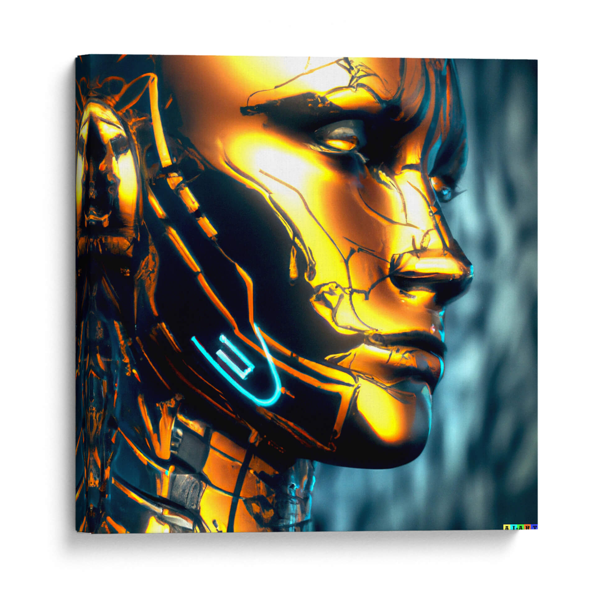 Sumérgete en la fascinante obra de arte digital 'Ghaldan AEX27' del artista AI-ART, una pieza que redefine la estética contemporánea. Este cuadro decorativo captura la esencia de una figura cibernética o androide, presentada en un perfil cautivador. La iluminación dramática resalta texturas metálicas y fluidas, con una paleta de colores que oscila entre cálidos dorados y ámbar, contrastados por vibrantes acentos de neón azul eléctrico. La composición es un primer plano íntimo que invita a la contemplación, con un fondo texturizado en tonos fríos que acentúa la tridimensionalidad y el misterio de la figura central. "Ghaldan AEX27" evoca una sensación de futurismo, inteligencia artificial y una elegancia casi humana, pero con un toque distintivo de lo artificial. Es una pieza ideal para añadir un aire de sofisticación tecnológica y vanguardista a cualquier espacio moderno, ya sea un hogar, una oficina o un estudio creativo. Transforma tu entorno con este cuadro decorativo que fusiona arte digital, ciencia ficción y una expresividad visual impactante, perfecto para quienes buscan piezas únicas que inspiren conversación y admiración.