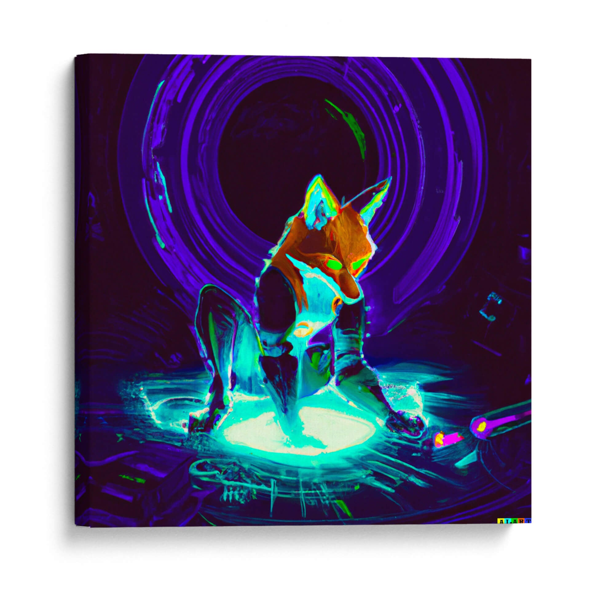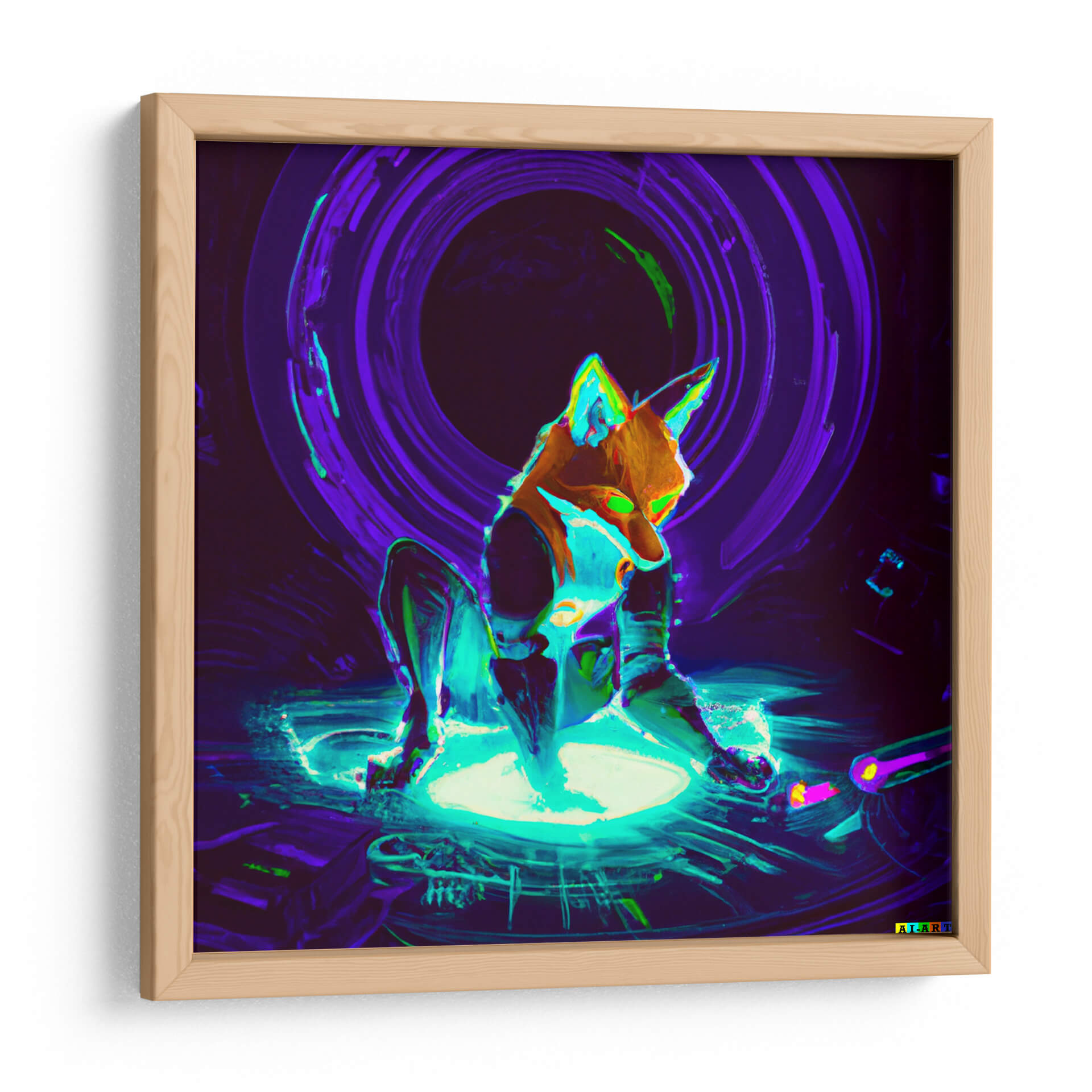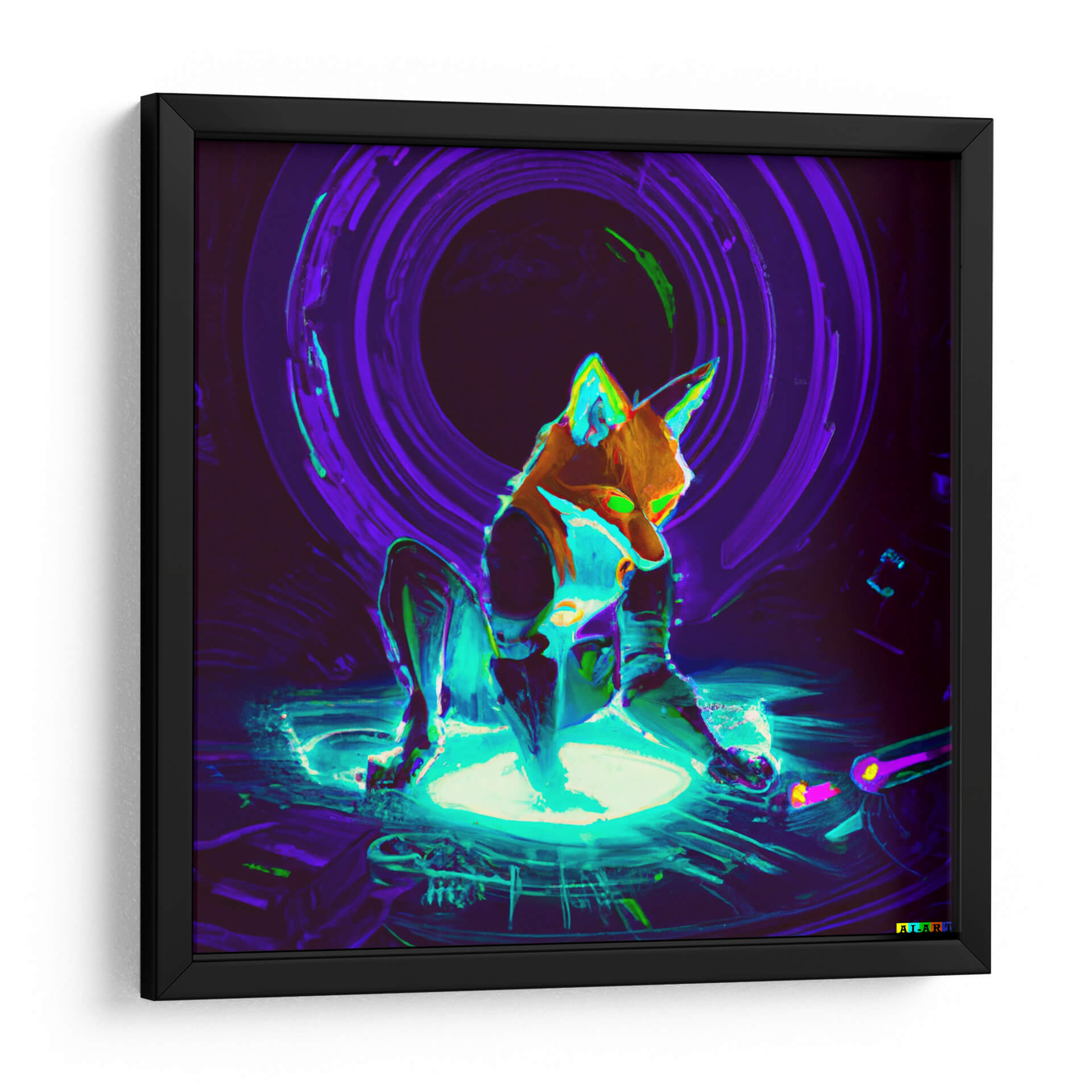 Sumérgete en la enigmática obra 'The Cyber Fox 8', una pieza de arte digital que fusiona lo orgánico con lo tecnológico en una explosión de color neón. Esta cautivadora imagen presenta una figura de zorro estilizada, representada con trazos audaces y una paleta de colores vibrantes que contrastan tonos profundos de púrpura y azul con destellos eléctricos de cian y verde lima. La composición, aunque abstracta, evoca una sensación de movimiento y energía, invitando al espectador a explorar las profundidades de un portal o un espacio cósmico. La atmósfera general es futurista y misteriosa, perfecta para aquellos que buscan un toque de vanguardia en su decoración. Este cuadro decorativo es ideal para crear un punto focal en un estudio moderno, una oficina o una sala de estar con estilo. Su diseño contemporáneo y su estética ciberpunk lo convierten en una elección audaz para quienes aprecian el arte digital y las representaciones únicas de la naturaleza animal reinterpretadas a través de la tecnología. Añade un toque de intriga y modernidad a tu hogar con esta obra única que desafía los límites entre la realidad y la fantasía digital, capturando la imaginación y generando conversación.