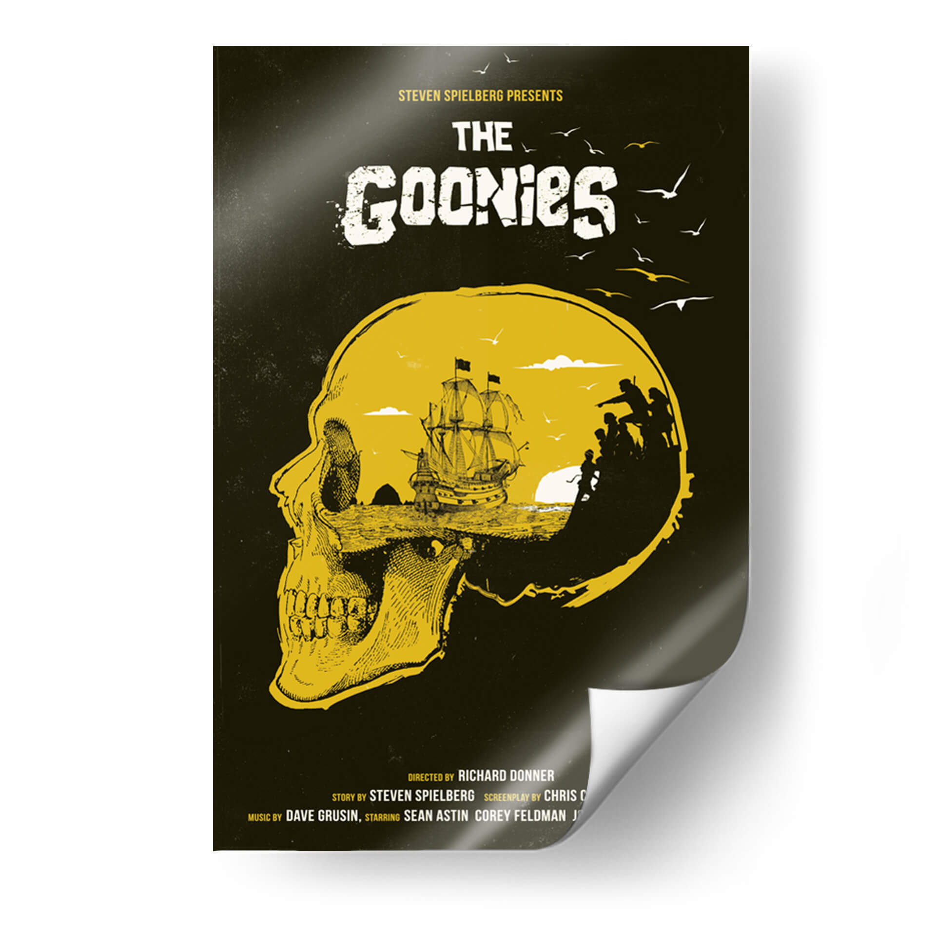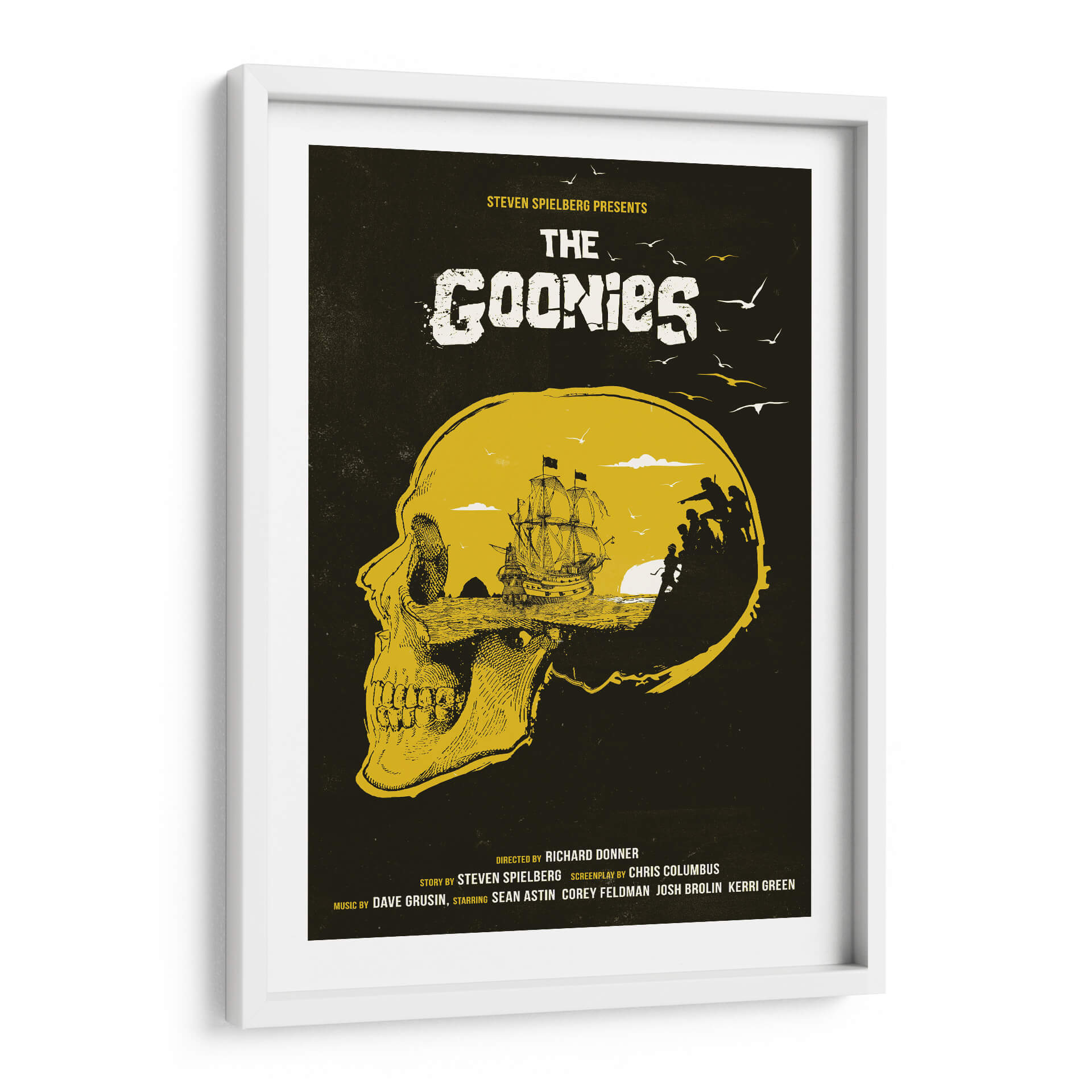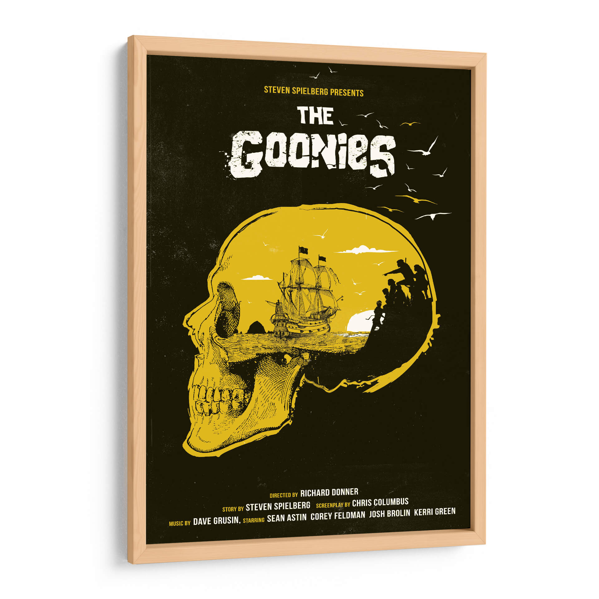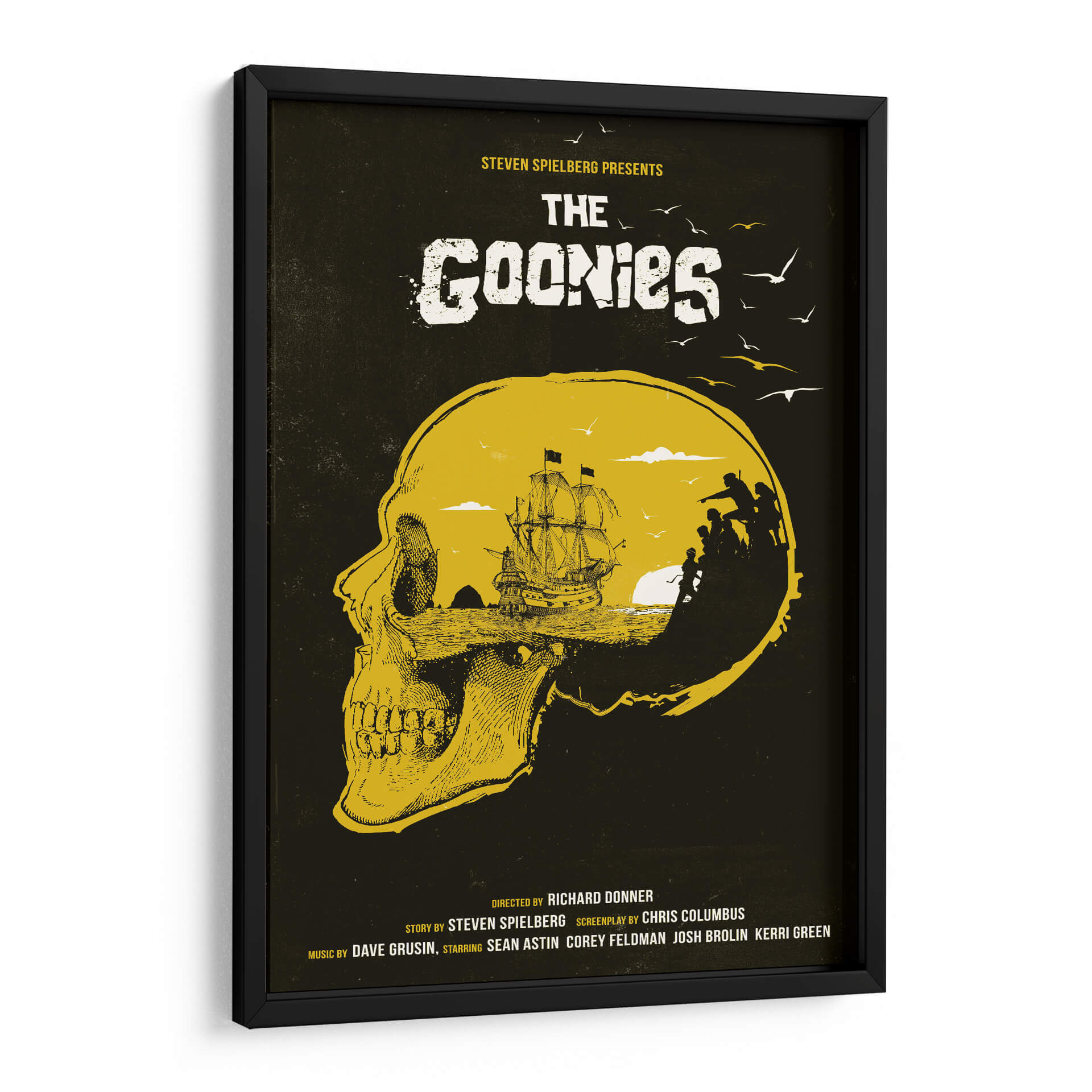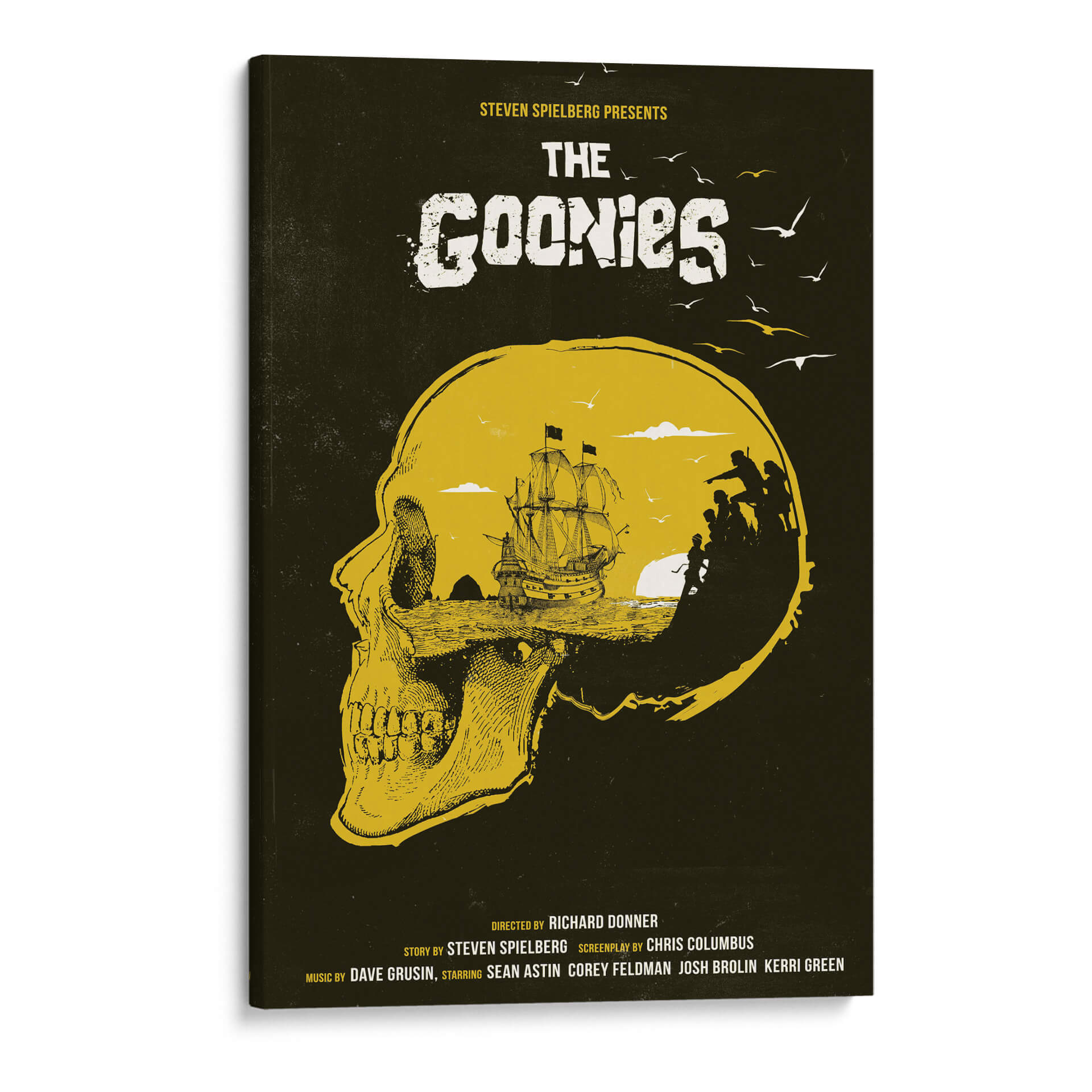 Sumérgete en la aventura y el misterio con este evocador cuadro decorativo inspirado en la icónica película "The Goonies". La obra presenta una impactante representación visual que fusiona un cráneo detallado en primer plano con un paisaje marino y una tripulación en silueta, evocando el espíritu de exploración y descubrimiento. La paleta de colores, dominada por tonos tierra y un vibrante amarillo ocre sobre un fondo oscuro, crea una atmósfera de intriga y nostalgia. Este diseño, con su estilo gráfico y detallado, es perfecto para añadir un toque de fantasía y recuerdo a cualquier espacio. Ideal para salas de estar, estudios o habitaciones temáticas, este cuadro decorativo es un homenaje a una generación y a las aventuras que marcaron la infancia de muchos. Su composición única capta la esencia de la búsqueda del tesoro y la camaradería, convirtiéndola en una pieza central que invita a la conversación y despierta la imaginación. Añade este toque de nostalgia cinematográfica a tu decoración y revive la magia de "The Goonies" en tu hogar u oficina.