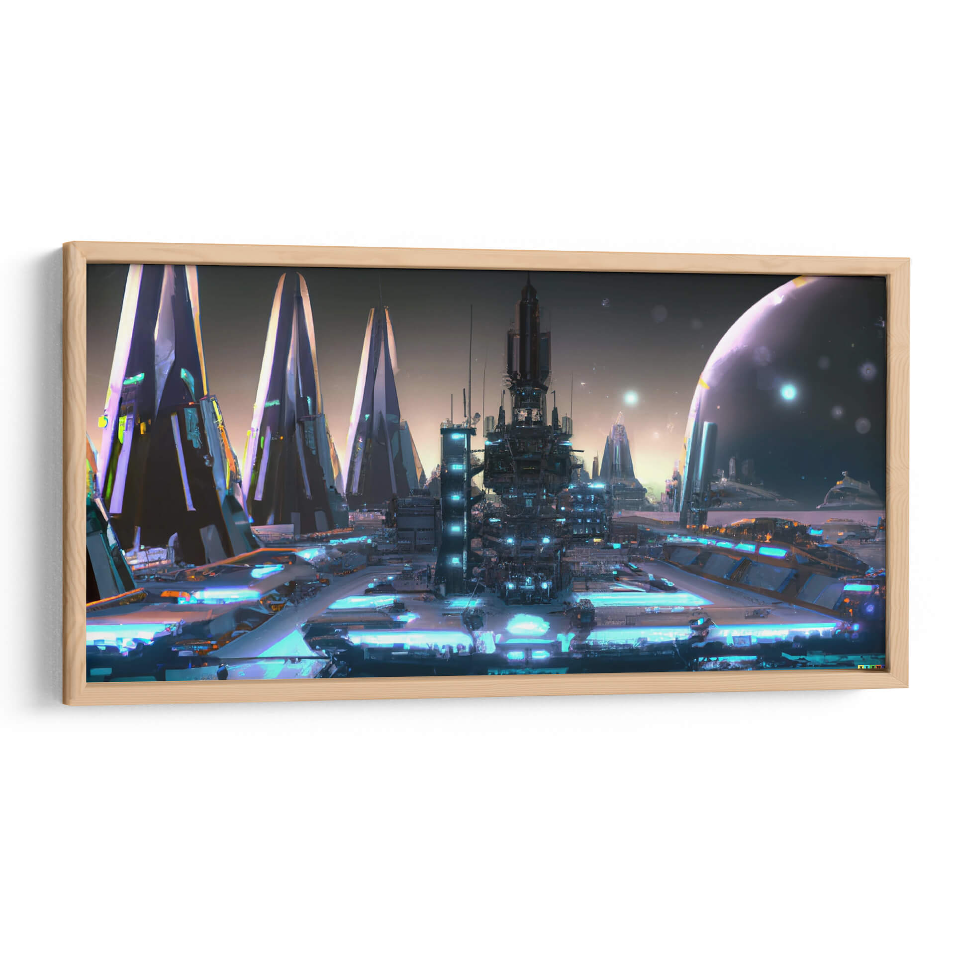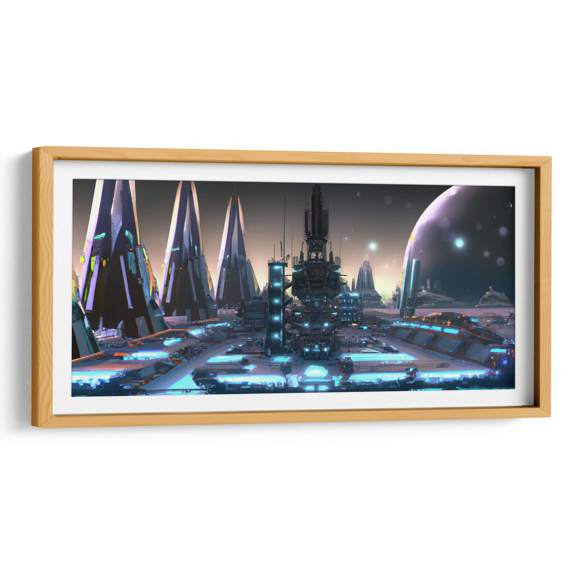 Adéntrate en un futuro distópico y fascinante con 'Akar Star Base', un cuadro decorativo que te transportará a una metrópoli futurista. Esta obra de arte digital, generada por AI-ART, presenta una visión audaz de una ciudad espacial avanzada, dominada por imponentes estructuras piramidales y una torre central que se alza majestuosamente. La paleta de colores, caracterizada por intensos tonos azules eléctricos que contrastan con el oscuro cielo espacial y los cálidos ocres del horizonte, crea una atmósfera de misterio y tecnología. Las luces brillantes y los detalles intrincados de la arquitectura sugieren una civilización avanzada y un bullicioso centro de actividad. Este cuadro decorativo es perfecto para aquellos que buscan infundir a su hogar u oficina un aire de ciencia ficción y modernidad. Ideal como punto focal en una sala de estar contemporánea o para inspirar la creatividad en un estudio. 'Akar Star Base' es más que una decoración; es una ventana a otro mundo, una pieza de arte que invita a la contemplación sobre el futuro y la exploración espacial.