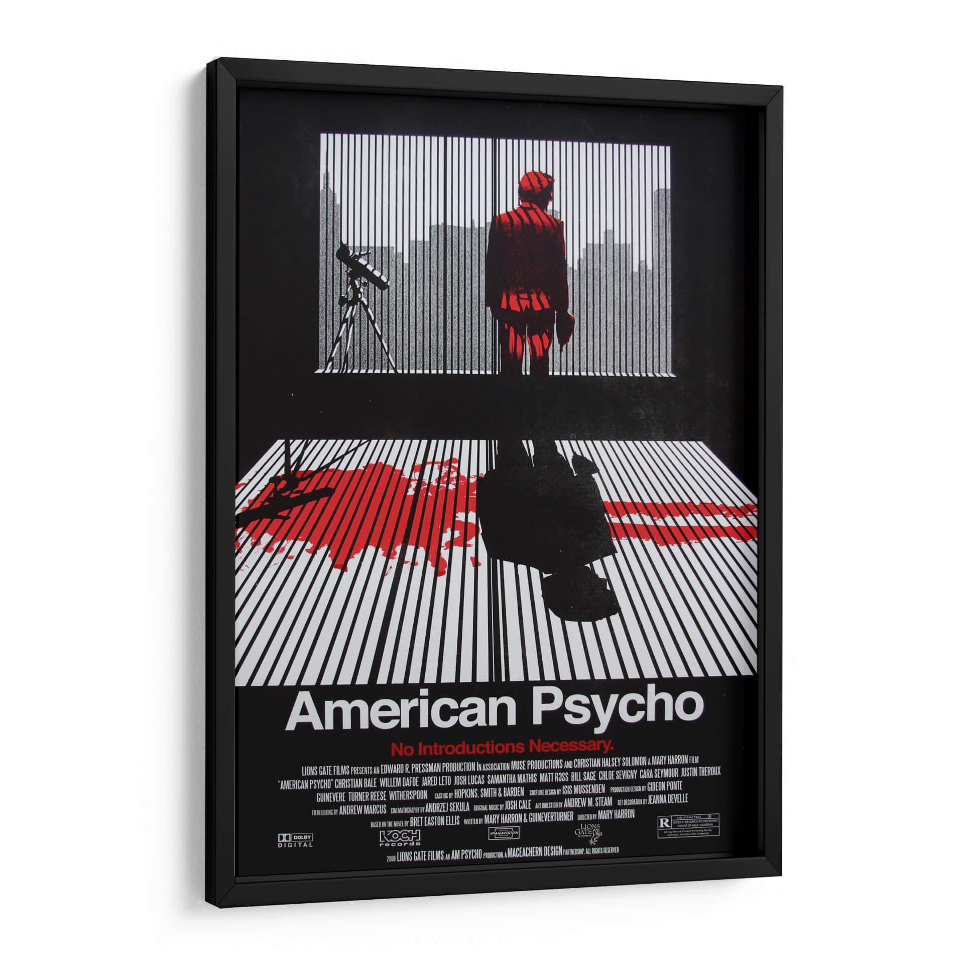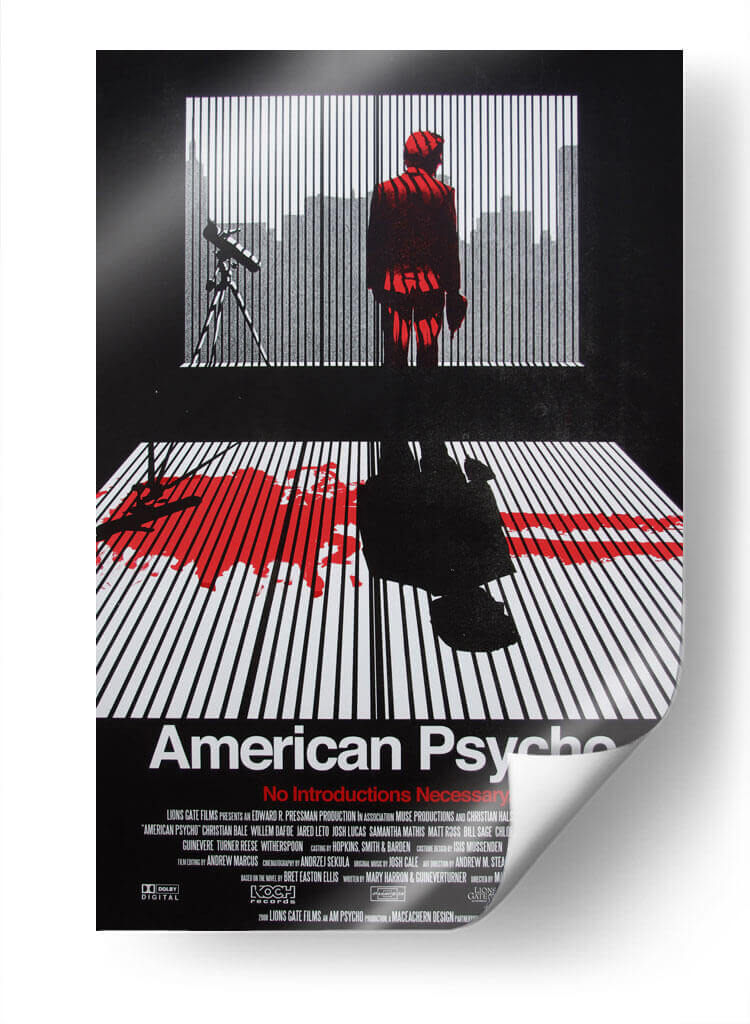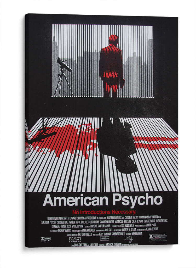 Sumérgete en el oscuro y fascinante mundo de "American Psycho" con este impactante cuadro decorativo. La obra captura la esencia inquietante de la película, presentando una figura solitaria en un traje rojo vibrante parada frente a una ventana con persianas, con una silueta urbana difuminada al fondo. La composición se ve intensificada por la mancha de sangre roja sobre un suelo de líneas blancas y negras, evocando una atmósfera de suspense y misterio. Los contrastes dramáticos entre el negro profundo, el blanco nítido y el rojo sangre crean una pieza visualmente poderosa que no dejará indiferente a nadie. Este cuadro decorativo es ideal para amantes del cine de culto y para aquellos que buscan añadir un toque audaz y reflexivo a su decoración, ya sea en una sala de estar moderna, un estudio o un espacio de entretenimiento. Transmite una sensación de intriga psicológica y un estilo contemporáneo, perfecto para inspirar conversaciones y crear un punto focal único en cualquier habitación. Añade esta pieza cinematográfica a tu colección y deja que su intensidad transforme tu espacio vital.