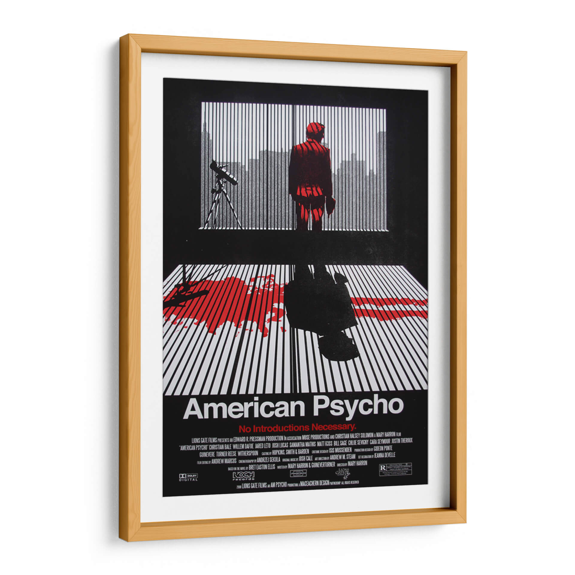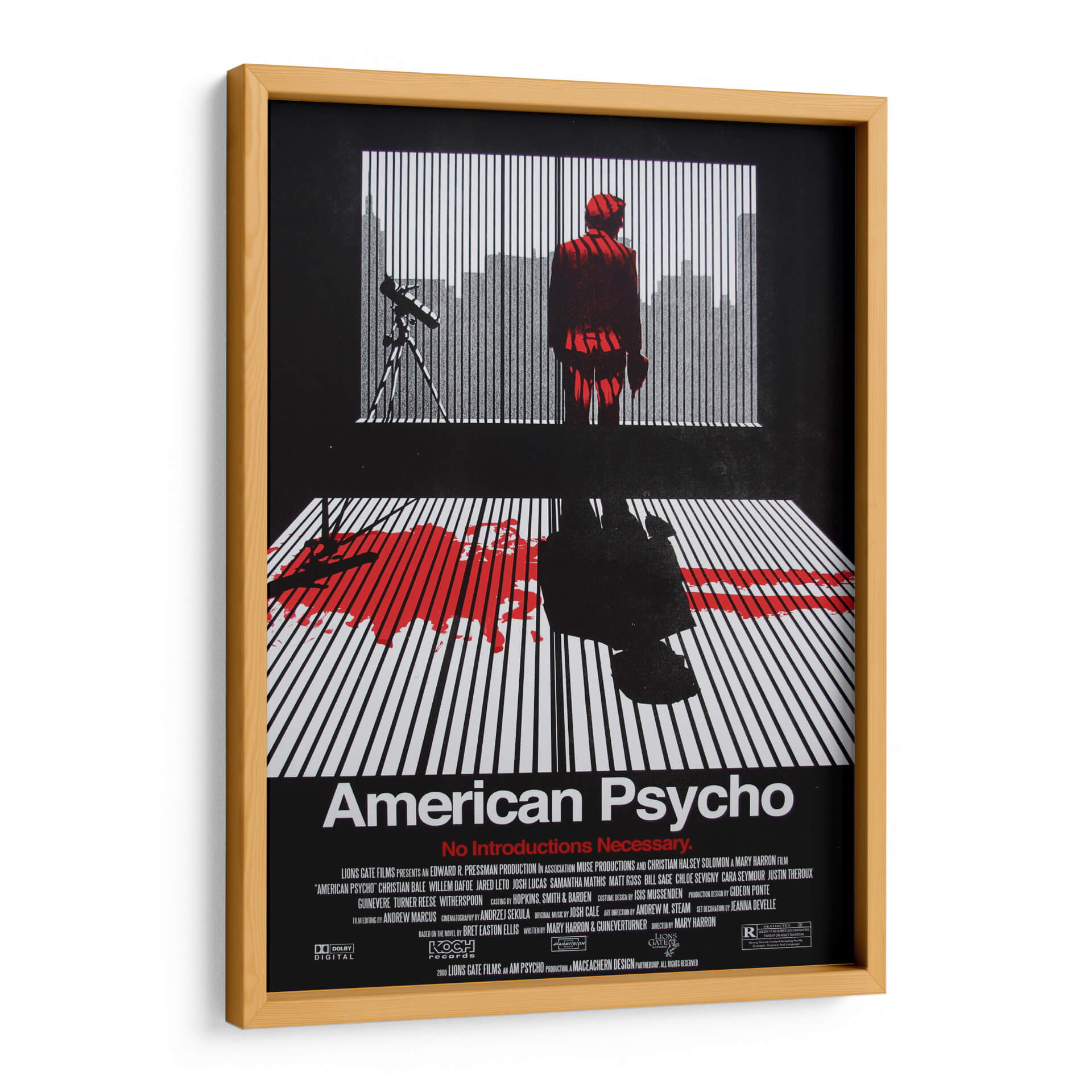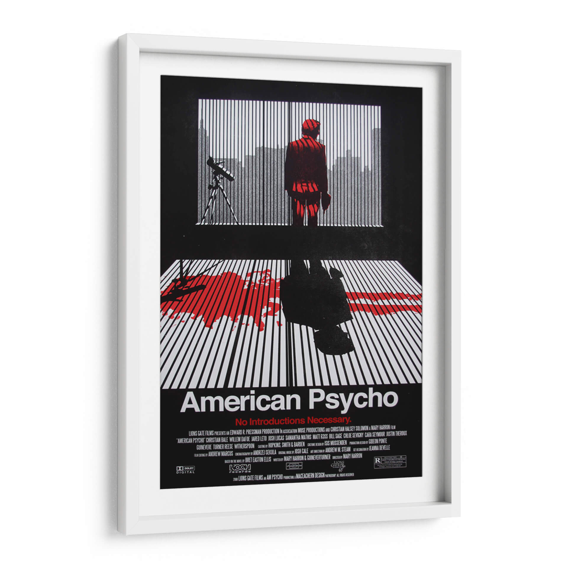 Sumérgete en el oscuro y fascinante mundo de "American Psycho" con este impactante cuadro decorativo. La obra captura la esencia inquietante de la película, presentando una figura solitaria en un traje rojo vibrante parada frente a una ventana con persianas, con una silueta urbana difuminada al fondo. La composición se ve intensificada por la mancha de sangre roja sobre un suelo de líneas blancas y negras, evocando una atmósfera de suspense y misterio. Los contrastes dramáticos entre el negro profundo, el blanco nítido y el rojo sangre crean una pieza visualmente poderosa que no dejará indiferente a nadie. Este cuadro decorativo es ideal para amantes del cine de culto y para aquellos que buscan añadir un toque audaz y reflexivo a su decoración, ya sea en una sala de estar moderna, un estudio o un espacio de entretenimiento. Transmite una sensación de intriga psicológica y un estilo contemporáneo, perfecto para inspirar conversaciones y crear un punto focal único en cualquier habitación. Añade esta pieza cinematográfica a tu colección y deja que su intensidad transforme tu espacio vital.
