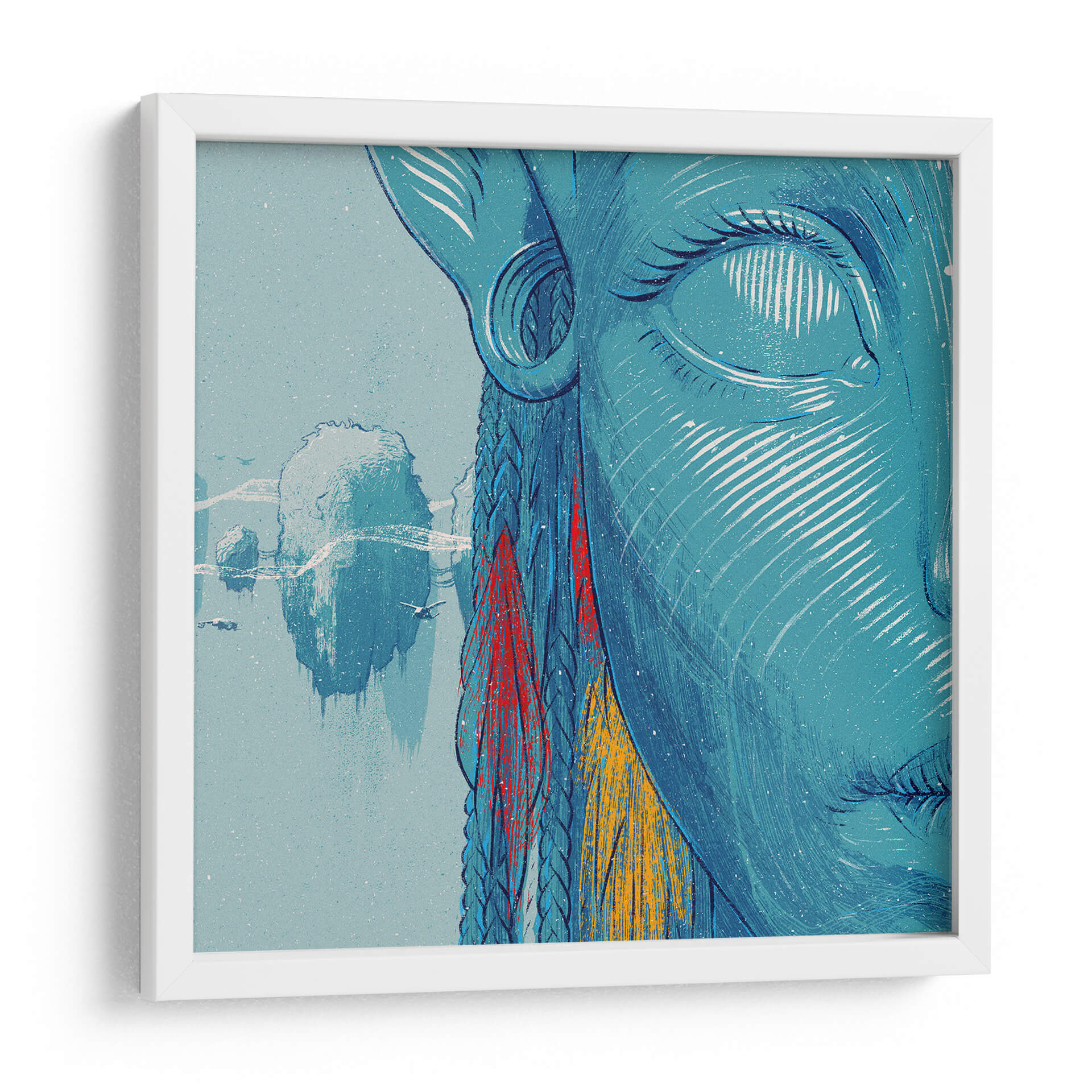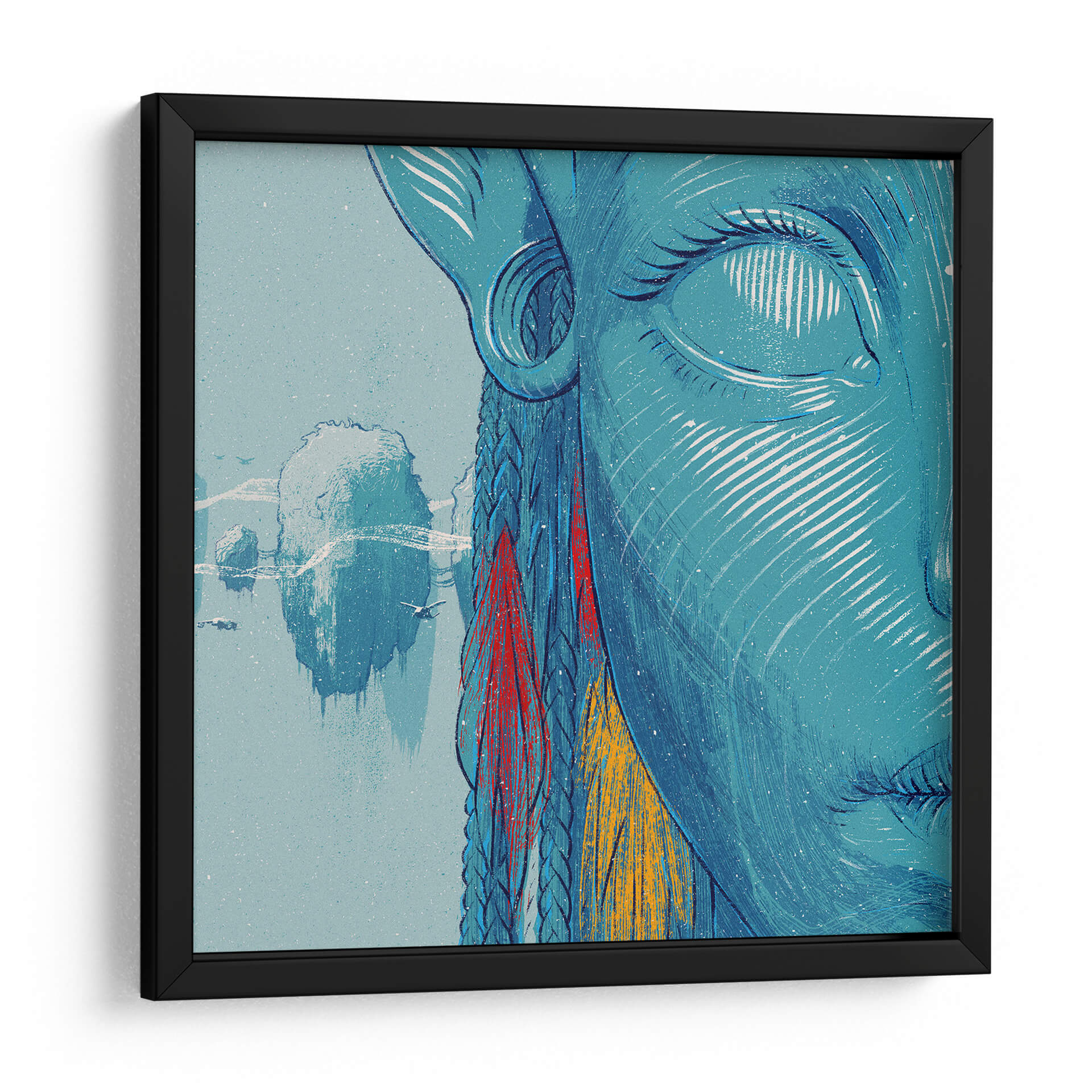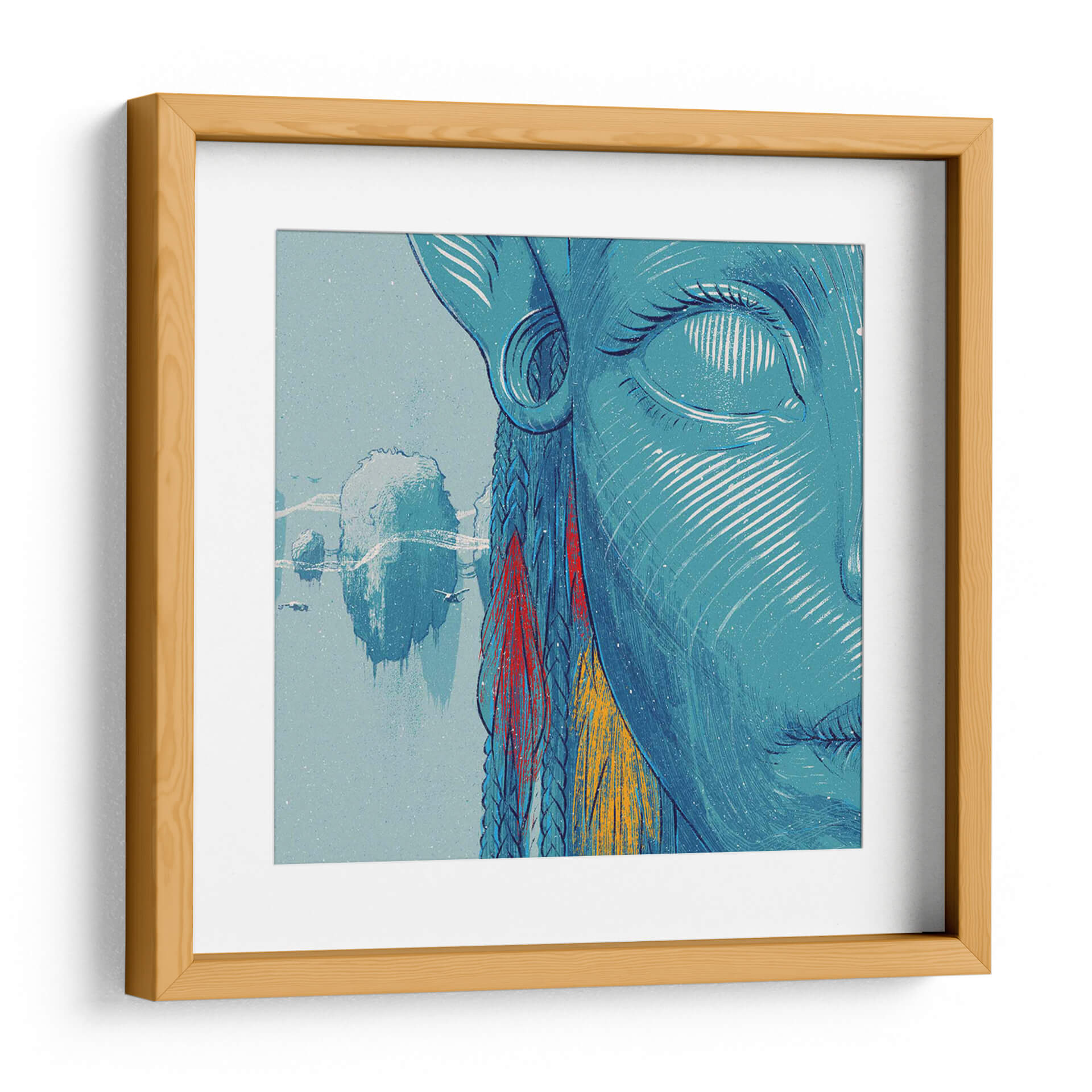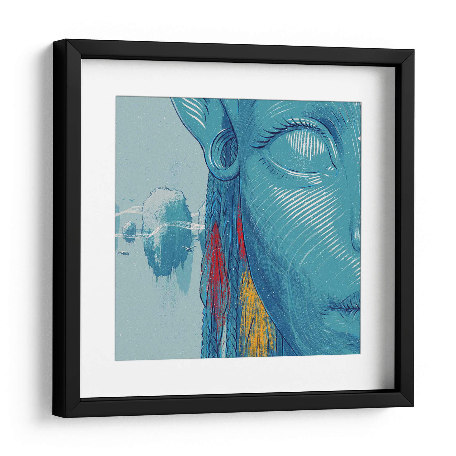 Sumérgete en el enigmático mundo de "Avatar Soft", un cuadro decorativo que captura la esencia de un rostro sereno y etéreo. La obra se centra en un primer plano de un personaje con piel azulada, resaltando sus rasgos delicados y la profundidad de sus ojos cerrados, que invitan a la contemplación. La paleta de colores, dominada por tonos fríos de azul y turquesa, evoca una atmósfera de calma y serenidad, contrastada sutilmente por toques vibrantes de rojo y amarillo en las trenzas del personaje. La composición, con elementos fantásticos como islas flotantes y aves en un cielo pálido al fondo, añade un toque de misterio y escapismo a la pieza. El estilo gráfico, con líneas finas y texturas sutiles, le otorga un aire moderno y distintivo. Este cuadro decorativo es ideal para añadir un punto focal intrigante y lleno de paz a tu sala de estar, dormitorio o estudio, transformando cualquier espacio en un santuario personal de arte y tranquilidad. "Avatar Soft" es más que una imagen; es una invitación a la introspección y a la exploración de mundos imaginarios, perfecta para amantes del arte contemporáneo y la fantasía.
