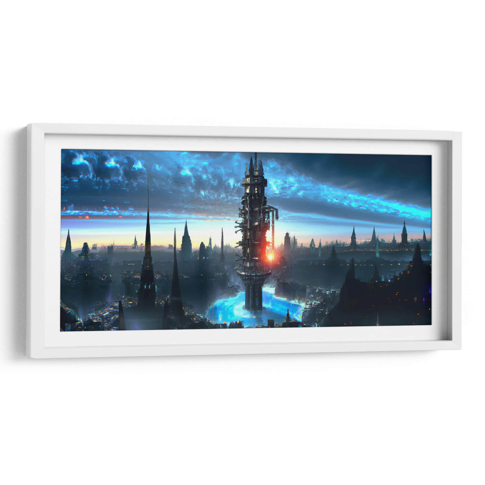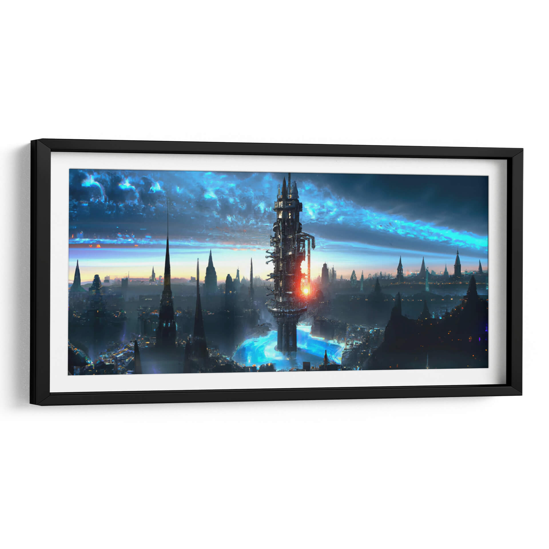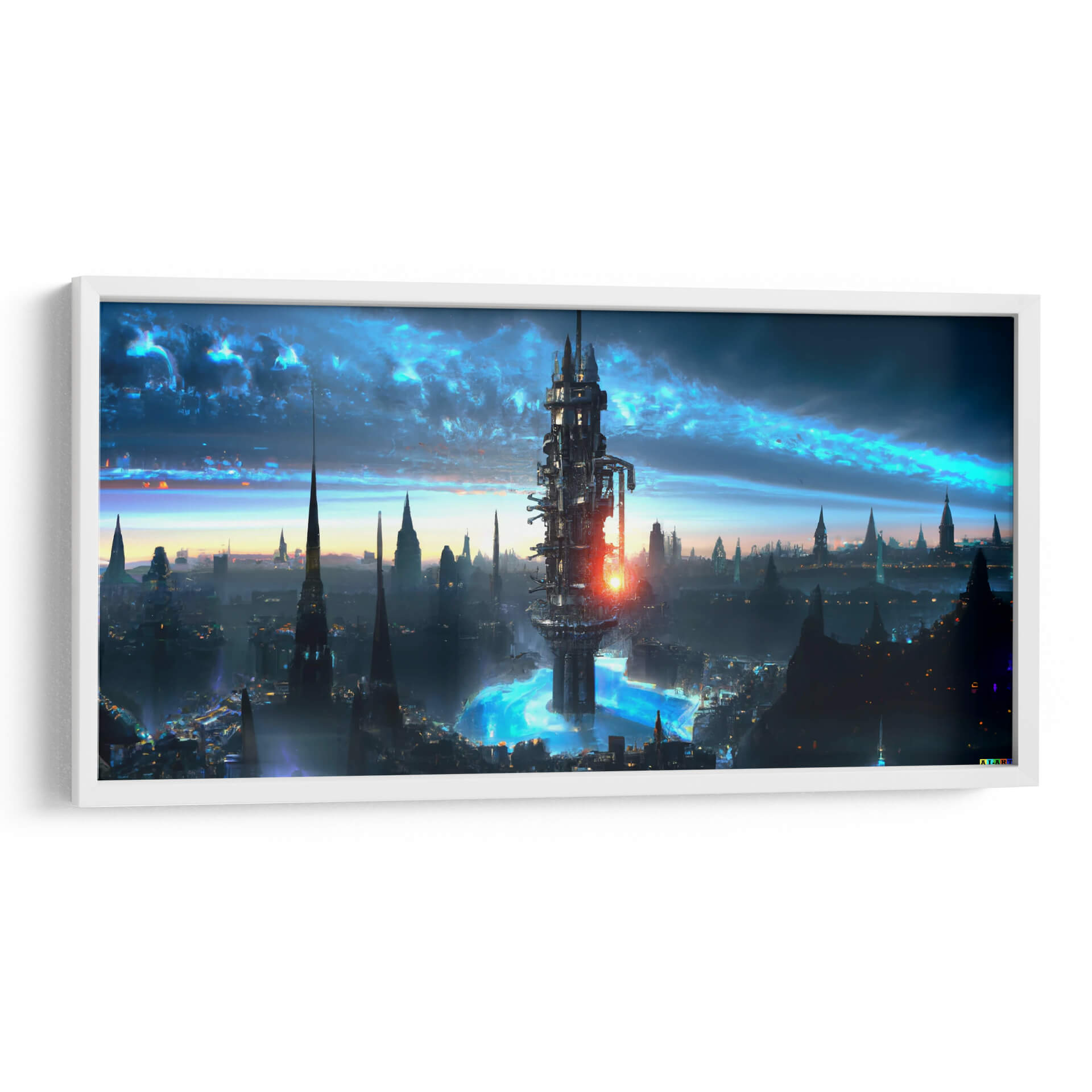 Sumérgete en el futurismo y la maravilla tecnológica con "Energy Distribution Tower", una obra de arte digital que captura la esencia de una metrópolis avanzada. Esta pieza visualmente impactante presenta una imponente torre central, que irradia una energía azul vibrante desde su base, elevándose hacia un cielo dramático surcado por nubes intensas y electrificadas. La ciudad que se extiende a sus pies está salpicada de luces cálidas y estructuras puntiagudas, creando un contraste fascinante entre la fría modernidad y un toque de calidez urbana. La paleta de colores, dominada por azules profundos y luminosos, junto con toques de naranja y dorado del atardecer y las luces de la ciudad, genera una atmósfera de misterio, poder y exploración. Ideal para espacios que buscan un toque de ciencia ficción, modernidad o una declaración audaz, este cuadro decorativo es perfecto para salas de estar, oficinas o estudios que inspiren innovación y visión de futuro. Añade un elemento de asombro y sofisticación a tu decoración con esta representación cautivadora de un mundo de alta tecnología y energía.