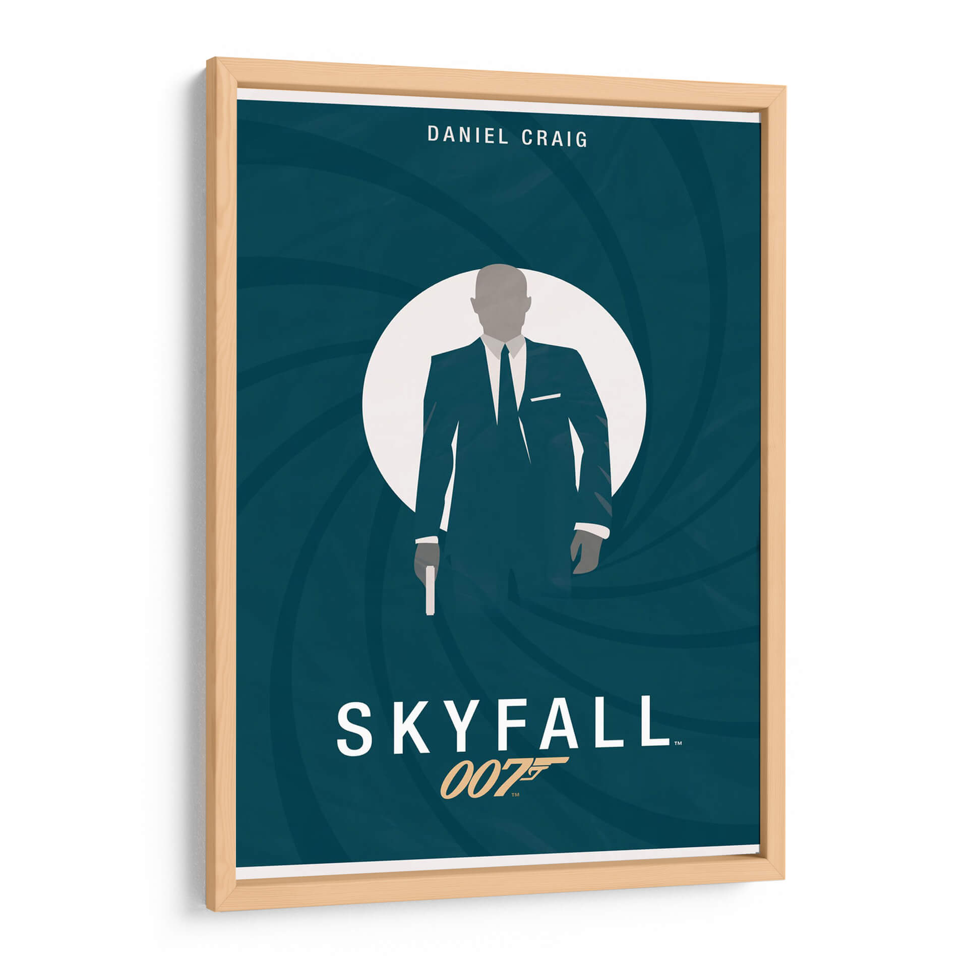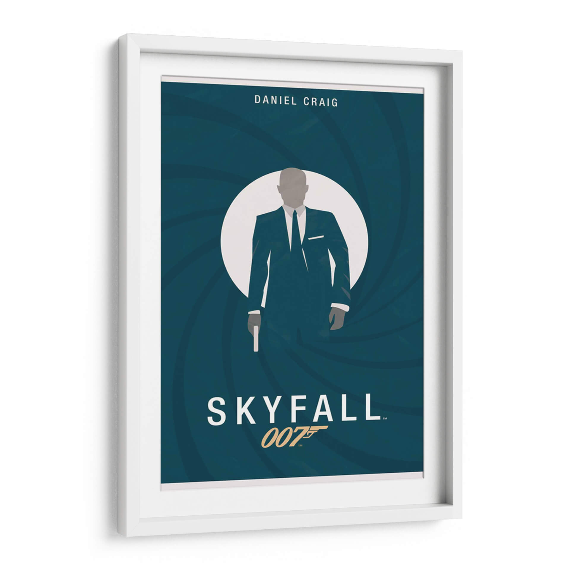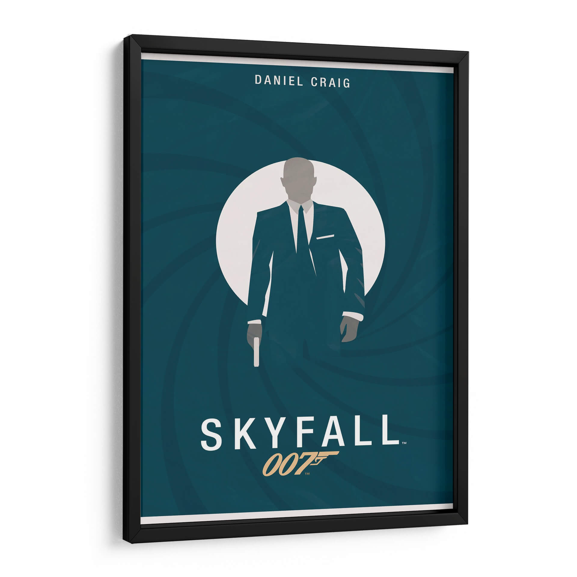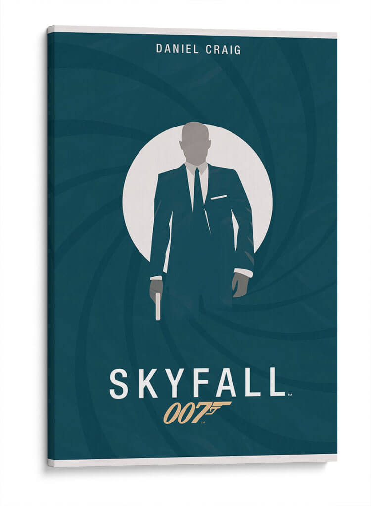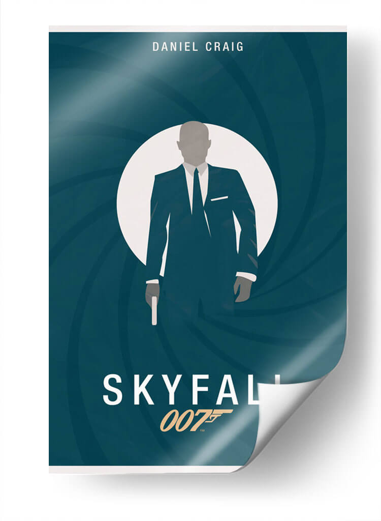 Sumérgete en el mundo del espionaje y el estilo con esta cautivadora obra de arte inspirada en James Bond. La pieza presenta una silueta estilizada de un agente secreto, vestida con un impecable traje oscuro y corbata, emergiendo de un círculo blanco que evoca la icónica mira de una pistola. El fondo, un profundo y enigmático color azul verdoso con remolinos concéntricos, crea una sensación de movimiento y suspense, a la vez que aporta un toque de sofisticación moderna. El diseño minimalista, con una paleta de colores limitada pero efectiva, resalta la figura central y evoca una atmósfera de misterio, intriga y elegancia atemporal. El título "Skyfall" y la referencia "007" se integran sutilmente, añadiendo un guiño inconfundible a los fanáticos de la saga. Esta lámina es perfecta para añadir un toque de distinción y conversación a tu sala de estar, estudio u oficina, ideal para aquellos que aprecian el cine clásico y el diseño contemporáneo. Un verdadero homenaje a un ícono de la cultura pop que nunca pasa de moda.