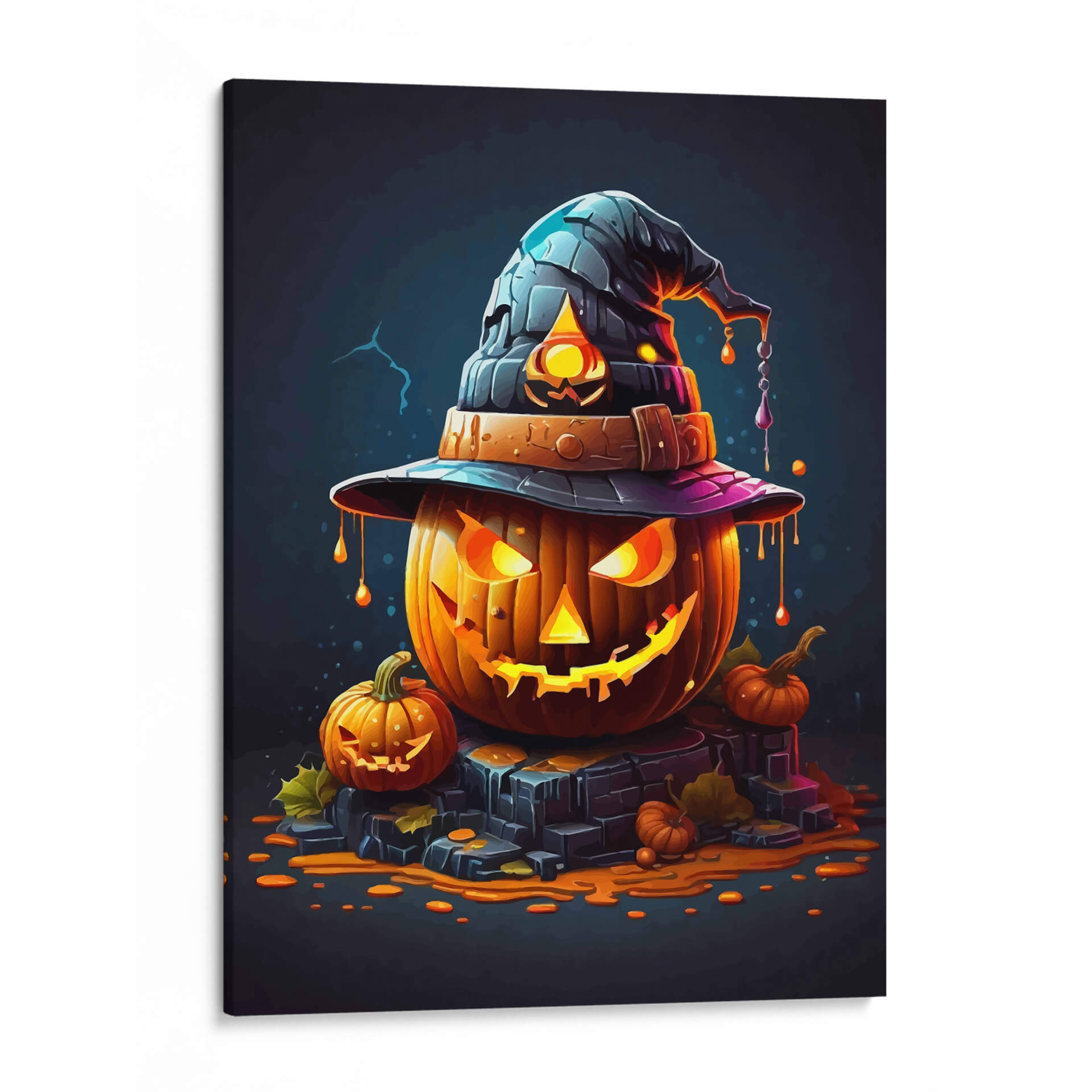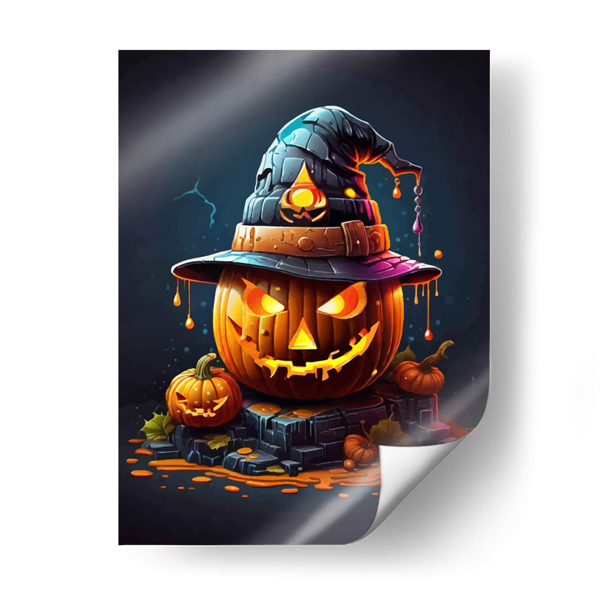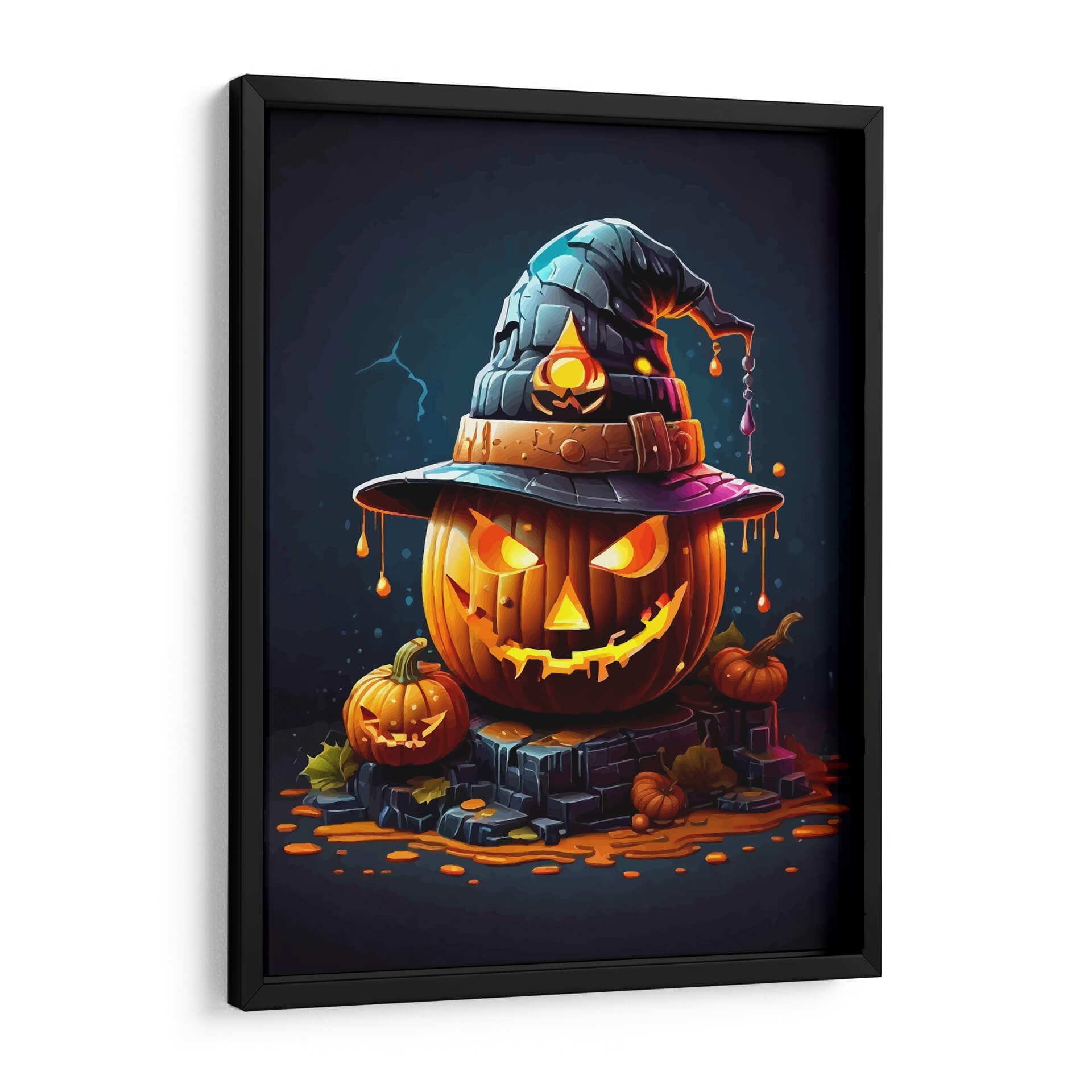 Transforma tu espacio con el enigmático encanto de "La Calabaza de Halloween", una obra de arte digital que captura la esencia de la temporada con un toque de misterio y fantasía. Esta pieza presenta una calabaza principal, tallada con una expresión traviesa y una luminiscencia interior que irradia calidez y un aire de intriga. Coronándola, un sombrero de bruja oscuro con detalles texturizados y un ribete púrpura añade un elemento lúdico y mágico. Alrededor, pequeñas calabazas y hojas de otoño esparcidas sobre una base de piedra oscura evocan la atmósfera acogedora y ligeramente escalofriante de una noche de octubre. La paleta de colores, dominada por naranjas vibrantes, negros profundos y toques de púrpura y azul, crea un contraste llamativo y visualmente cautivador. El estilo artístico, con sus contornos definidos y la iluminación dramática, le otorga una cualidad casi caricaturesca pero sofisticada, ideal para quienes buscan una decoración temática única y con personalidad. Este cuadro decorativo es perfecto para añadir un acento festivo y artístico a tu salón, comedor, o incluso a un espacio de entretenimiento, creando un ambiente acogedor y lleno de espíritu otoñal. "La Calabaza de Halloween" no es solo una decoración, es una invitación a celebrar la temporada con estilo y originalidad, convirtiéndose en un punto focal que atraerá miradas y conversaciones.