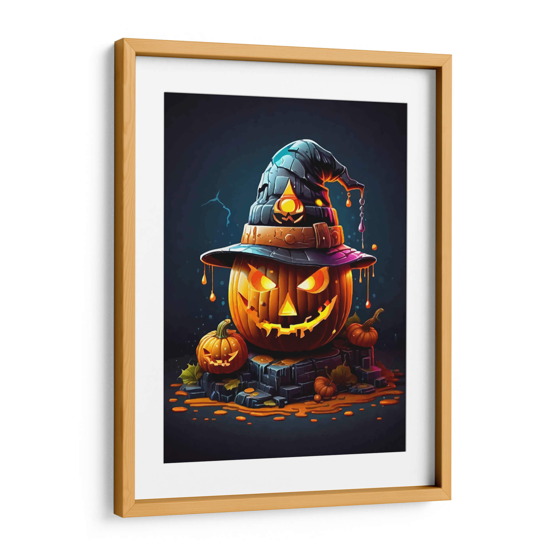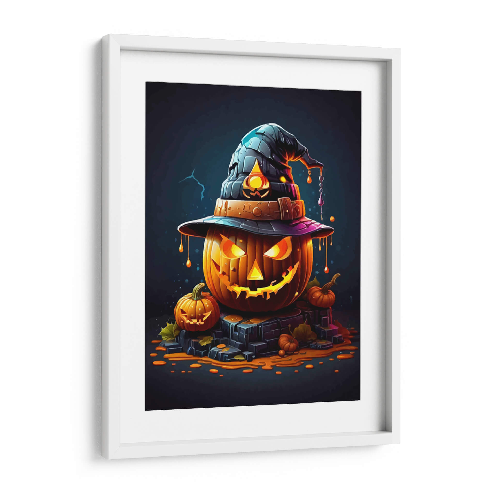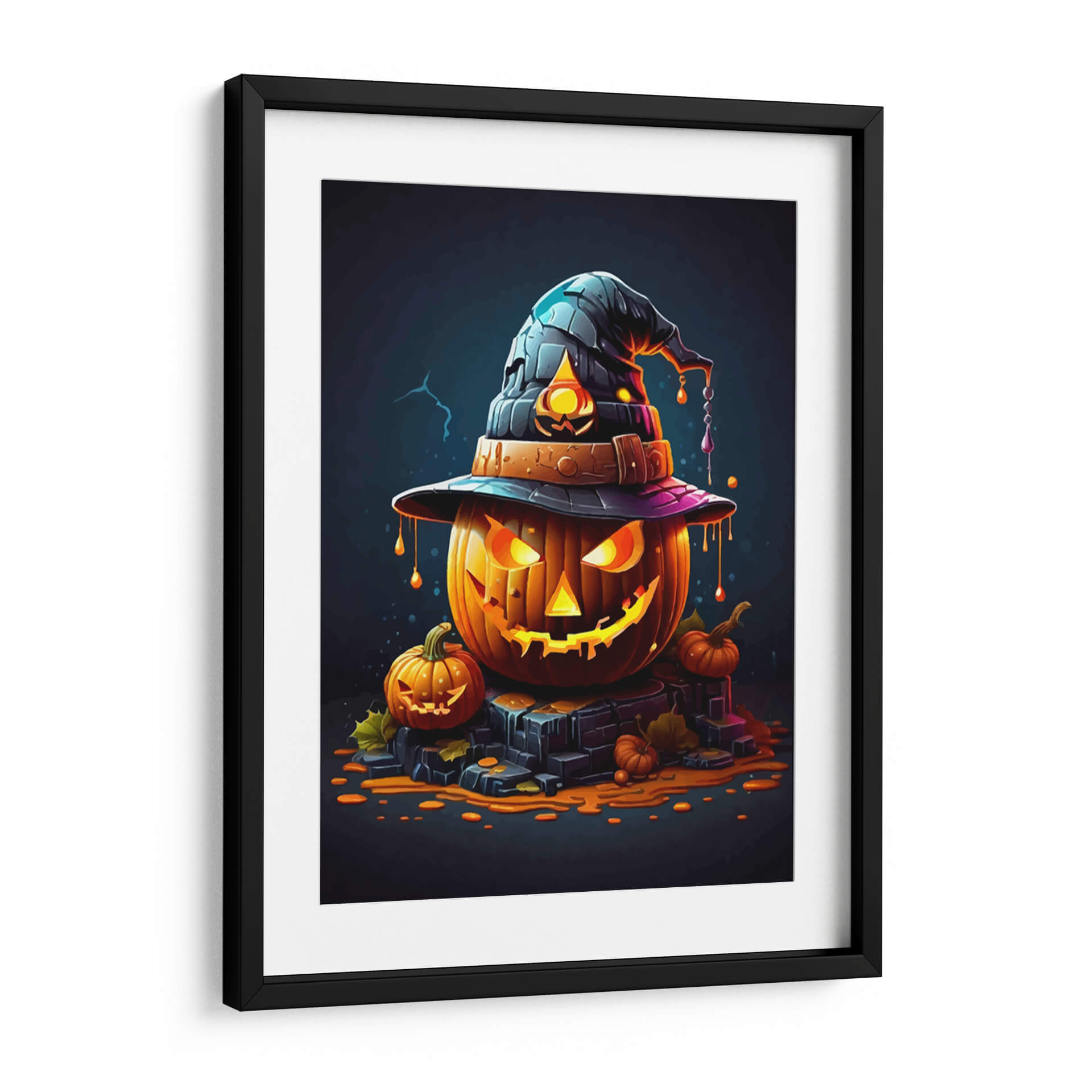 Transforma tu espacio con el enigmático encanto de "La Calabaza de Halloween", una obra de arte digital que captura la esencia de la temporada con un toque de misterio y fantasía. Esta pieza presenta una calabaza principal, tallada con una expresión traviesa y una luminiscencia interior que irradia calidez y un aire de intriga. Coronándola, un sombrero de bruja oscuro con detalles texturizados y un ribete púrpura añade un elemento lúdico y mágico. Alrededor, pequeñas calabazas y hojas de otoño esparcidas sobre una base de piedra oscura evocan la atmósfera acogedora y ligeramente escalofriante de una noche de octubre. La paleta de colores, dominada por naranjas vibrantes, negros profundos y toques de púrpura y azul, crea un contraste llamativo y visualmente cautivador. El estilo artístico, con sus contornos definidos y la iluminación dramática, le otorga una cualidad casi caricaturesca pero sofisticada, ideal para quienes buscan una decoración temática única y con personalidad. Este cuadro decorativo es perfecto para añadir un acento festivo y artístico a tu salón, comedor, o incluso a un espacio de entretenimiento, creando un ambiente acogedor y lleno de espíritu otoñal. "La Calabaza de Halloween" no es solo una decoración, es una invitación a celebrar la temporada con estilo y originalidad, convirtiéndose en un punto focal que atraerá miradas y conversaciones.