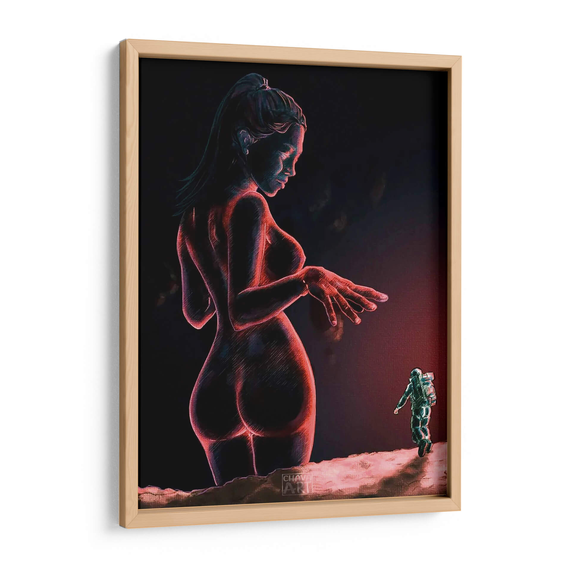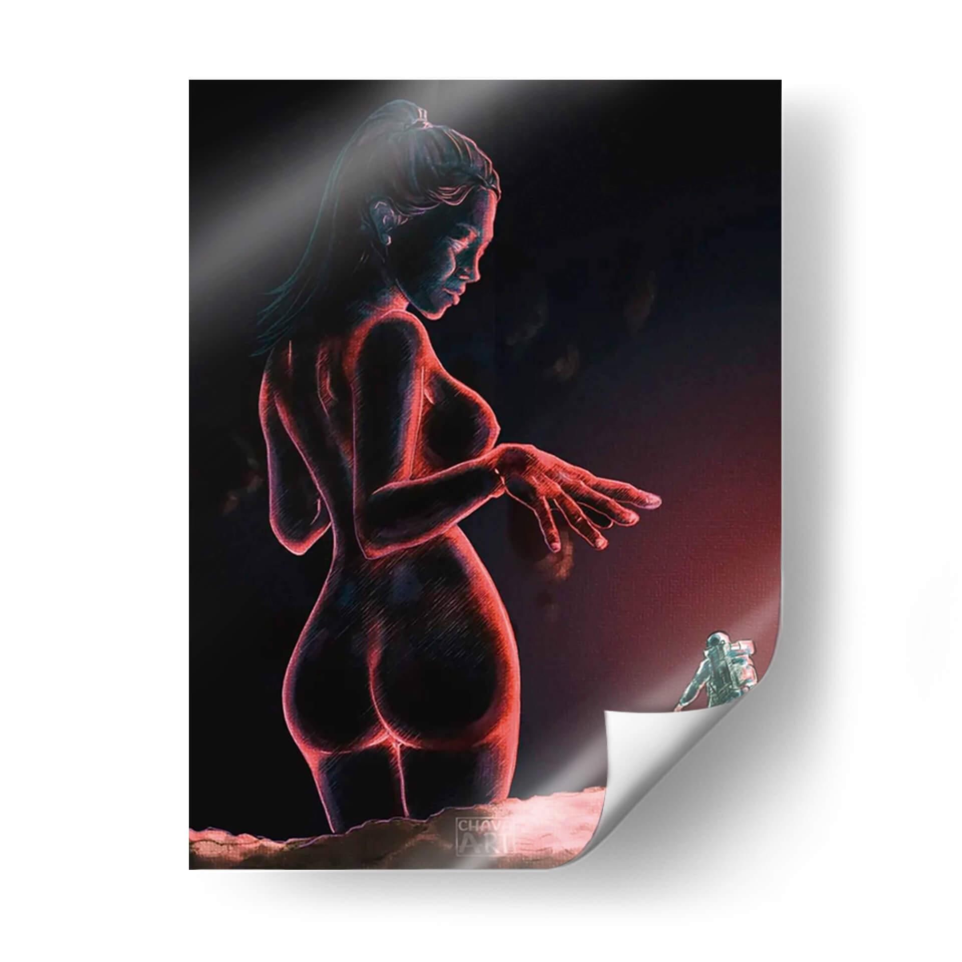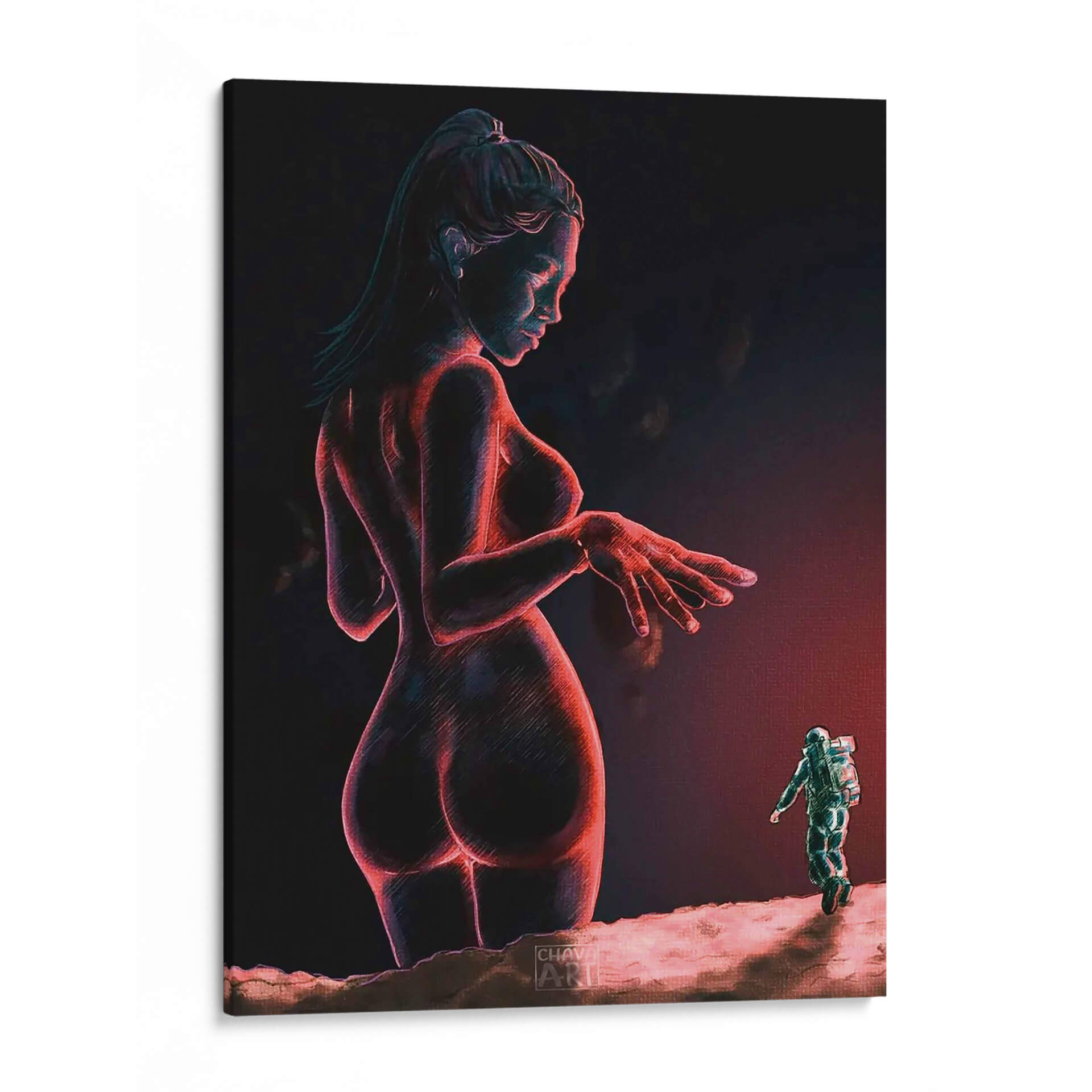 Sumérgete en la vastedad cósmica con "Misterio Espacial", una obra de arte digital que cautiva por su atmósfera enigmática y su audaz paleta de colores. Esta pieza presenta una figura femenina imponente, bañada en tonos rojizos y rosados intensos que contrastan con el profundo negro del fondo, creando un efecto lumínico casi etéreo. La composición evoca una sensación de introspección y descubrimiento, con la figura mirando hacia una luz enigmática, mientras una figura diminuta de astronauta se acerca, sugiriendo un viaje a lo desconocido o un encuentro trascendental. El estilo, con trazos que recuerdan a bocetos o grabados, añade una textura única y un toque artístico distintivo. "Misterio Espacial" es ideal para aquellos que buscan infundir a su hogar u oficina una dosis de intriga, modernidad y una conexión con lo sublime. Transforma tu espacio en un portal a nuevas dimensiones con este cuadro decorativo que invita a la reflexión y al asombro, perfecto para salas de estar, estudios o cualquier lugar donde se desee un punto focal cargado de significado y estética contemporánea. Déjate seducir por la narrativa visual de Chava.art y añade un toque de misterio y elegancia a tu decoración.