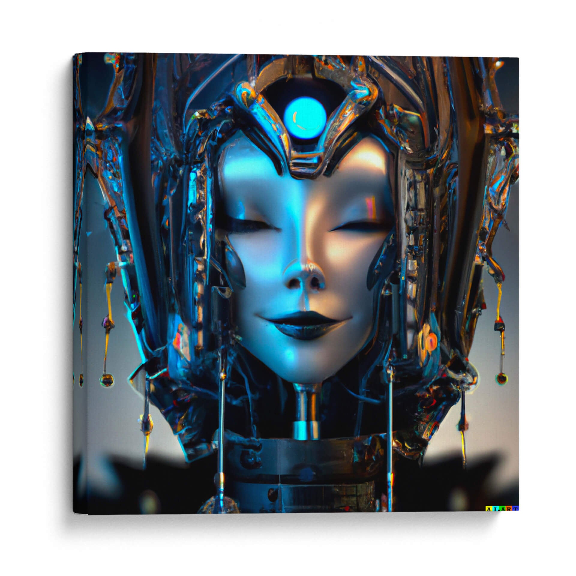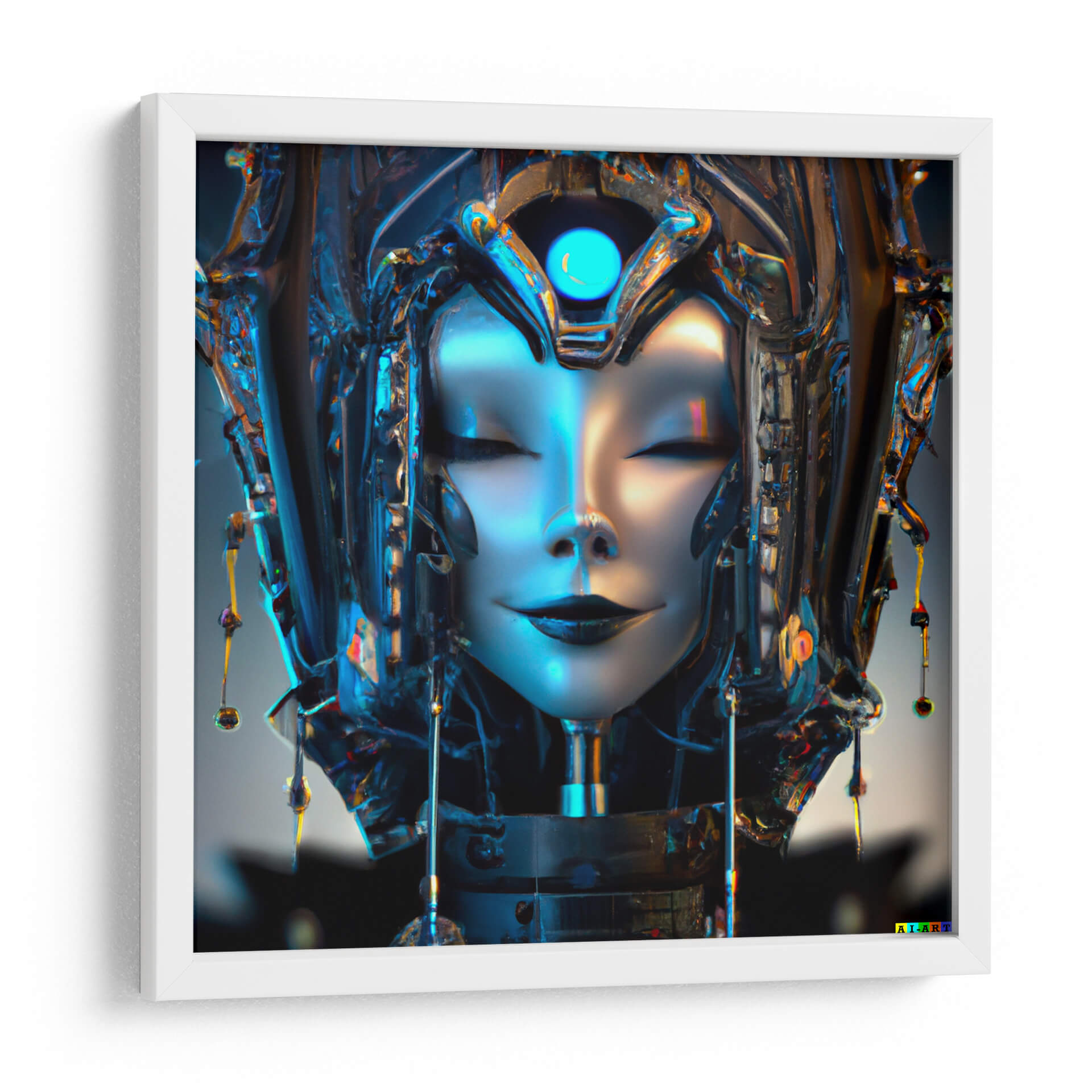 Sumérgete en el misterio y la sofisticación con "Pléyone 28T", una obra de arte digital que redefine la estética contemporánea. Esta pieza hipnotizante presenta un rostro sereno, con los ojos cerrados en un gesto de introspección, enmarcado por una intrincada estructura metálica que evoca un diseño futurista y mecánico. La paleta de colores, dominada por profundos azules eléctricos y acentos de oro y bronce, crea una atmósfera enigmática y lujosa, perfecta para añadir un toque de vanguardia a cualquier espacio. Las luces y sombras se entrelazan, resaltando las texturas metálicas y el acabado pulido del rostro, dotando a la obra de una profundidad visual impactante. "Pléyone 28T" no es solo un cuadro decorativo; es una declaración de estilo, ideal para salas de estar modernas, estudios de diseño o cualquier ambiente que busque inspirar creatividad y asombro. Su composición central y su temática única la convierten en un punto focal inigualable, invitando a la contemplación y al diálogo. Añade una dimensión de arte futurista y enigmático a tu hogar con esta pieza excepcional.