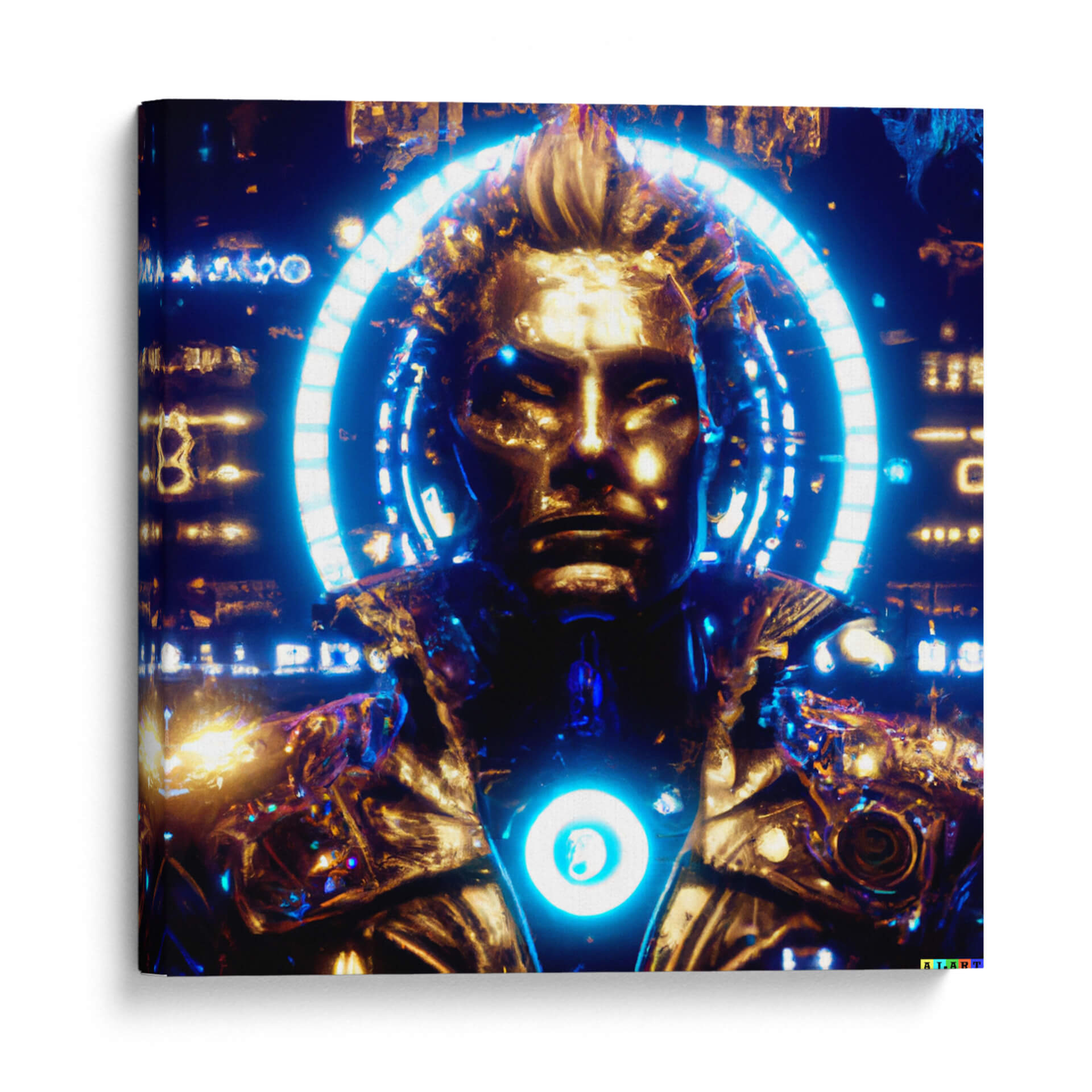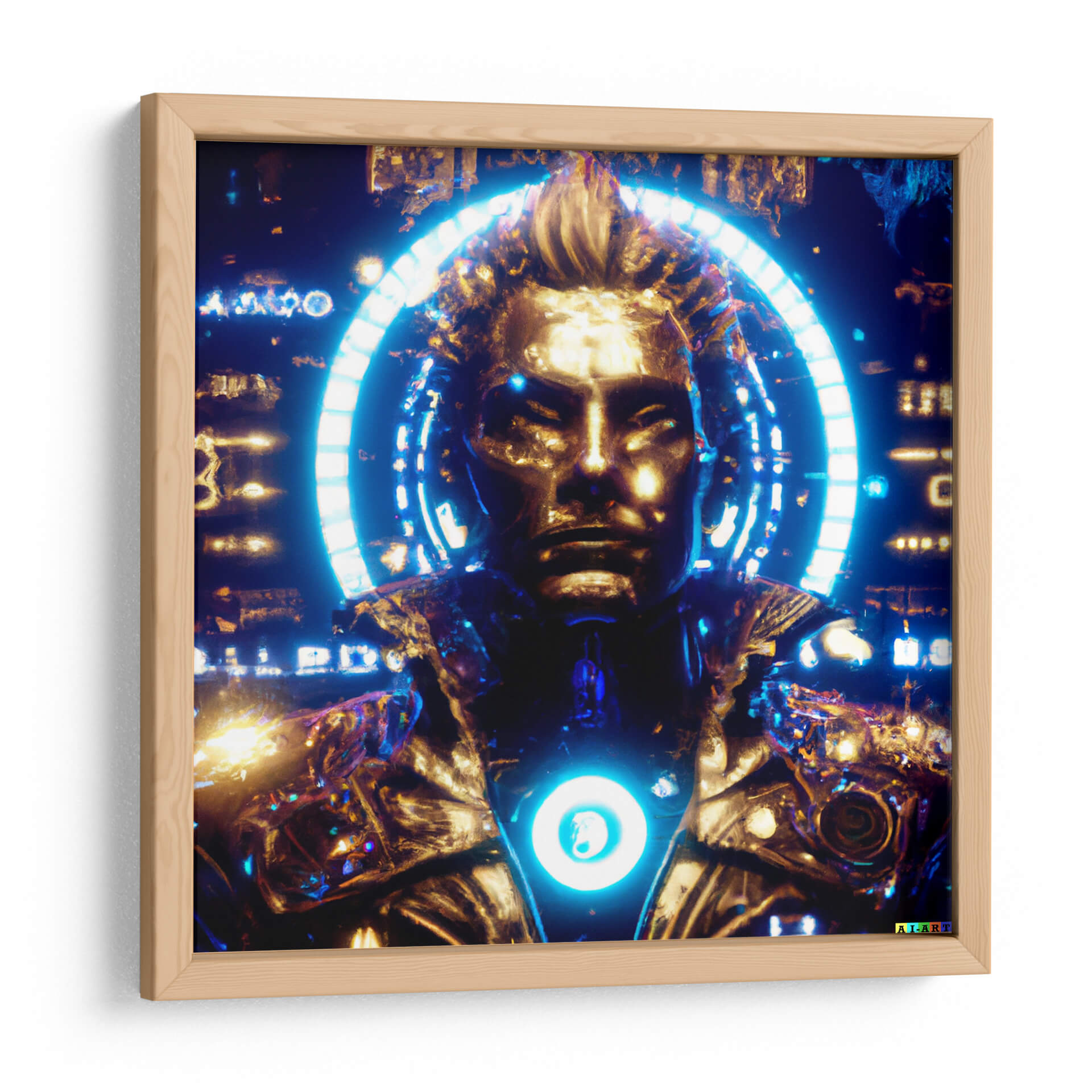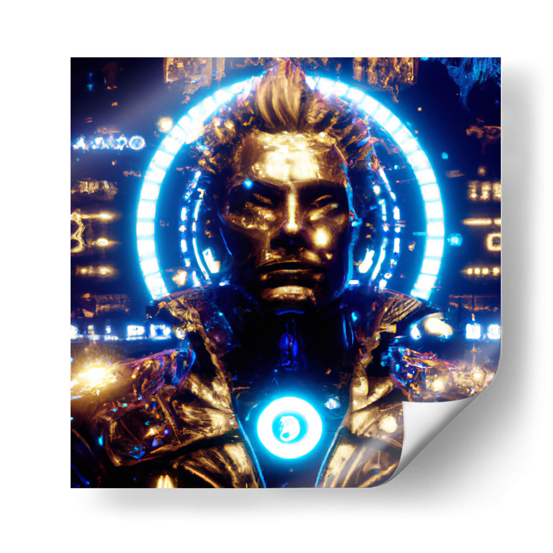 Sumérgete en el enigmático universo de 'Pollux 78G', una obra de arte digital que redefine la figura humana con un toque futurista y audaz. Esta pieza evoca una sensación de poder y misterio, fusionando elementos dorados con vibrantes tonos azules y negros. La composición presenta un busto central con rasgos definidos, enmarcado por un halo circular de luz azul neón que resalta su presencia casi divina. Los detalles intrincados de la armadura o vestimenta cibernética sugieren una narrativa de ciencia ficción, invitando al espectador a especular sobre la identidad y el propósito de esta figura. Los contrastes de luz y sombra crean una atmósfera dinámica y cautivadora, perfecta para quienes buscan añadir un elemento de intriga y modernidad a su decoración. Ideal para espacios que buscan un punto focal impactante, como salas de estar, estudios o áreas de entretenimiento, este cuadro decorativo es una declaración de estilo contemporáneo. Su estética única lo convierte en una pieza de conversación, capaz de inspirar admiración y asombro en cualquier observador. Descubre la fusión entre lo humano y lo tecnológico en 'Pollux 78G'.