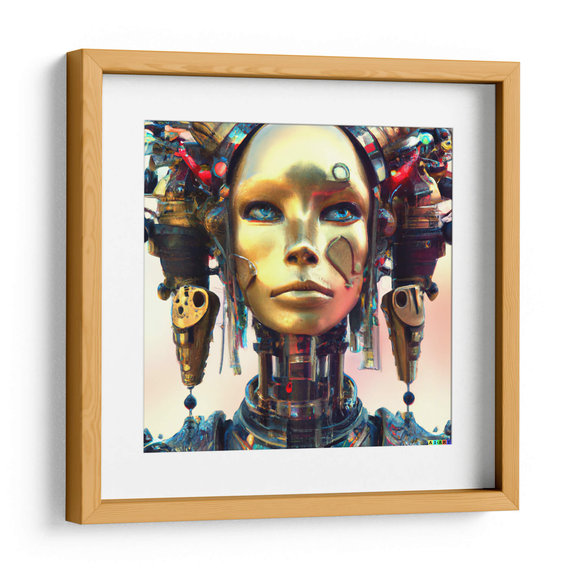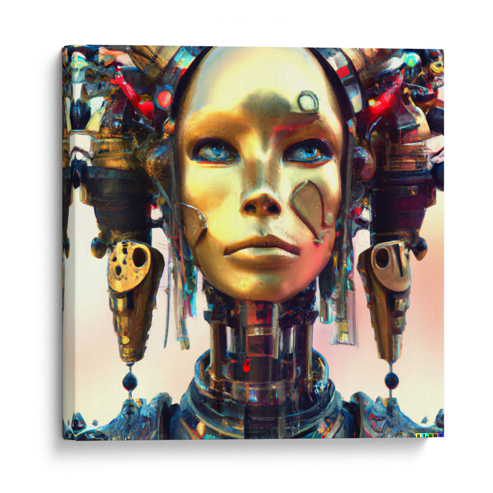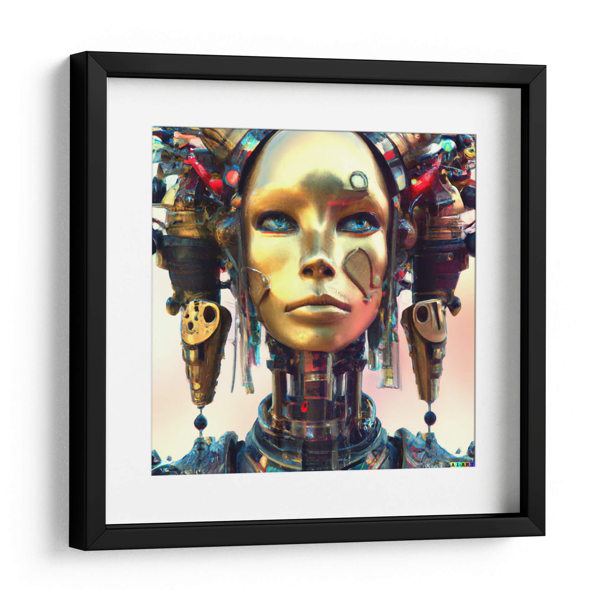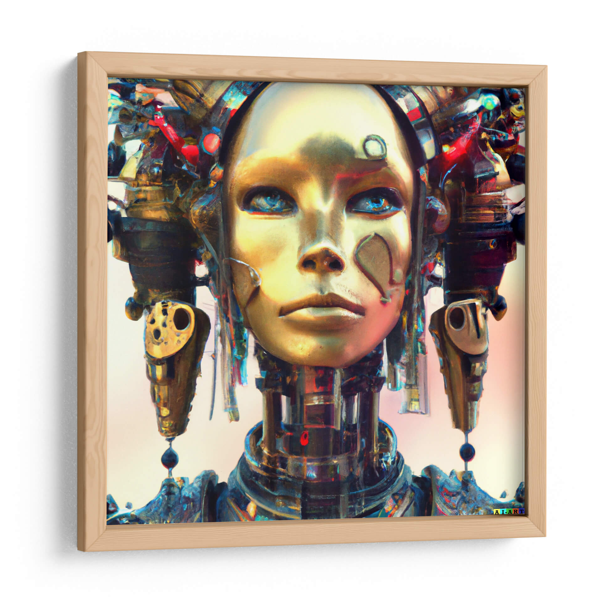 Sumérgete en el fascinante mundo de 'Scheat 53P', una obra de arte digital que desafía las convenciones y te transporta a un reino de estética futurista y enigmática. Esta pieza cautiva con su representación de un rostro dorado, casi etéreo, enmarcado por intrincados mecanismos y estructuras biomecánicas que sugieren una fusión de lo orgánico y lo artificial. Los profundos ojos azules, llenos de una mirada penetrante, invitan a la introspección, mientras que la compleja ornamentación que rodea la cabeza añade una capa de misterio y profundidad. La paleta de colores, dominada por tonos dorados, cobrizos y metálicos, se complementa con toques vibrantes de rojo y azul, creando un contraste visual impactante. El estilo, que podríamos definir como arte digital abstracto con influencias de la ciencia ficción y el steampunk, es ideal para espacios modernos que buscan un toque de originalidad y vanguardia. 'Scheat 53P' no es solo una decoración de pared, sino una declaración de intenciones, una pieza que invita a la conversación y añade un carácter único a tu hogar u oficina. Perfecta para quienes aprecian la originalidad y la tecnología en el arte.