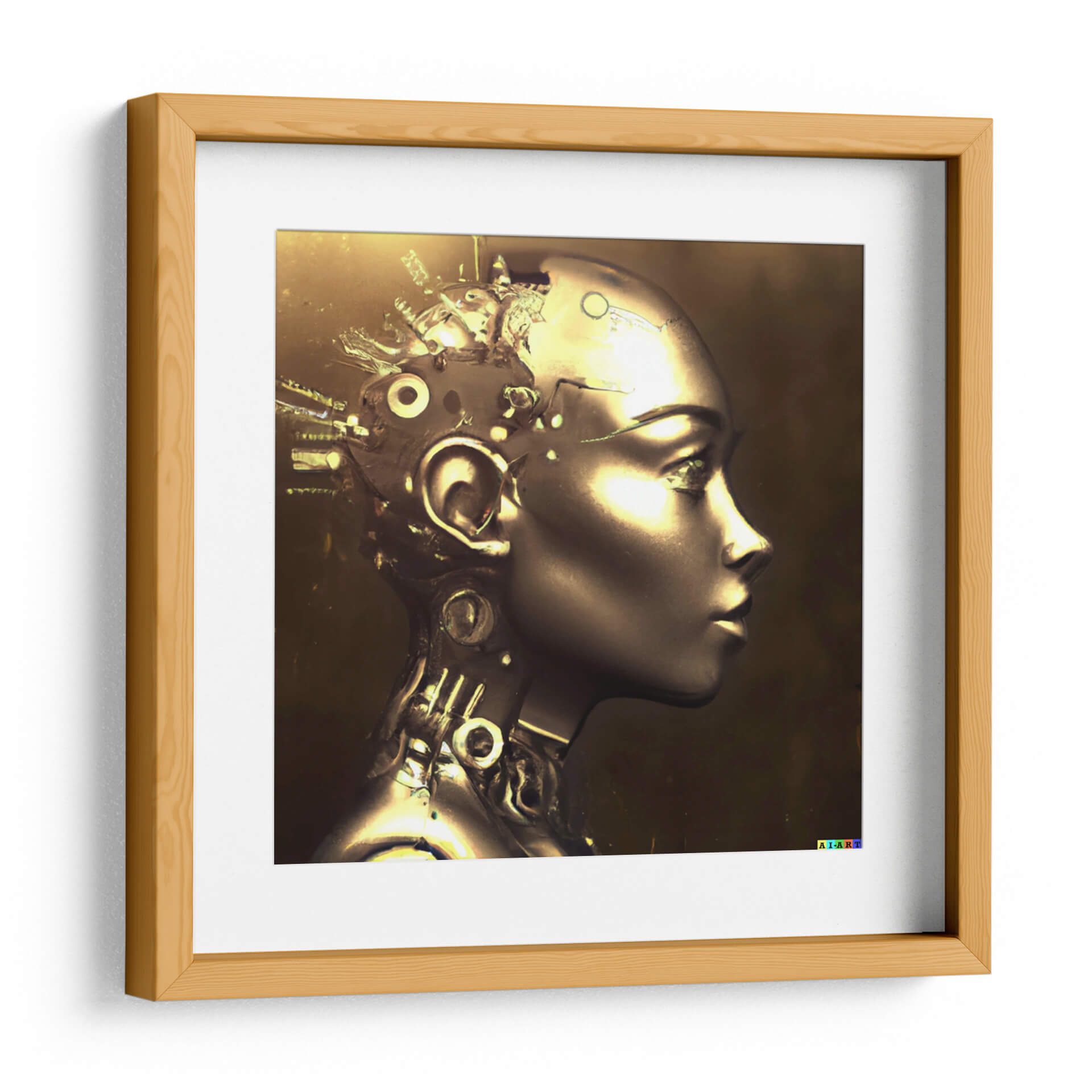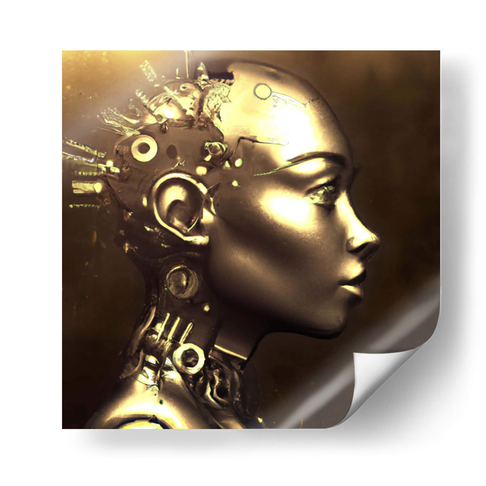 Adéntrate en el fascinante mundo de la inteligencia artificial y la estética futurista con este impactante cuadro decorativo 'Tarazet Reda50' del artista AI-ART. La obra presenta un retrato de perfil de una figura cibernética, cuya cabeza se funde con intrincados mecanismos y cables, sugiriendo una fusión entre lo orgánico y lo tecnológico. La paleta de colores se centra en tonos dorados y cobrizos profundos, bañados por una luz cálida y dramática que resalta los contornos metálicos y crea un efecto de brillo cautivador. La composición, enfocada en el rostro y la parte superior del torso, invita a la contemplación sobre la naturaleza de la conciencia y la evolución. Este cuadro decorativo de arte digital es perfecto para espacios modernos, oficinas tecnológicas o cualquier lugar donde se desee añadir un toque de vanguardia y misterio. Su atmósfera evoca reflexión y admiración por el ingenio humano y las posibilidades del futuro. Ideal para coleccionistas de arte contemporáneo y entusiastas de la ciencia ficción, 'Tarazet Reda50' es una pieza que no pasará desapercibida y que seguramente generará conversación.