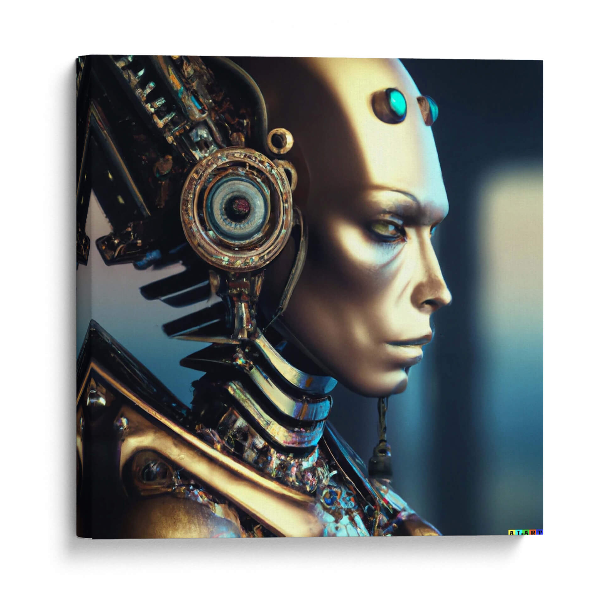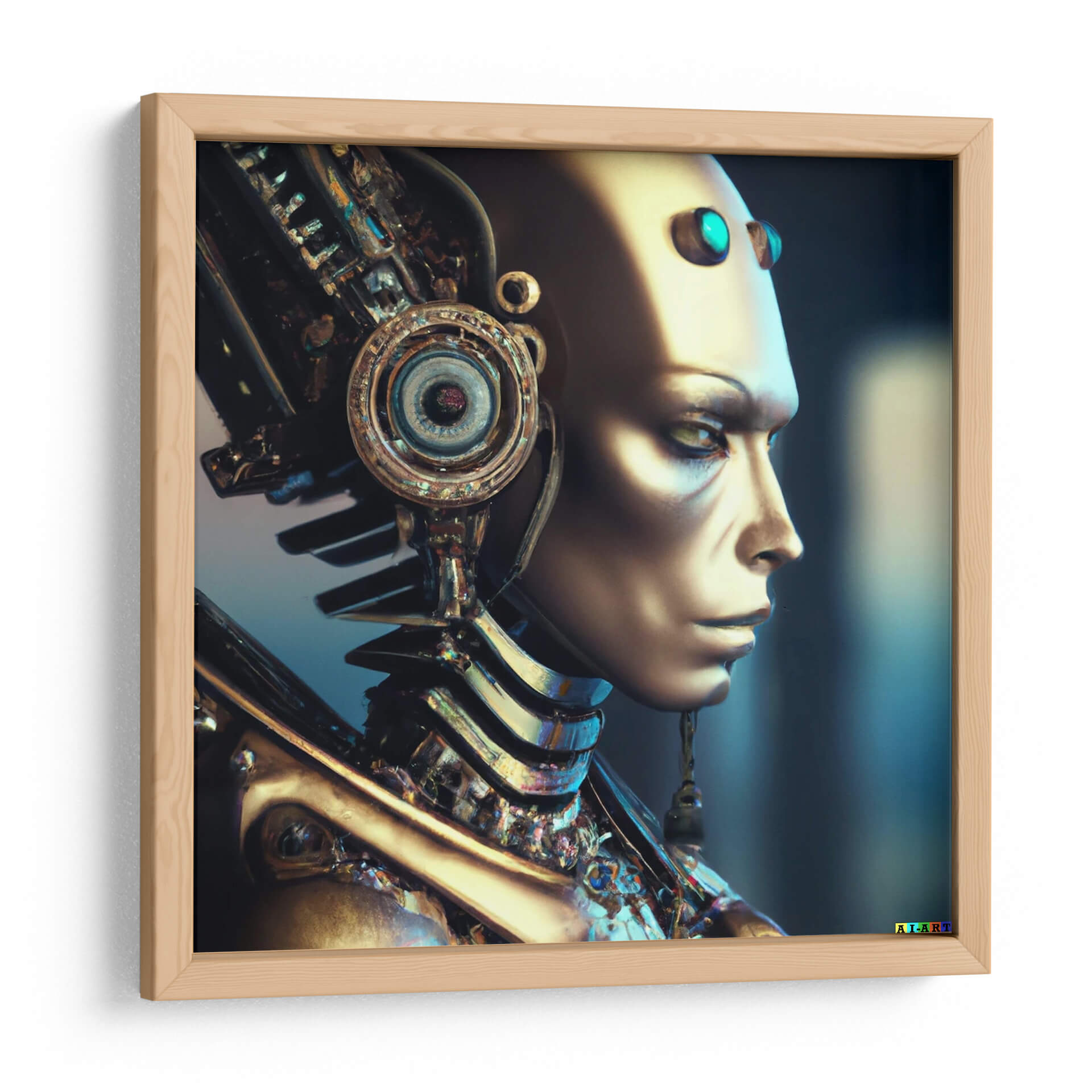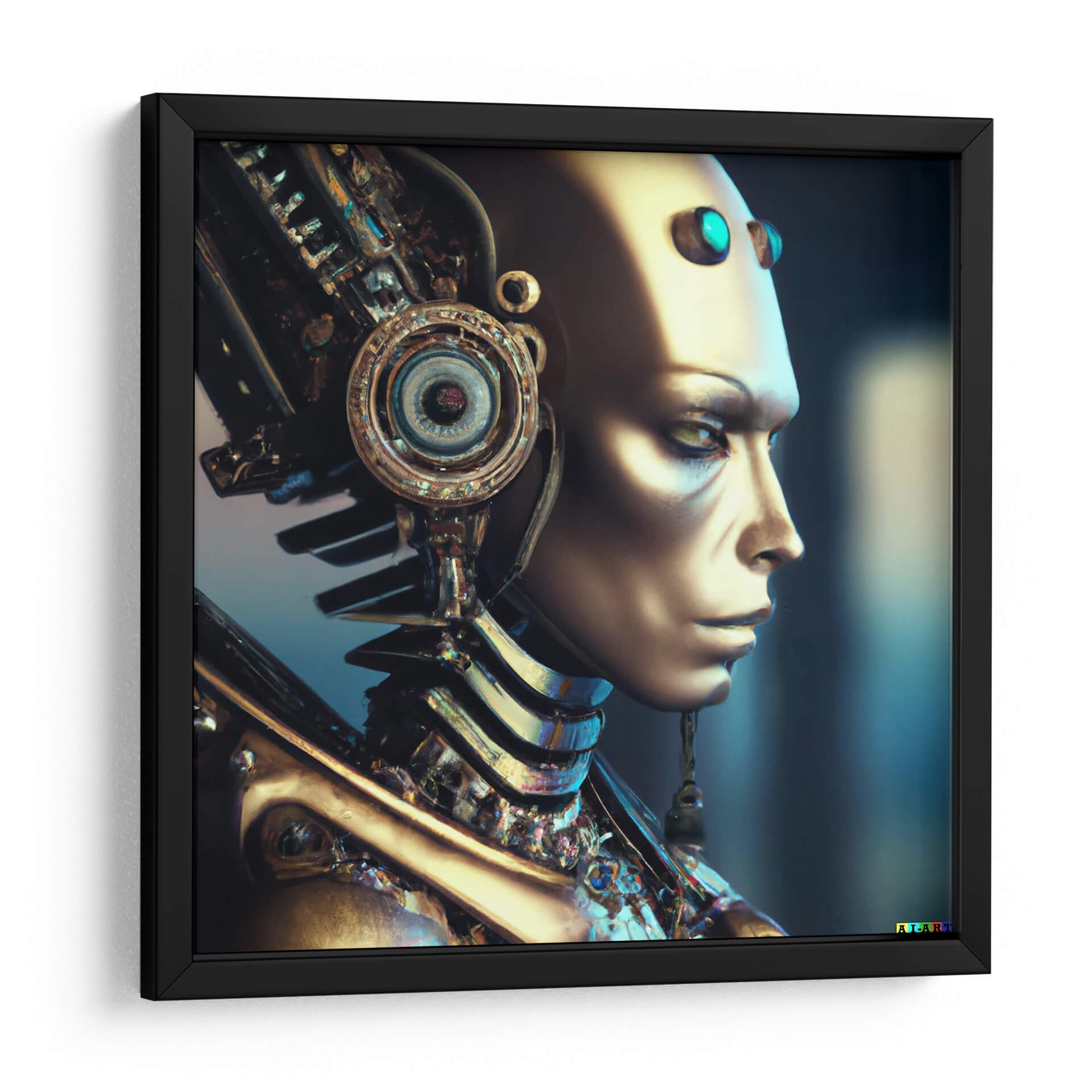 Sumérgete en el fascinante mundo de la inteligencia artificial y la estética futurista con "Tokurt_Yliik", una obra de arte digital que desafía los límites de la imaginación. Este cuadro decorativo presenta un perfil detallado de una figura cibernética, cuya piel metálica irradia tonos dorados y cobrizos, contrastando con las profundidades azules y oscuras del fondo. La complejidad mecánica que rodea el rostro, con engranajes intrincados y elementos ópticos, sugiere una profunda inteligencia y una existencia más allá de lo humano. Los puntos de luz turquesa en la frente añaden un toque de misticismo y energía concentrada. La mirada penetrante, aunque serena, invita a la contemplación sobre la conciencia artificial y el futuro de la tecnología. "Tokurt_Yliik" es ideal para espacios modernos, oficinas de tecnología o cualquier lugar donde se desee un toque de sofisticación futurista y un tema de conversación intrigante. Su composición dramática y paleta de colores rica lo convierten en una pieza única que captura la esencia de la vanguardia artística digital. Añade un toque de ciencia ficción y arte conceptual a tu decoración.