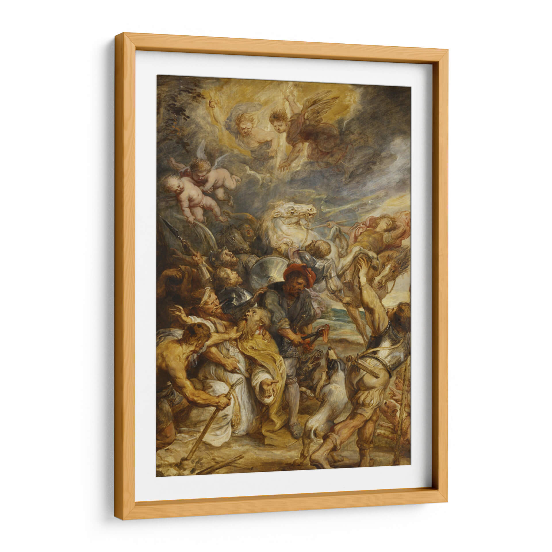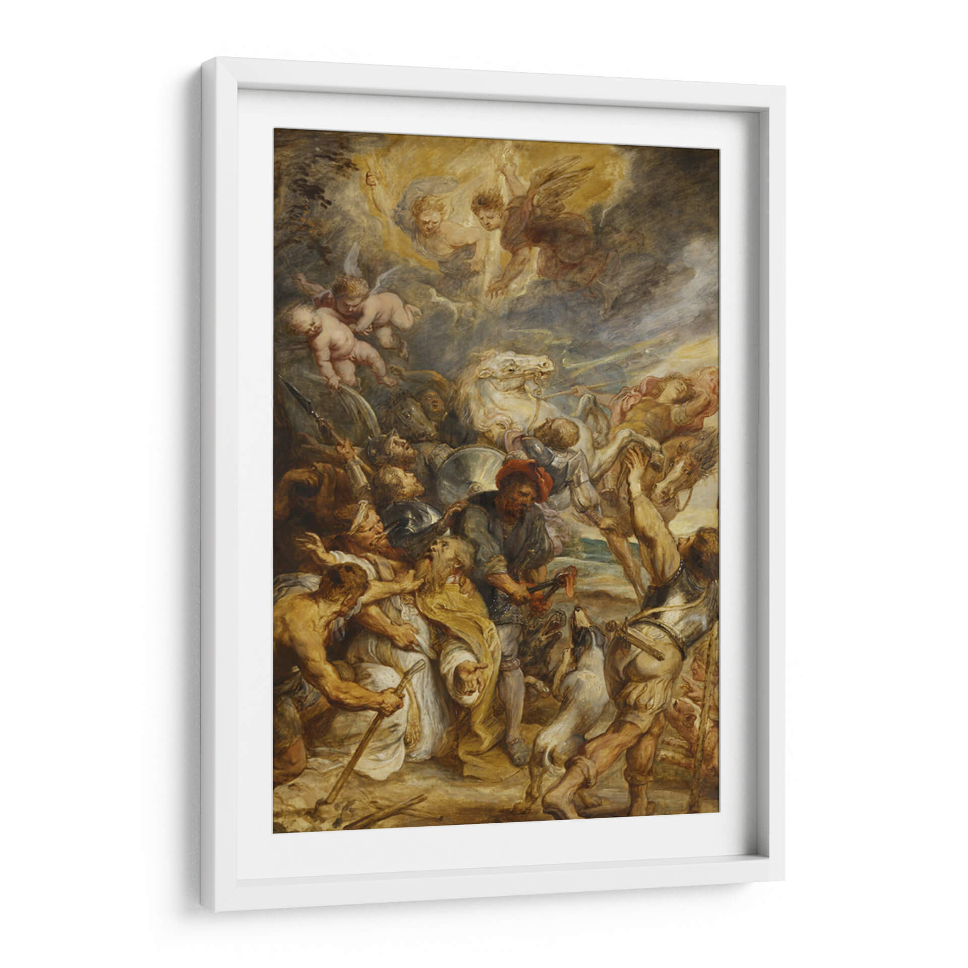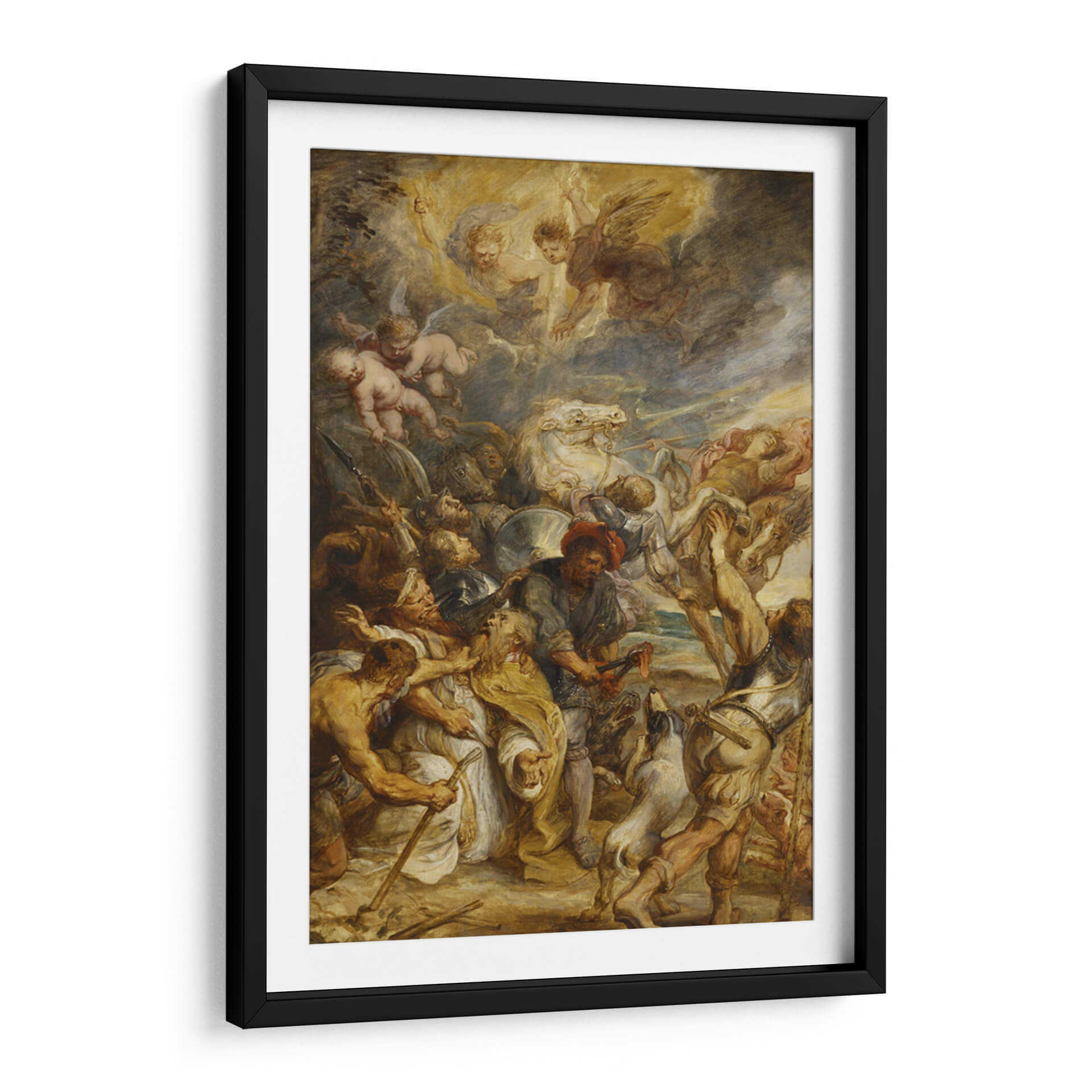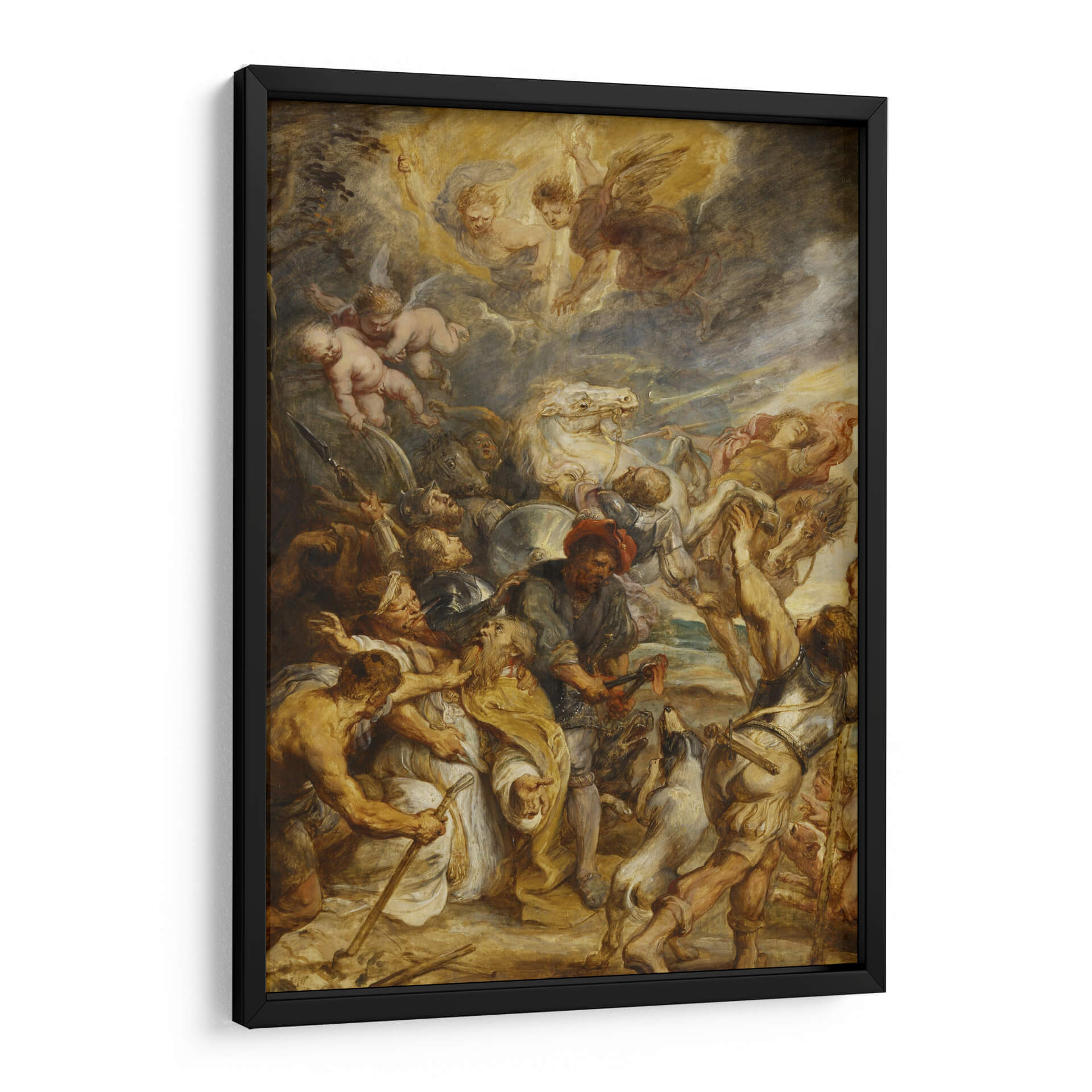 Sumérgete en la intensidad dramática de "El martirio de San Livinus", una obra maestra de Peter Paul Rubens que captura un momento de profunda agonía y fe. Esta pintura, cargada de emoción, presenta una composición dinámica donde figuras musculares y llenas de expresión luchan y sufren bajo un cielo turbulento, iluminado por la presencia celestial de ángeles. La paleta de colores, dominada por tonos terrosos, ocres y dorados con contrastes de luz y sombra, crea una atmósfera de crudo realismo y devoción. El estilo barroco de Rubens se manifiesta en la energía desbordante, el movimiento vigoroso y la teatralidad de la escena, invitando a la reflexión sobre la resistencia y el sacrificio. Este cuadro decorativo es ideal para espacios que buscan un punto focal de gran impacto visual y carga emocional, como un estudio, una sala de estar de estilo clásico o un comedor que aprecie el arte con profundidad histórica y narrativa. Su capacidad para evocar una respuesta emocional lo convierte en una adición poderosa a cualquier colección de arte que valore la maestría clásica y la narración visual intensa, aportando un toque de drama y profundidad a tu decoración.