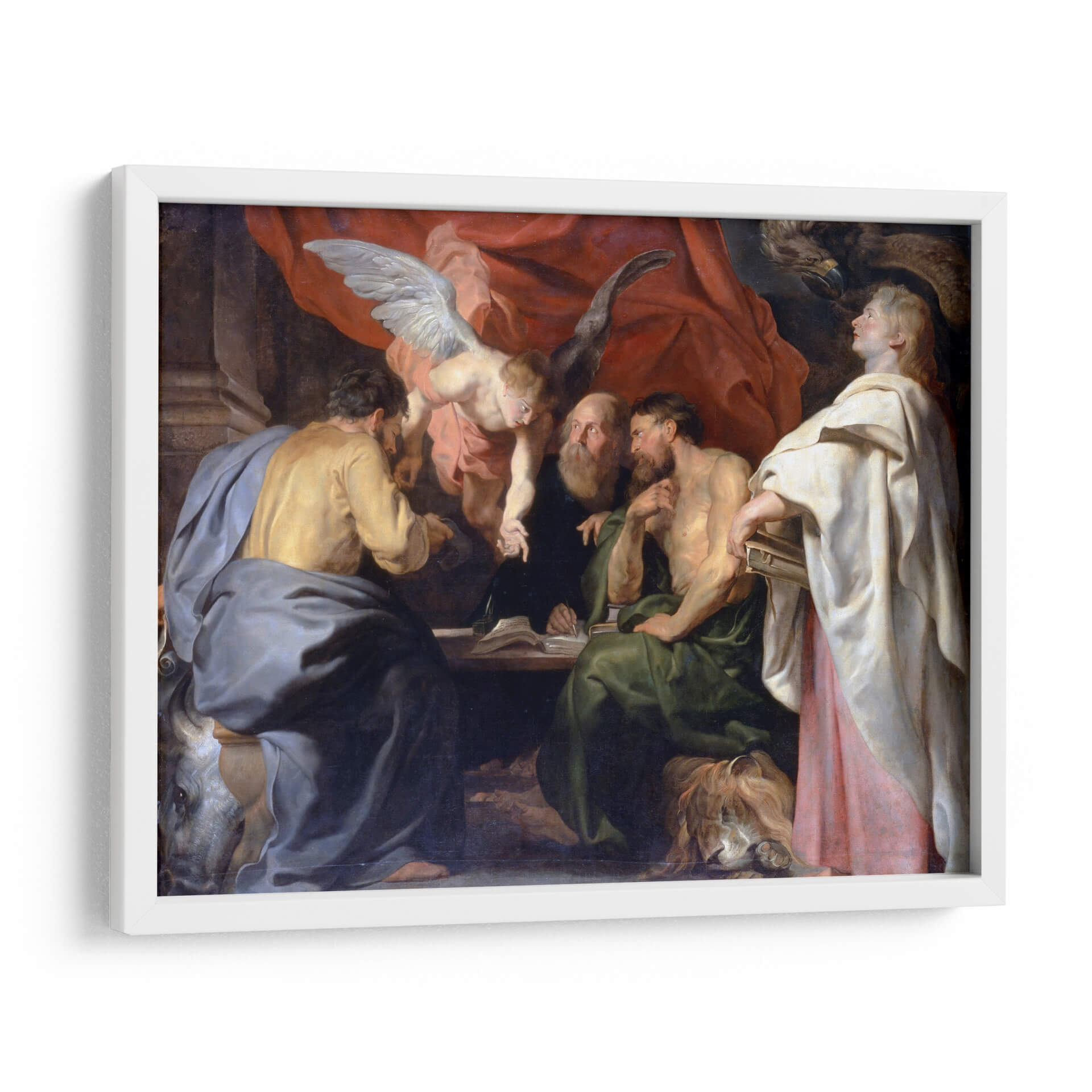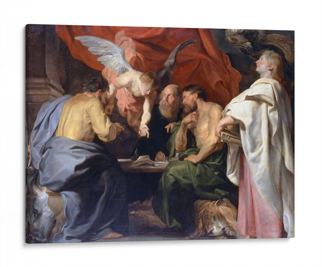 Sumérgete en la majestuosidad de "Los cuatro evangelistas", una obra maestra que captura la intensidad y la sabiduría divina. Este cuadro decorativo, inspirado en el estilo barroco de Peter Paul Rubens, presenta a cuatro figuras masculinas inmersas en un momento de profunda contemplación y revelación. La composición dinámica se ve realzada por un uso dramático de la luz y la sombra, que modela los volúmenes de los cuerpos y las ricas vestimentas, creando una atmósfera de solemnidad y misticismo. Los colores, dominados por tonos tierra, rojos intensos y azules profundos, aportan calidez y profundidad a la escena, mientras que los detalles dorados y los toques de luz evocan una sensación de espiritualidad y trascendencia. La figura de un querubín alado añade un elemento celestial, sugiriendo inspiración divina. Este cuadro es ideal para quienes buscan infundir a su hogar u oficina un aire de erudición, fe y grandeza artística. Colócalo en tu salón para crear un punto focal de conversación o en tu estudio para inspirar momentos de reflexión. La obra evoca una sensación de poder intelectual y espiritual, perfecta para espacios que buscan transmitir autoridad y profundidad.