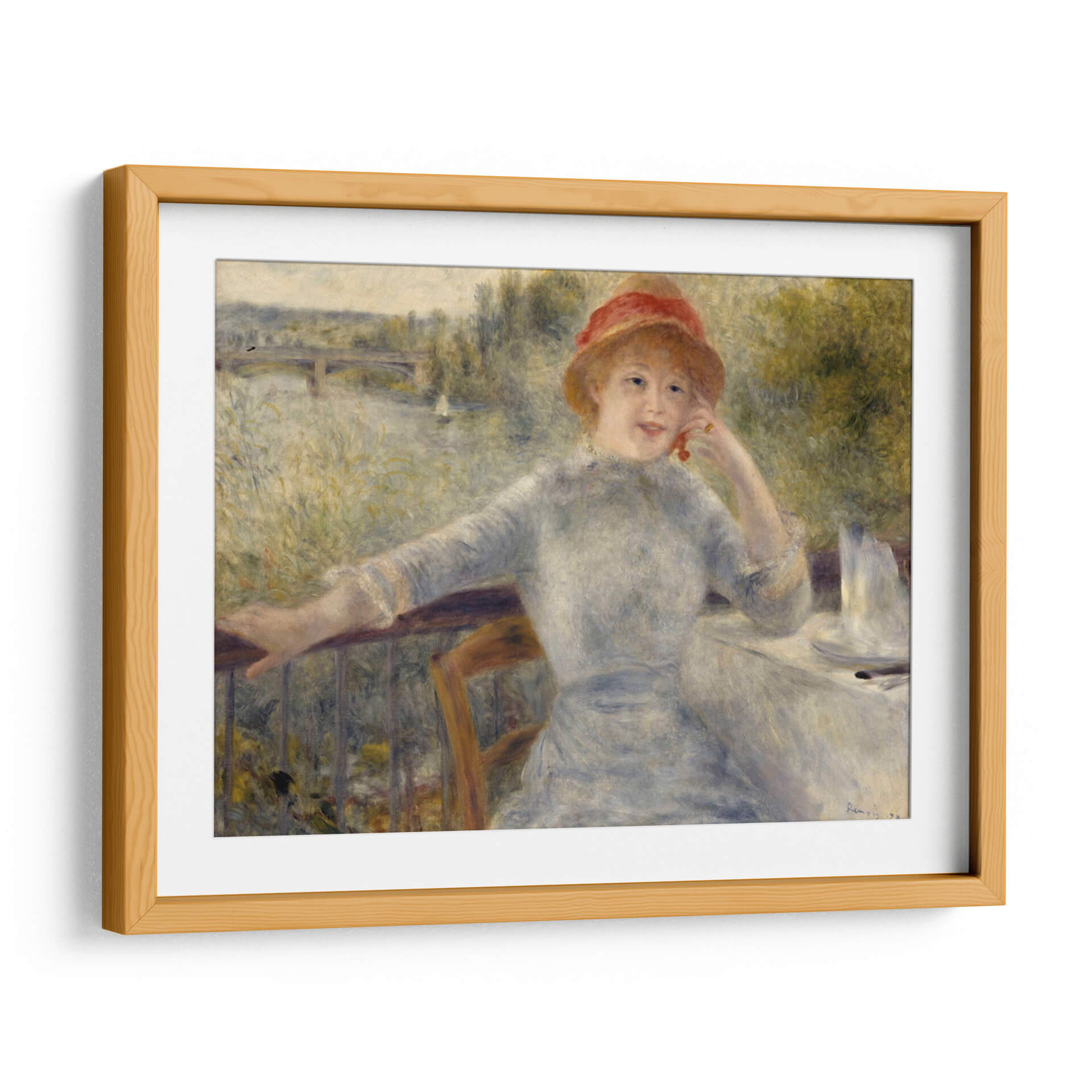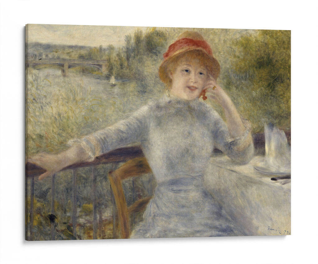 Sumérgete en la serenidad y el encanto de "Alphonsine Fournaise" de Pierre-Auguste Renoir, una obra maestra que captura un momento de ligereza y belleza. Este cuadro decorativo, ejecutado en el icónico estilo impresionista, te transportará a un día soleado junto al río, evocando una atmósfera de paz y contemplación. La paleta de colores suaves, dominada por tonos pastel y verdes naturales, crea una sensación de calidez y tranquilidad, perfecta para cualquier espacio que busque un toque de sofisticación y sosiego. La figura central de Alphonsine, con su mirada dulce y su pose relajada, irradia una elegancia atemporal. Los trazos sueltos y la pincelada visible, características distintivas del impresionismo, añaden textura y profundidad, invitando al espectador a perderse en los detalles. Este lienzo es ideal para añadir un punto de interés visual y emocional a tu sala de estar, dormitorio o estudio, transformando tu hogar en una galería personal. Descubre la magia de Renoir y enriquece tu decoración con una pieza que celebra la belleza de la vida cotidiana.