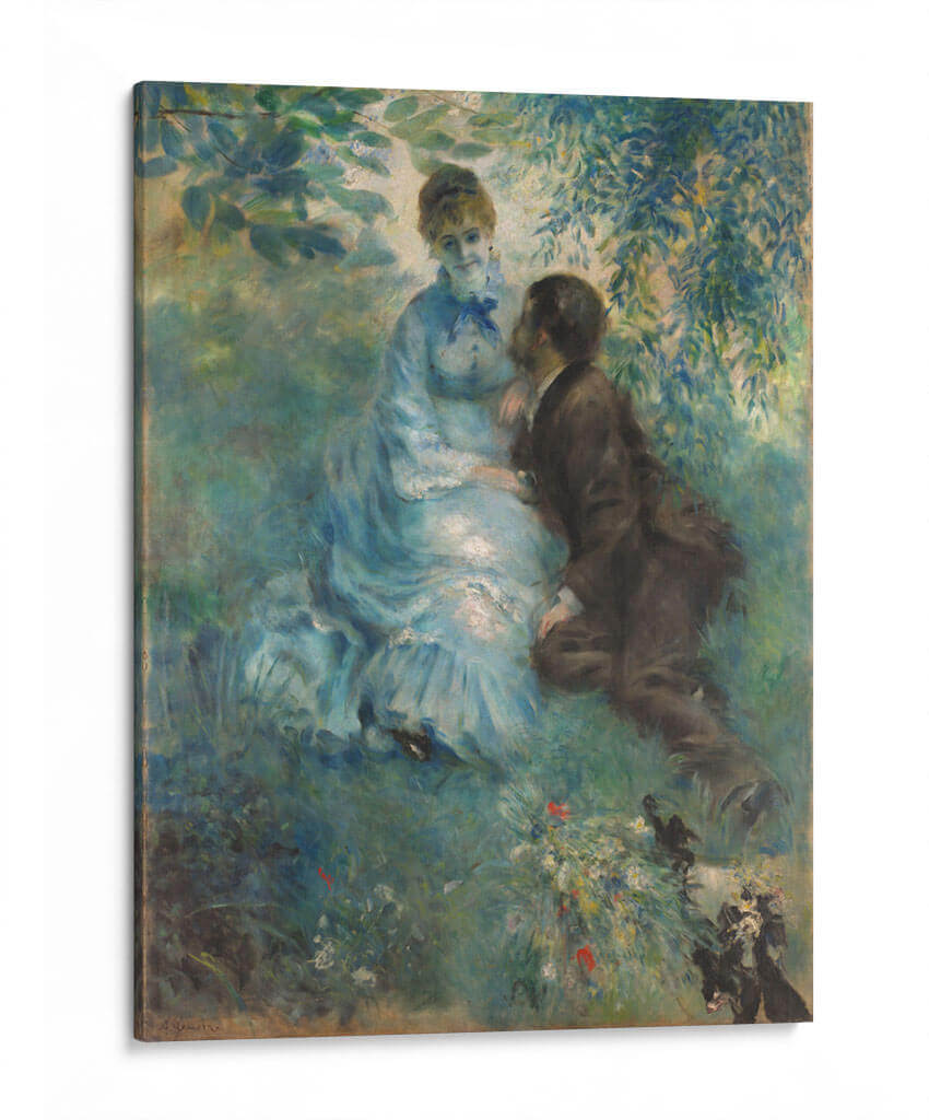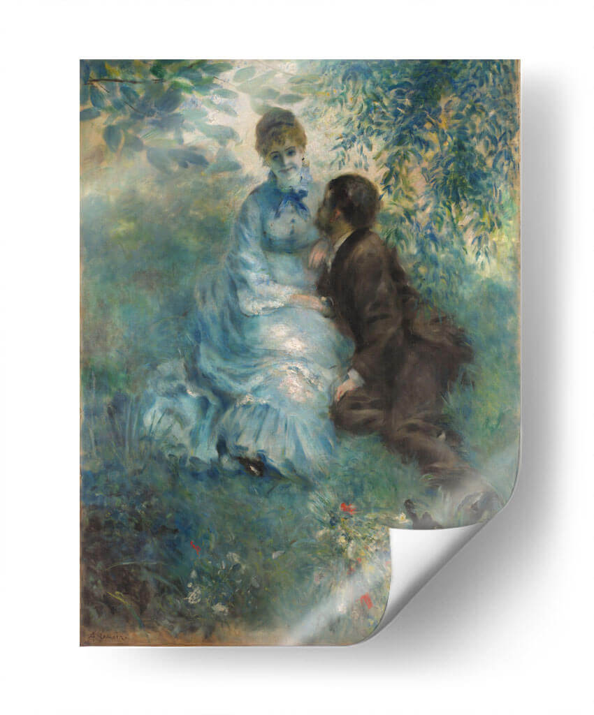 Sumérgete en la serenidad y el encanto del cuadro "Amantes" de Pierre-Auguste Renoir, una obra maestra impresionista que captura un momento íntimo en un entorno natural idílico. Este cuadro decorativo transporta al espectador a un jardín exuberante, donde la luz del sol se filtra a través de las hojas, creando una atmósfera etérea y soñadora. La figura femenina, vestida con un elegante vestido azul pálido, irradia una delicadeza y una gracia sutil, mientras que la figura masculina se inclina hacia ella en un gesto de profunda conexión. Renoir emplea su característica pincelada suelta y vibrante, mezclando tonos de azul, verde y toques de color para dar vida a la escena, evocando una sensación de calidez y afecto. "Amantes" es más que una simple representación; es una invitación a sentir la dulzura de un momento compartido y la belleza efímera de la naturaleza. Ideal para añadir un toque de romanticismo y sofisticación a tu sala de estar, dormitorio o cualquier espacio que busque una atmósfera de tranquilidad y elegancia atemporal. Este cuadro es perfecto para amantes del arte impresionista y para quienes buscan piezas decorativas que cuenten historias y evoquen emociones profundas.