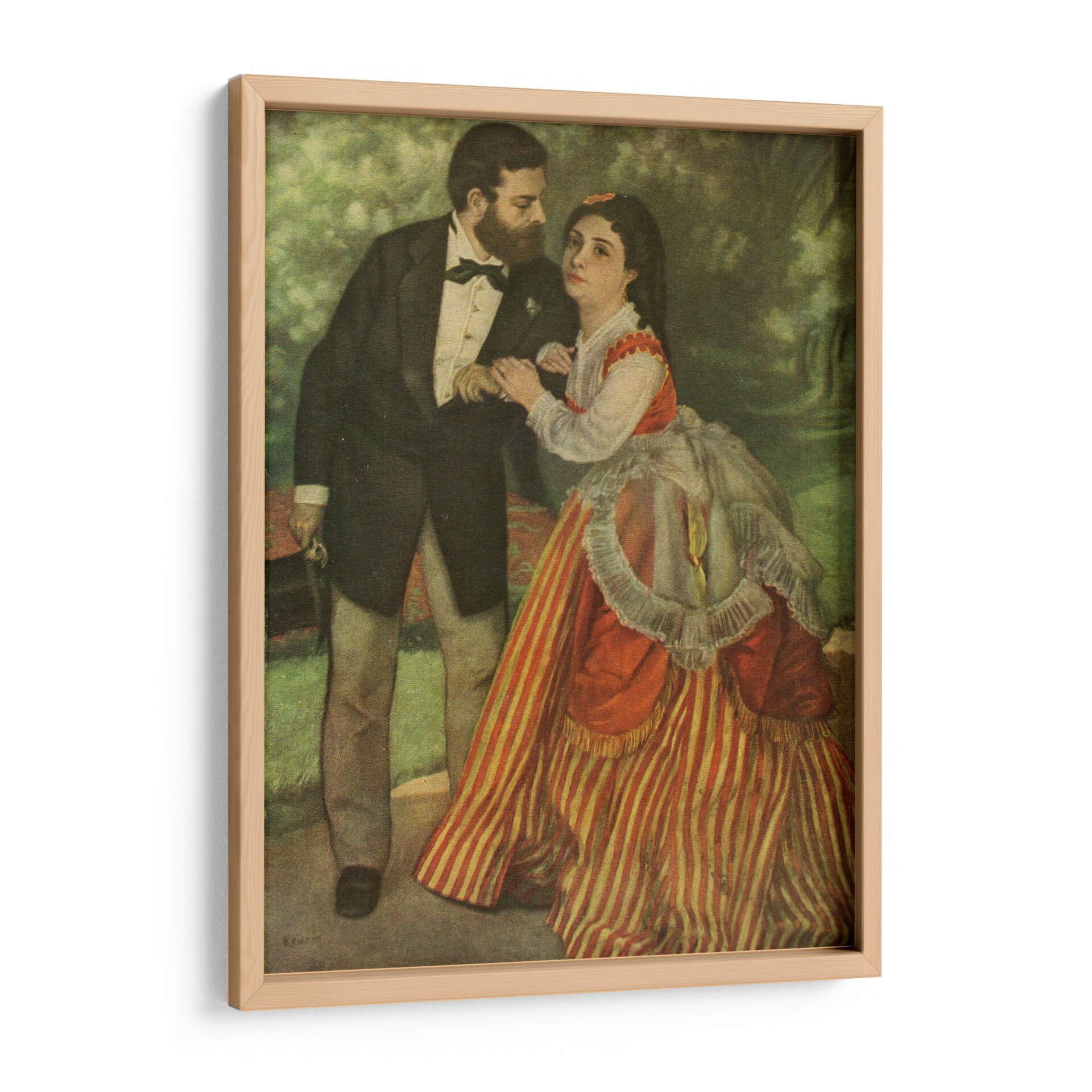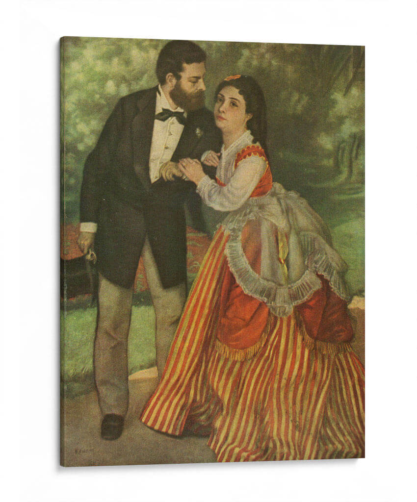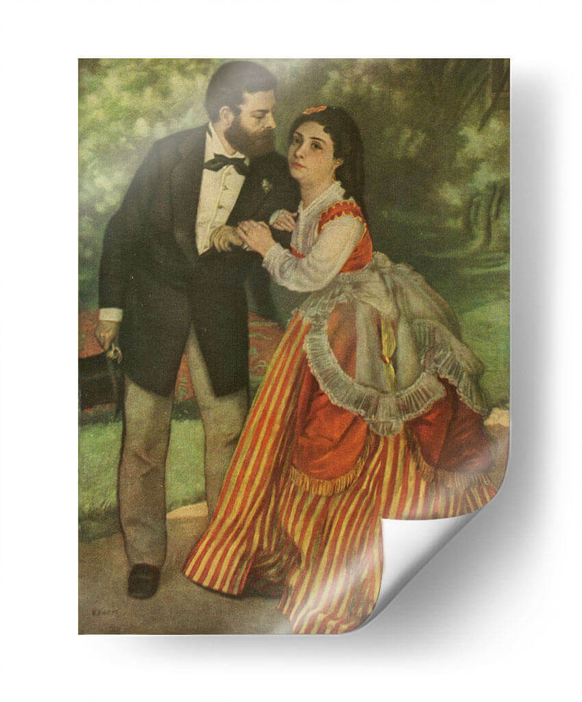 Sumérgete en la delicadeza romántica de "Los Prometidos", una obra maestra inspirada en el estilo de Pierre-Auguste Renoir. Este cuadro decorativo captura un momento íntimo entre una pareja, con el hombre vestido elegantemente de frac y la mujer luciendo un vibrante vestido a rayas rojas y blancas, adornado con un voluminoso delantal y un cuello de encaje. La atmósfera del jardín de fondo, con sus tonos verdes suaves y difuminados, crea un telón de fondo idílico que realza la conexión entre los personajes. Los colores cálidos y las pinceladas que sugieren movimiento son característicos del impresionismo, aportando una sensación de vida y espontaneidad a la escena. La expresión en el rostro de la mujer, una mezcla de ternura y quizás un toque de reserva, invita a la contemplación sobre la narrativa de la pieza. Este cuadro decorativo es ideal para añadir un toque de elegancia clásica y romanticismo a salones, comedores o incluso dormitorios, transformando cualquier espacio en un rincón lleno de historia y sentimiento. Su presencia evoca conversaciones, momentos compartidos y la belleza de las relaciones humanas, convirtiéndose en un punto focal que inspira y cautiva. Añade esta pieza atemporal a tu colección y disfruta de su encanto perdurable.