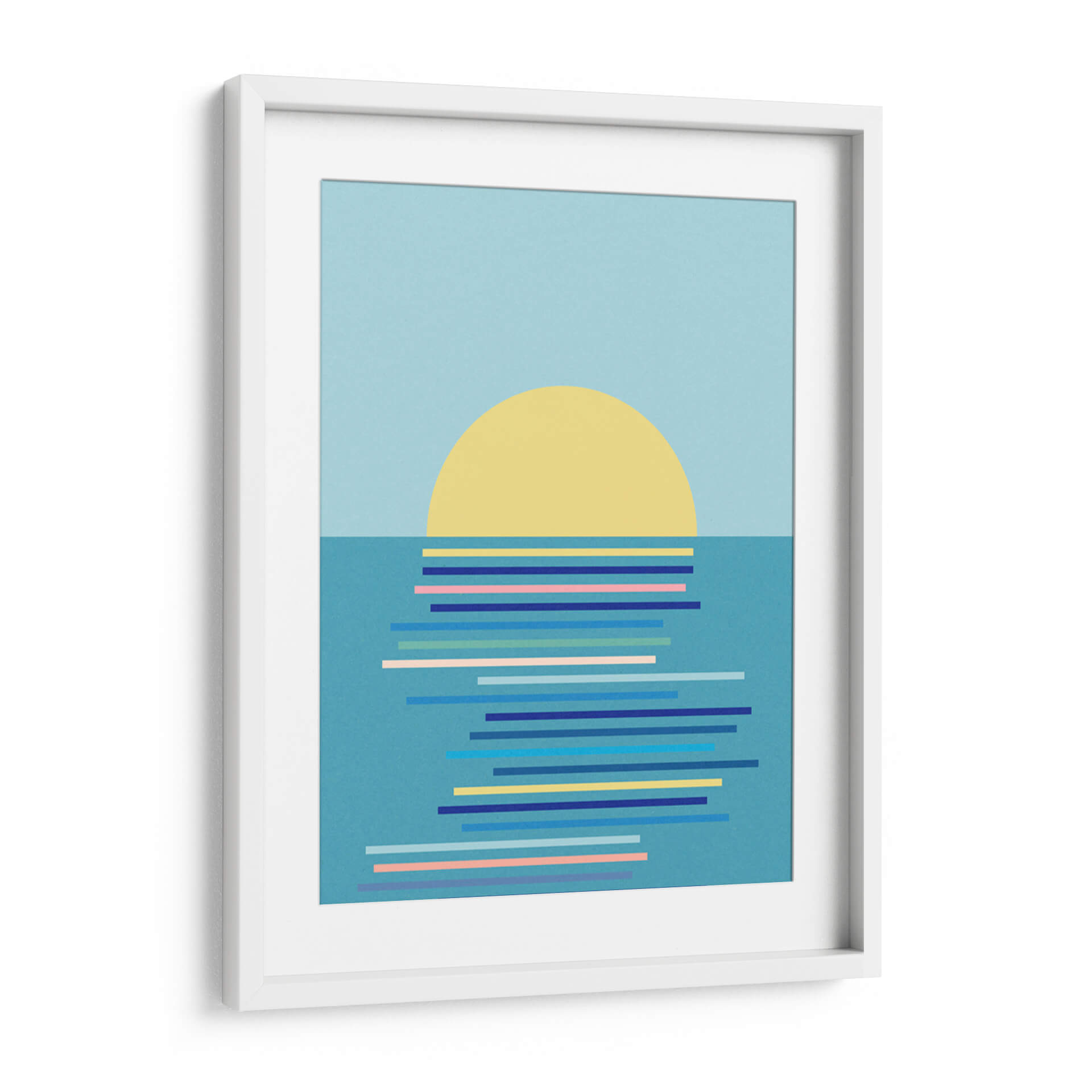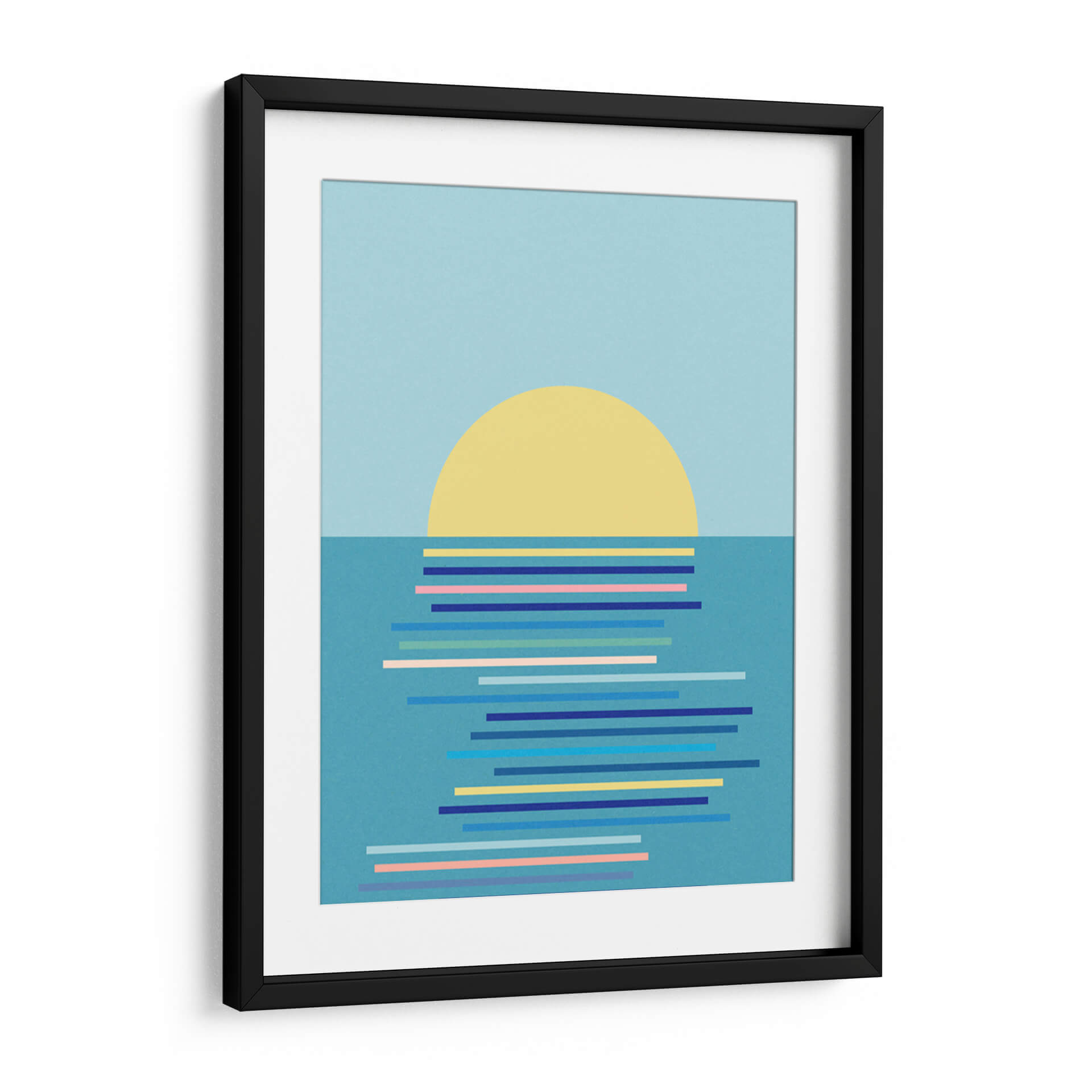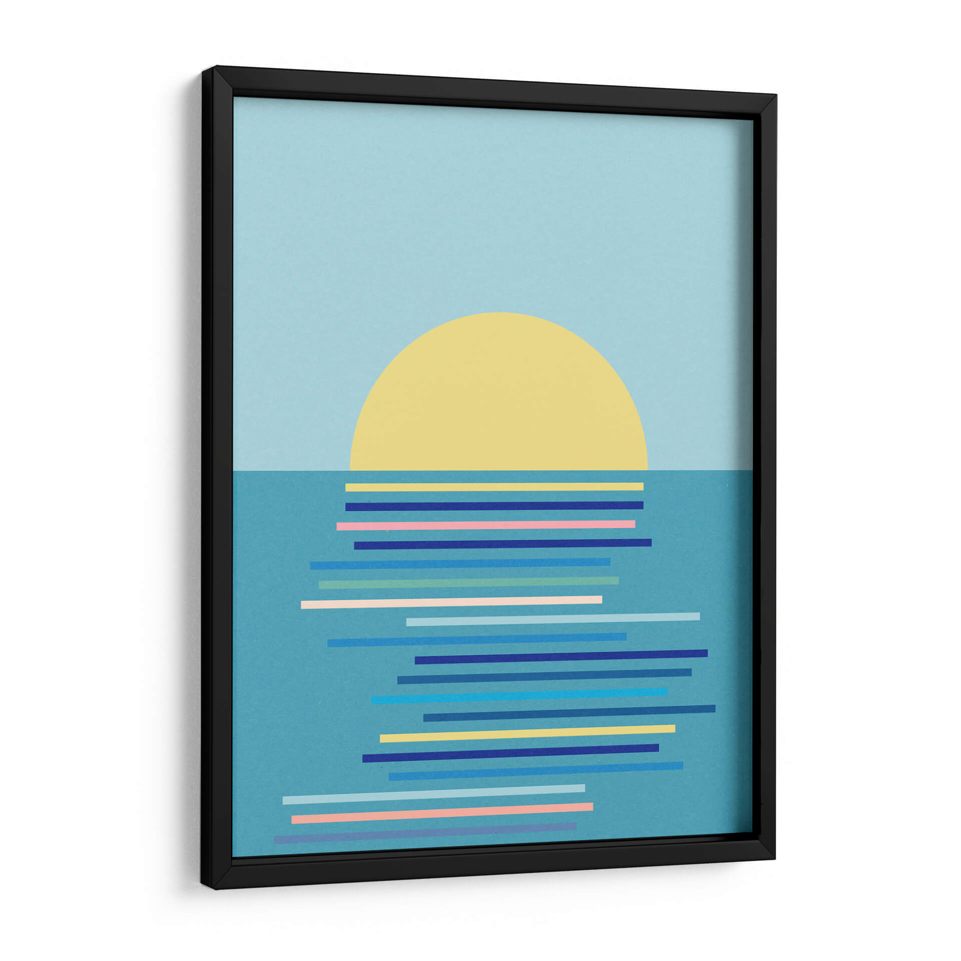 Captura la serenidad y la belleza geométrica de un amanecer costero con "Amanecer en Ahrenshoop" de Rosi Feist. Esta obra de arte abstracto minimalista presenta un sol circular de color amarillo vibrante emergiendo sobre un mar estilizado, representado por una serie de líneas horizontales en diversos tonos de azul, rosa y amarillo. La paleta de colores, dominada por el azul cielo sereno y el turquesa acuático, crea una atmósfera de calma y tranquilidad, ideal para cualquier espacio que busque un toque de paz. El diseño limpio y la composición audaz hacen de este cuadro decorativo una pieza contemporánea perfecta para salas de estar, dormitorios o estudios que deseen una conexión sutil con la naturaleza y una dosis de estilo moderno. "Amanecer en Ahrenshoop" no es solo una imagen, es una invitación a la contemplación, un recordatorio de los momentos de quietud y belleza que ofrece el inicio de un nuevo día. Añade un aire de sofisticación y serenidad a tu hogar con esta pieza única que combina la simplicidad geométrica con la evocación emocional del paisaje marino al amanecer.