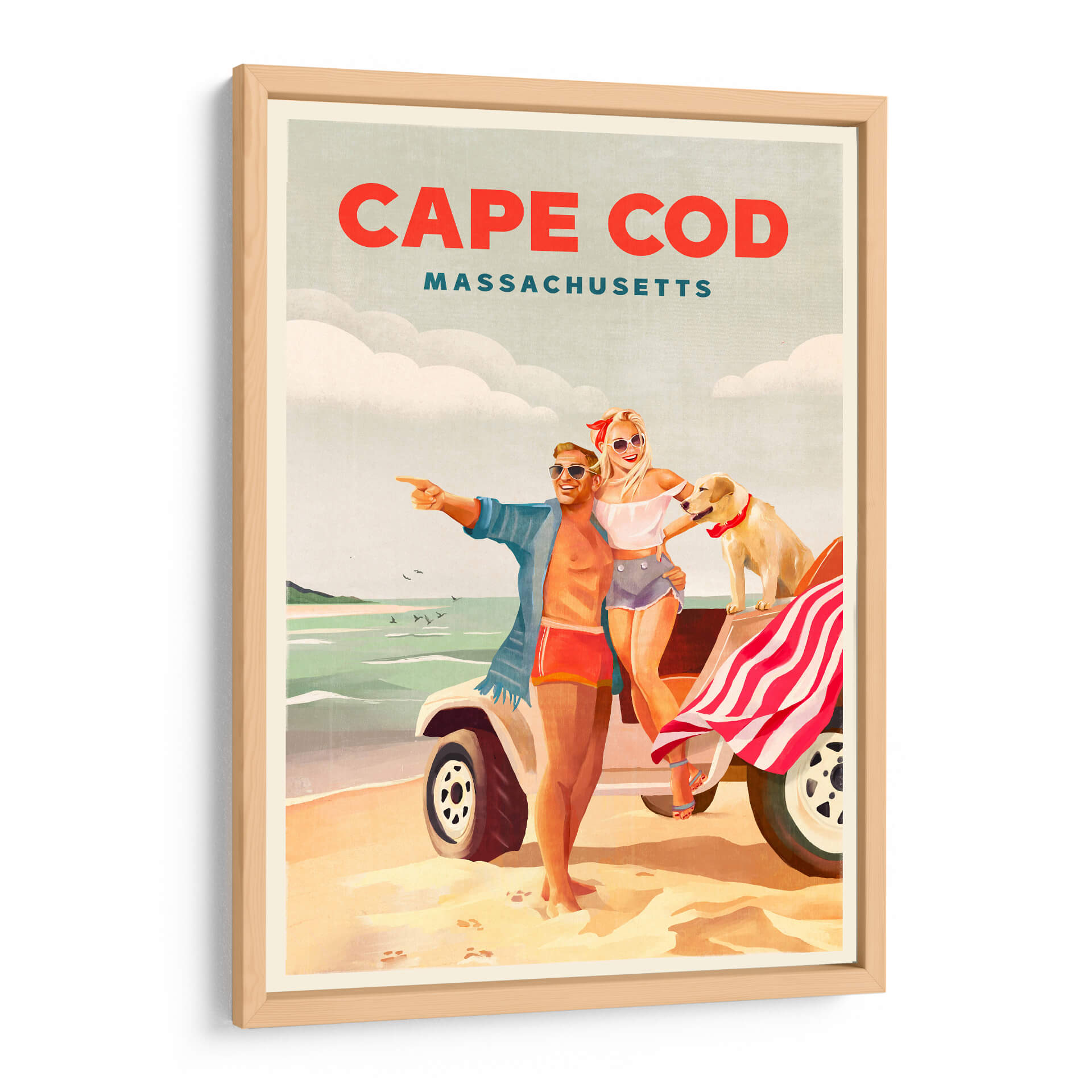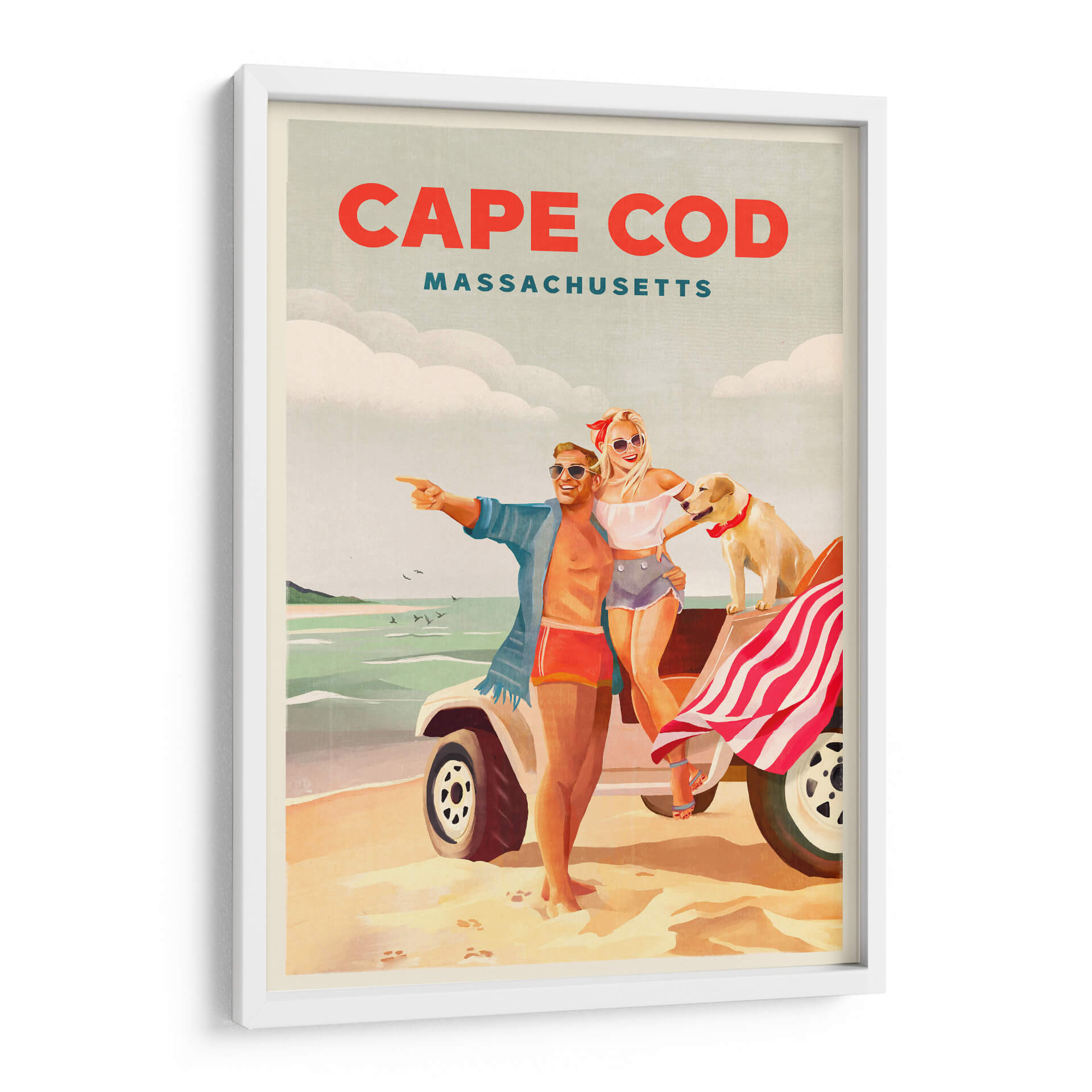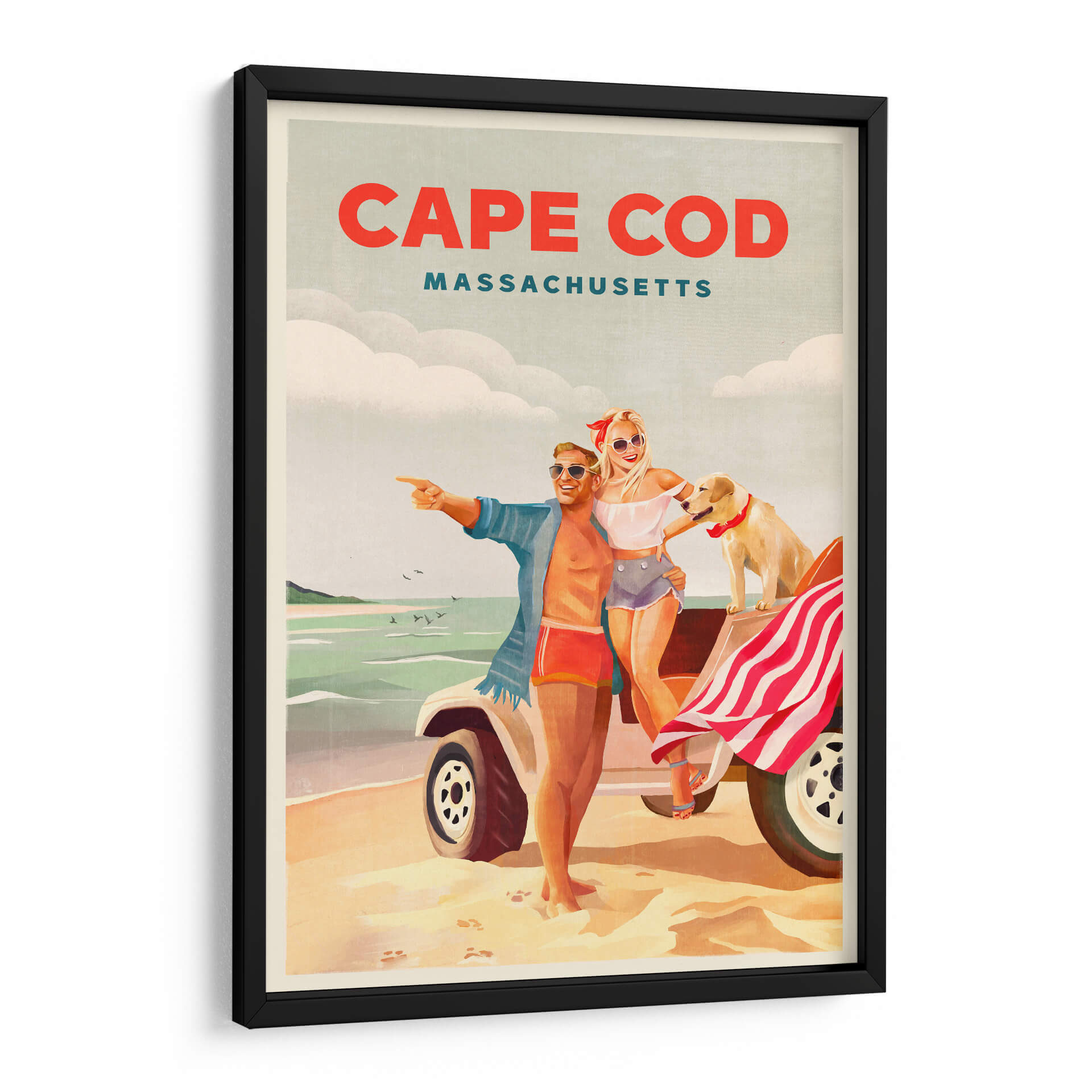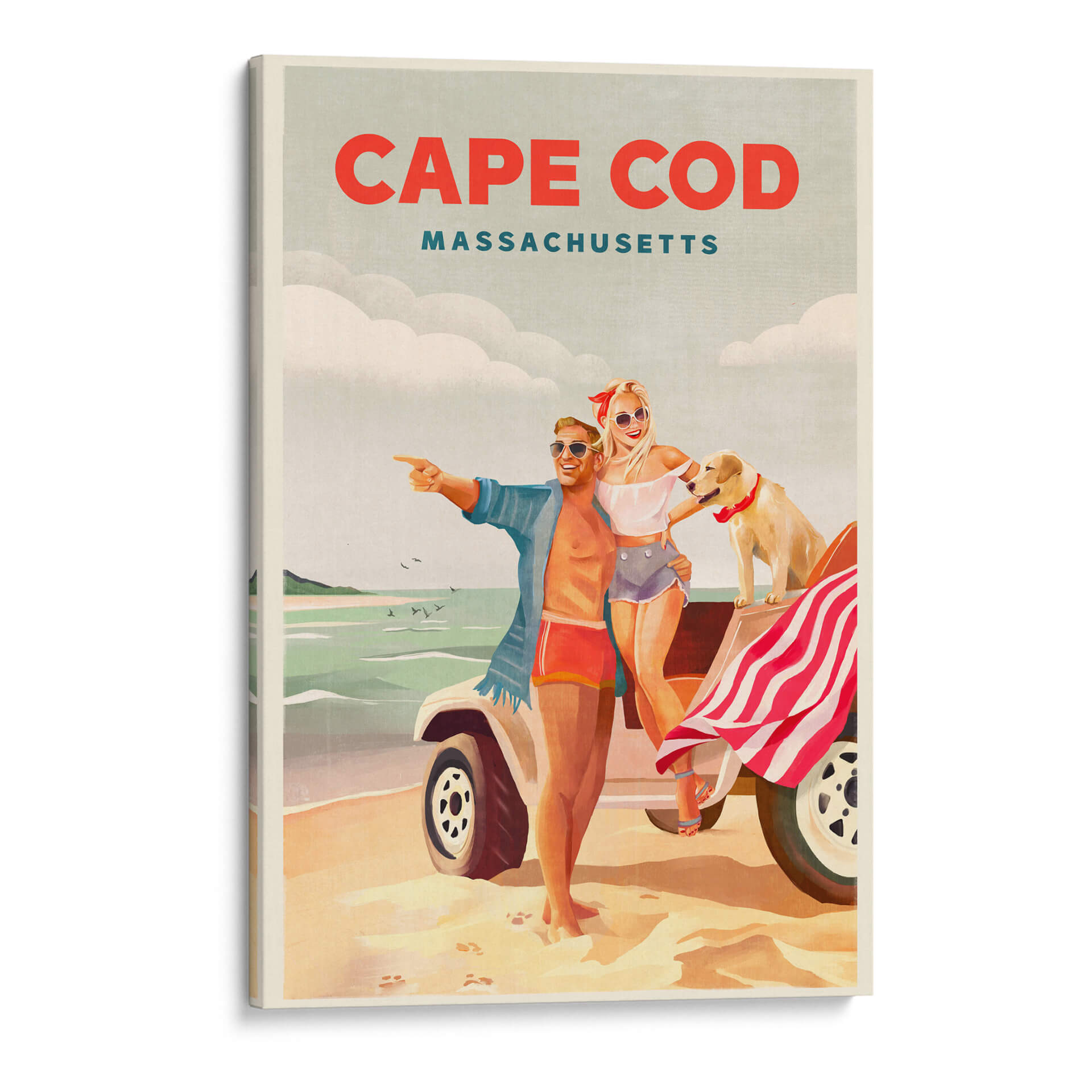 Revive la alegría y la libertad del verano con este cautivador cuadro decorativo, "Arte playero de verano en Cape Cod, Massachusetts". La obra captura un instante perfecto de felicidad veraniega, con una pareja sonriente y su fiel perro disfrutando de un día soleado en la costa. Los colores cálidos y vibrantes evocan la nostalgia de las vacaciones, mientras que la composición retro nos transporta a una época dorada. El estilo artístico, que recuerda a los carteles de viaje clásicos, añade un toque de encanto y sofisticación. Los tonos arena, mar y cielo se combinan armoniosamente para crear una atmósfera de relajación y aventura. Este cuadro decorativo es perfecto para añadir un toque de optimismo y estilo a cualquier espacio, ya sea una sala de estar, un dormitorio o una oficina. Imagina la brisa marina y la sensación de despreocupación invadiendo tu hogar con esta pieza única. Ideal para amantes de los destinos costeros, el arte vintage y las escenas llenas de vida y positividad. Transforma tu pared en una ventana a un día de ensueño en Cape Cod.