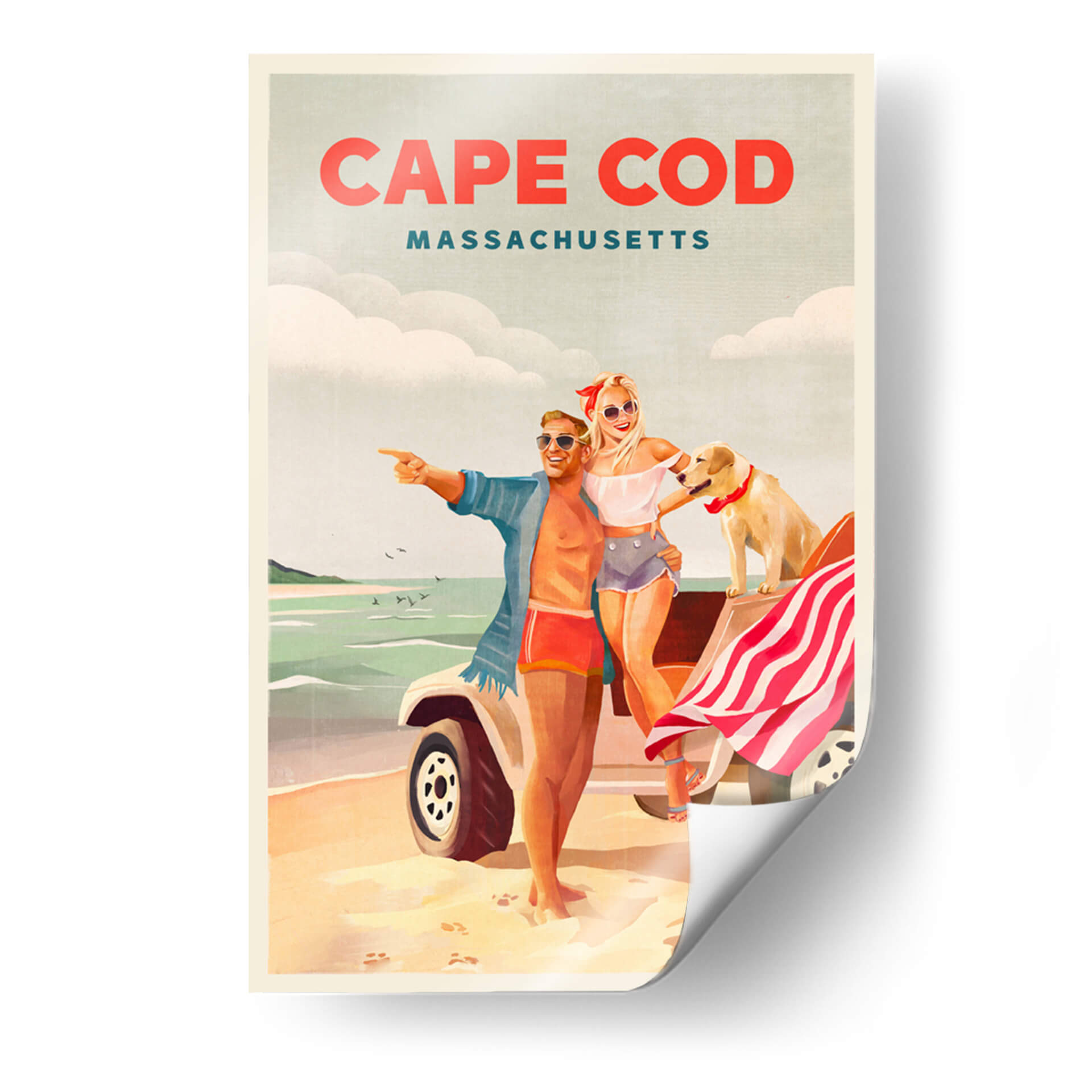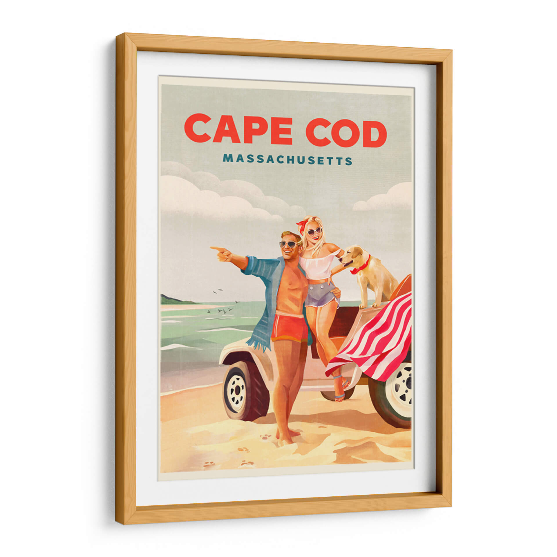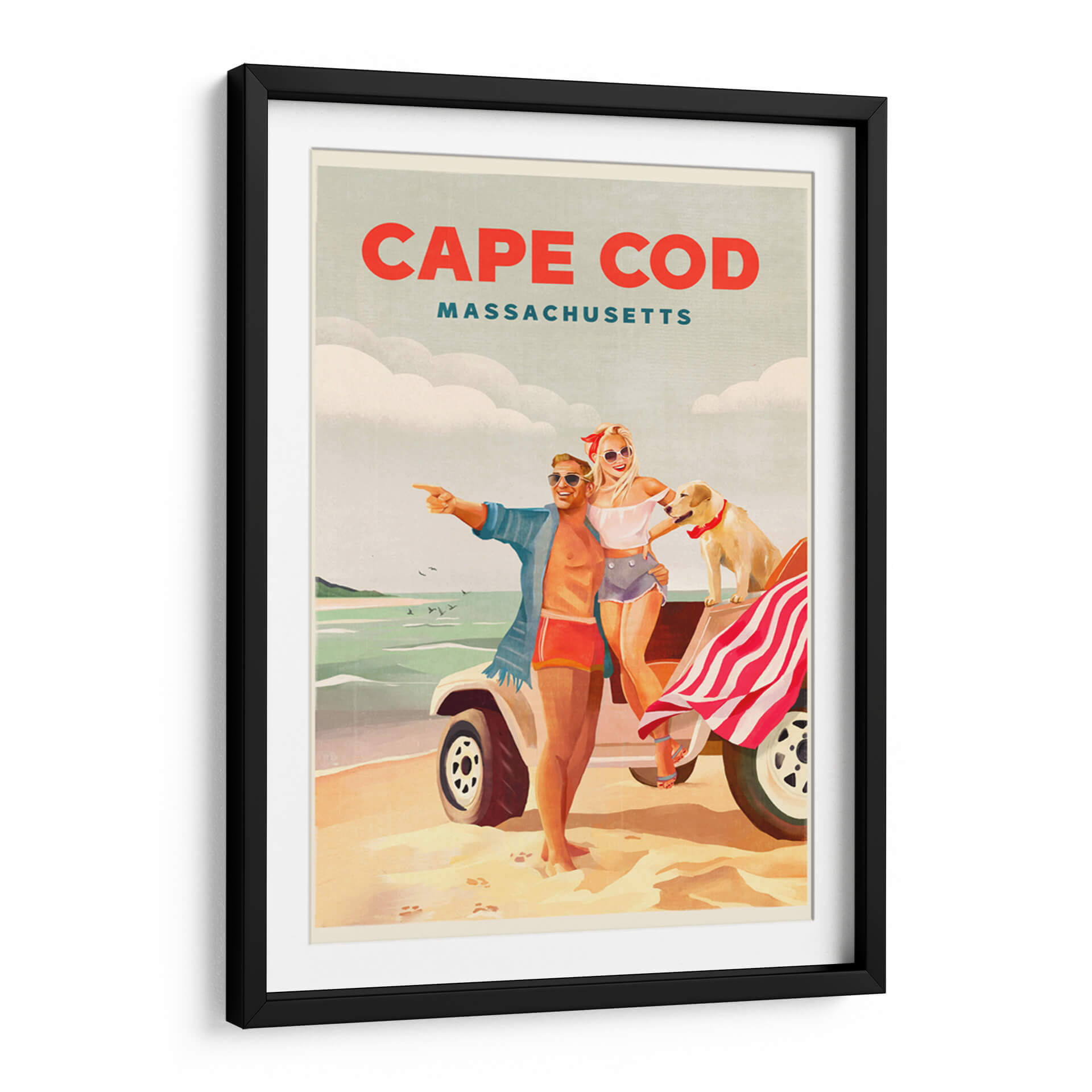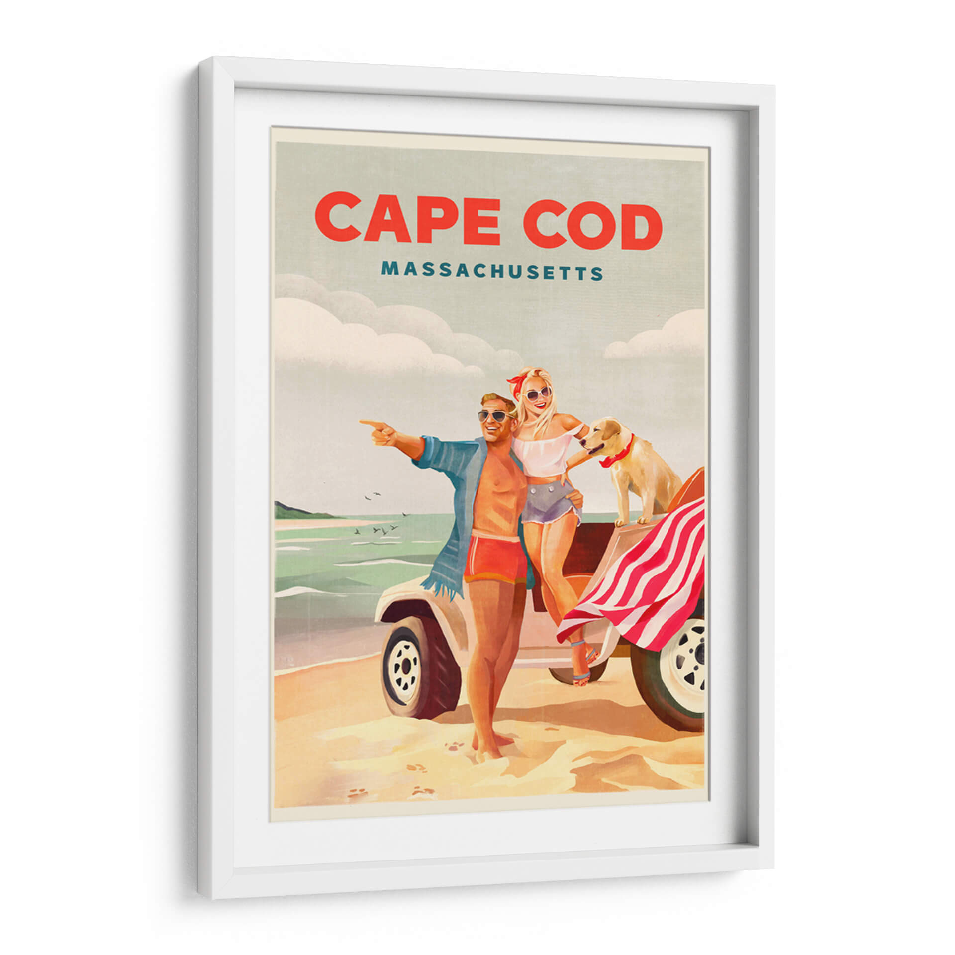 Revive la alegría y la libertad del verano con este cautivador cuadro decorativo, "Arte playero de verano en Cape Cod, Massachusetts". La obra captura un instante perfecto de felicidad veraniega, con una pareja sonriente y su fiel perro disfrutando de un día soleado en la costa. Los colores cálidos y vibrantes evocan la nostalgia de las vacaciones, mientras que la composición retro nos transporta a una época dorada. El estilo artístico, que recuerda a los carteles de viaje clásicos, añade un toque de encanto y sofisticación. Los tonos arena, mar y cielo se combinan armoniosamente para crear una atmósfera de relajación y aventura. Este cuadro decorativo es perfecto para añadir un toque de optimismo y estilo a cualquier espacio, ya sea una sala de estar, un dormitorio o una oficina. Imagina la brisa marina y la sensación de despreocupación invadiendo tu hogar con esta pieza única. Ideal para amantes de los destinos costeros, el arte vintage y las escenas llenas de vida y positividad. Transforma tu pared en una ventana a un día de ensueño en Cape Cod.